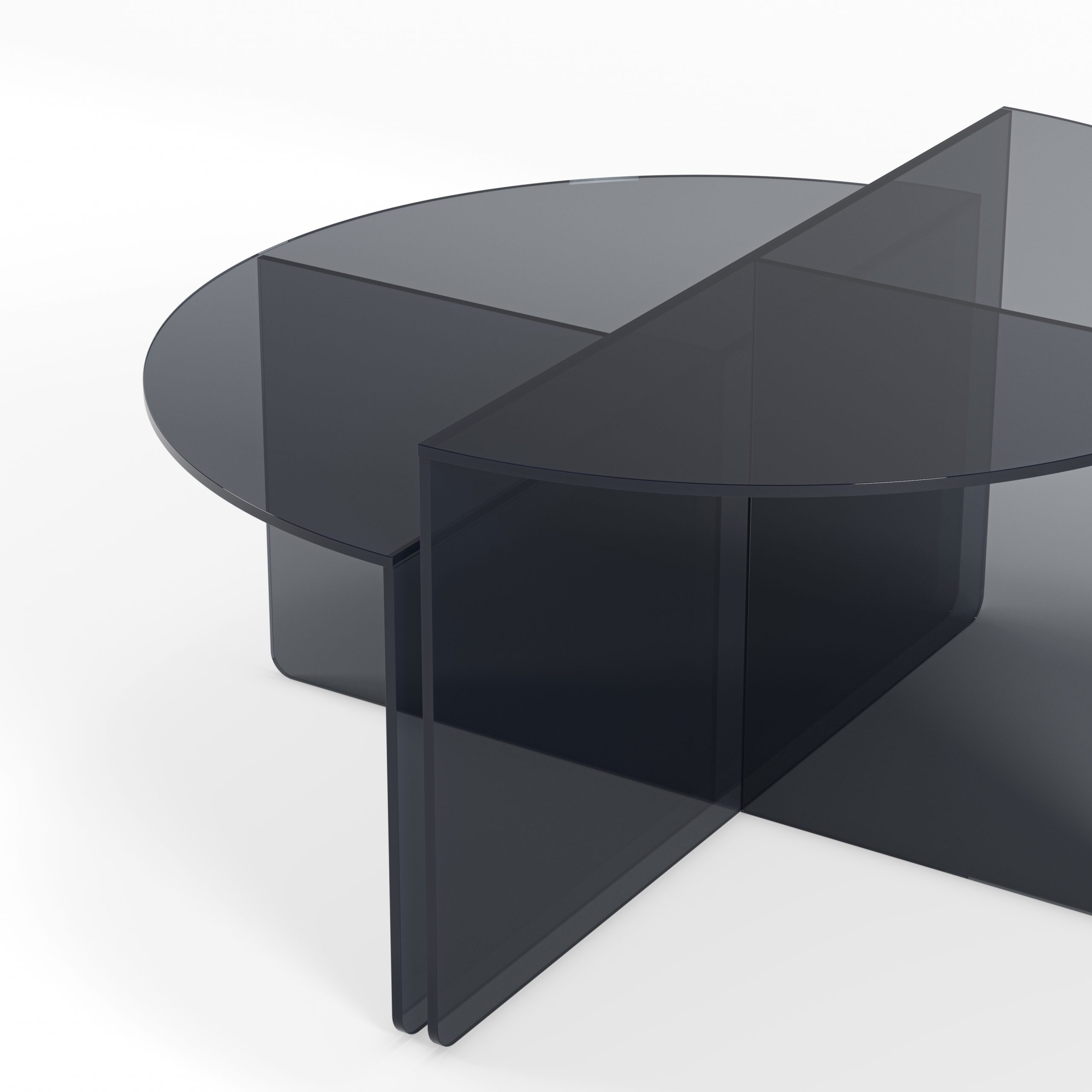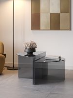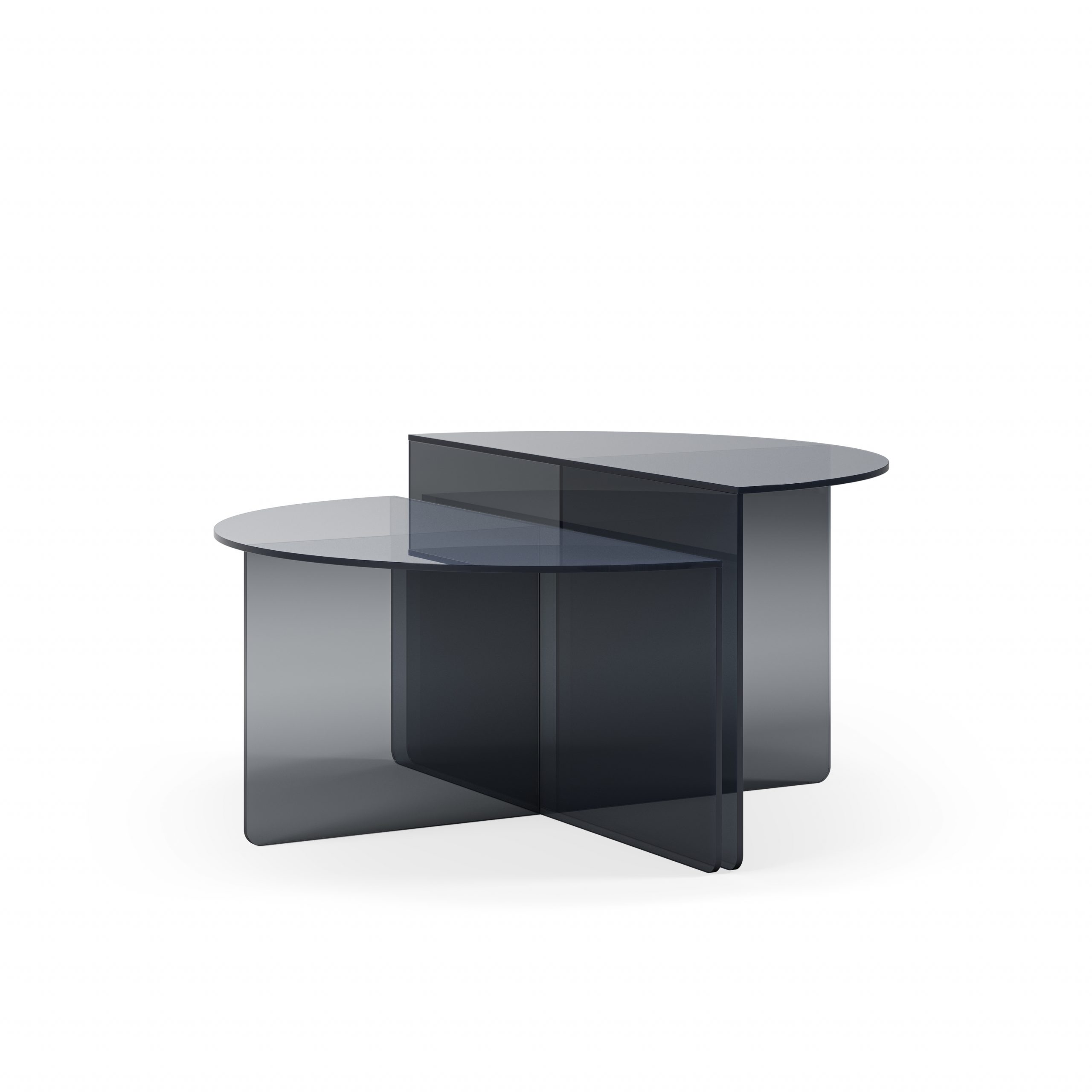 El diseño se basa en la superposición inteligente: ambas mesas tienen una silueta de media luna o semicircular, permitiendo que se utilicen juntas como una mesa redonda escalonada o separadas. La clave de esta colección es el material y el color: el cristal templado presenta un elegante acabado, que añade una pincelación de color sutil sin perder la ligereza visual de la transparencia.