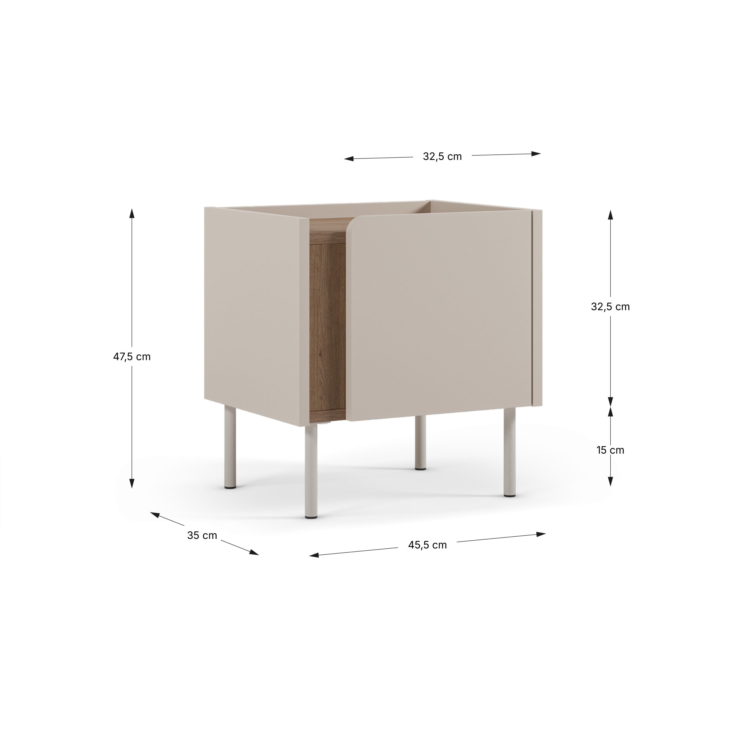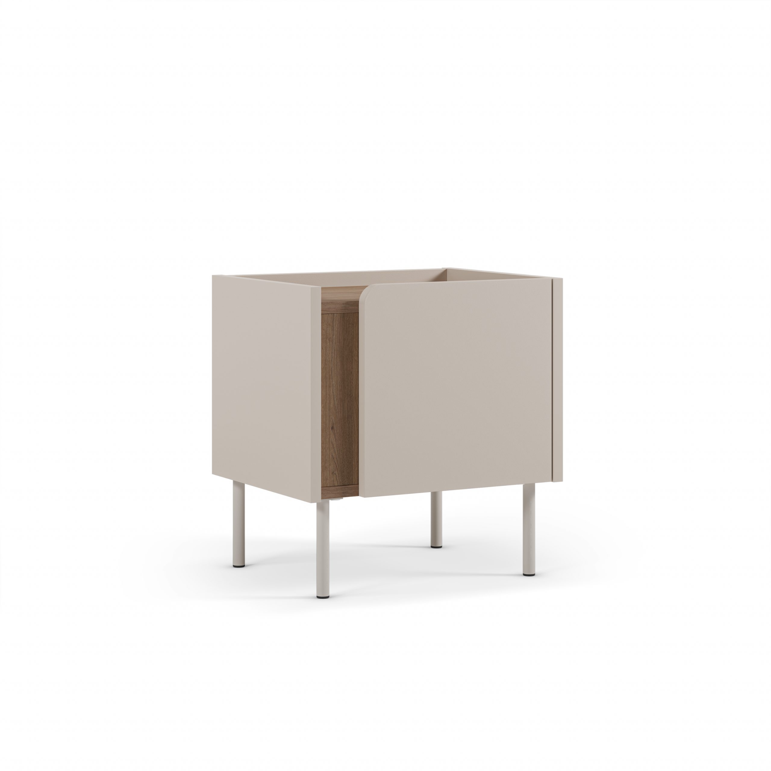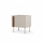 El diseño se define por su estilo minimalista y escandinavo/contemporáneo. La mesita presenta un cuerpo compacto con un compartimento de almacenamiento, que podría ser un nicho abierto o un pequeño espacio de almacenamiento. El acabado exterior es en un crema, contrastando con un interior o nicho en acabado roble, lo que le añade calidez y un sutil contraste de texturas.