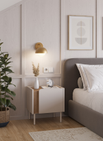 Esta mesita de noche combina la funcionalidad moderna con una estética limpia y despojada, ideal para dormitorios que buscan optimizar el espacio con estilo. Su estructura principal está fabricada en melamina de alta calidad, un material resistente a los arañazos y de fácil mantenimiento. El cuerpo se eleva sobre patas metálicas finas, aportando ligereza visual y facilitando la limpieza del suelo.