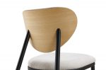 Esta silla de comedor tapizada combina diseño contemporáneo y calidez natural para crear un ambiente sofisticado y acogedor. Su respaldo con trasera en madera laminada color roble aporta un toque orgánico y visualmente ligero, mientras que su estructura de patas metálicas soldada en una sola pieza ofrece máxima estabilidad y resistencia, con un acabado en negro mate que añade carácter y modernidad.