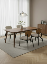 El asiento tapizado en tejido suave y resistente proporciona una comodidad superior, ideal para largas sobremesas o reuniones familiares. Disponible en varios colores para adaptarse a distintos estilos decorativos, desde espacios nórdicos hasta tendencias más industriales o minimalistas.