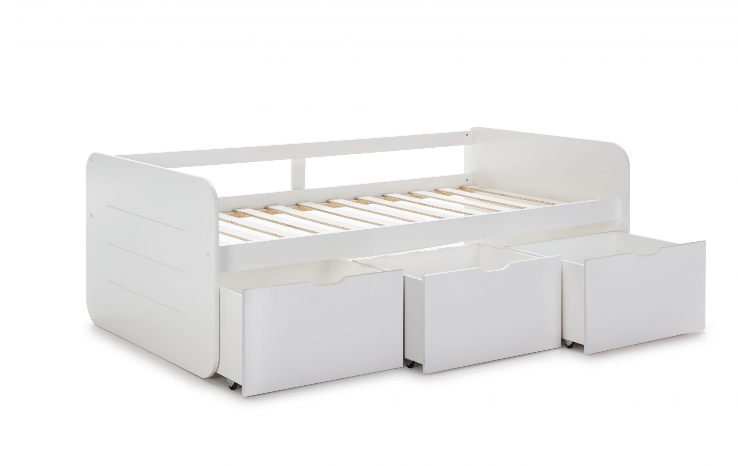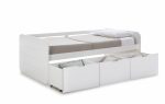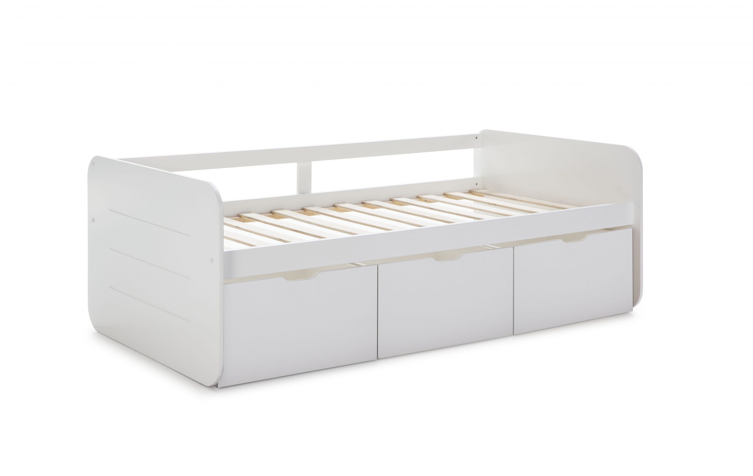 Esta práctica cama infantil con cajones inferiores es la solución perfecta para aprovechar el espacio en dormitorios pequeños. Fabricada en DM lacado en blanco, ofrece un diseño limpio, moderno y muy funcional, ideal para crear un ambiente calmado y ordenado.