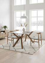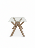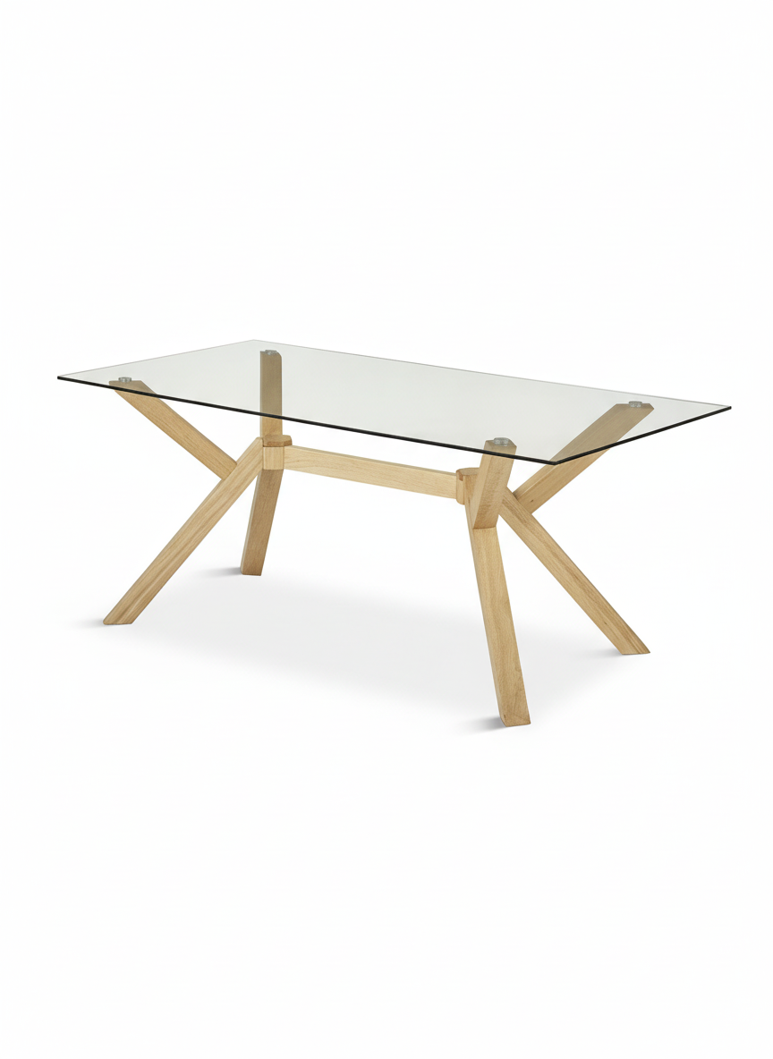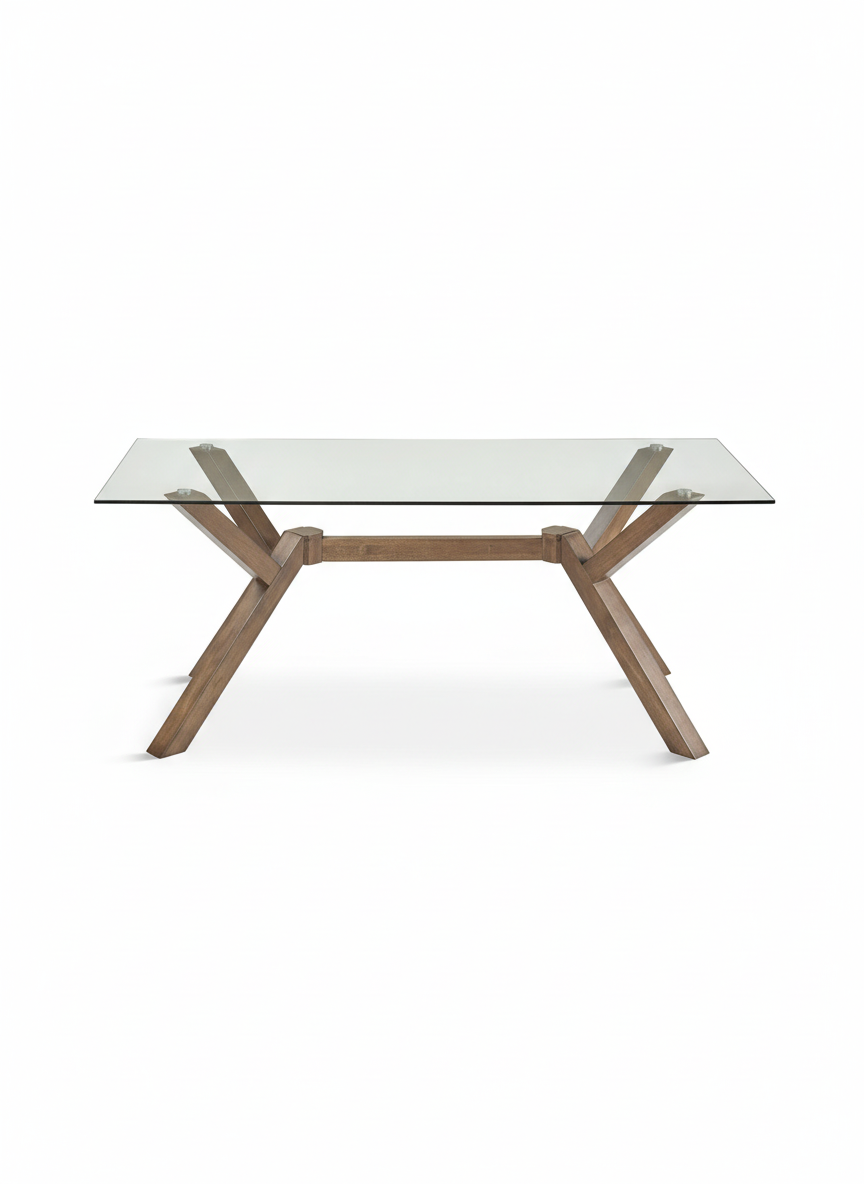 La mesa de comedor ARKO es una pieza de diseño contemporáneo que combina elegancia, funcionalidad y carácter. Destaca por su estructura geométrica con patas cruzadas en madera, que aportan estabilidad y un estilo moderno muy sofisticado, mientras que su sobre de cristal crea una sensación visual ligera y amplia, perfecta para cualquier comedor actual.