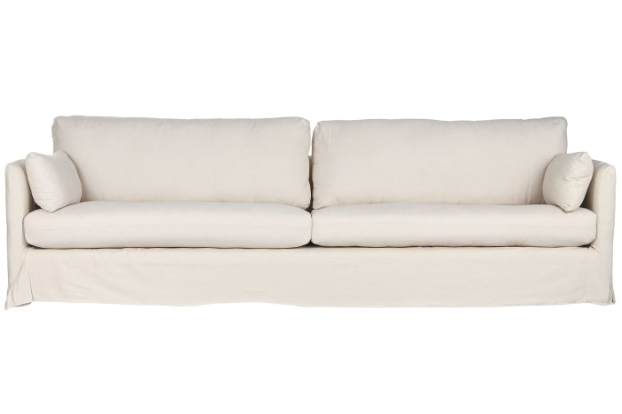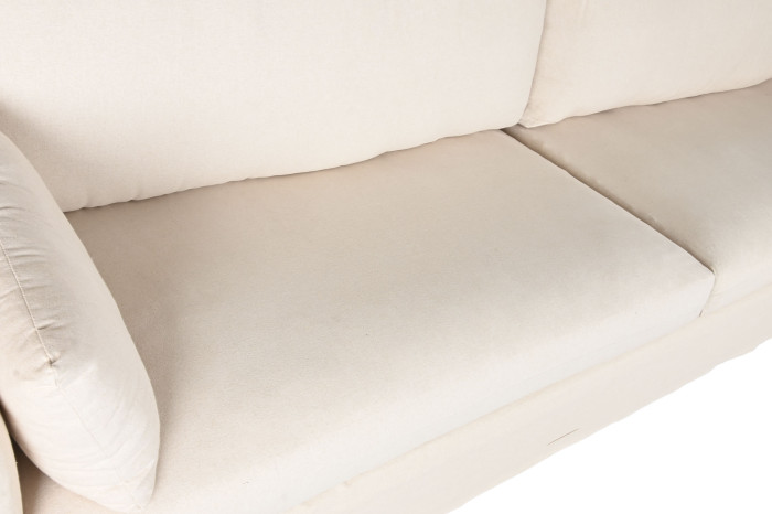 El sofá Aure de 270 cm destaca por su estética relajada, sofisticada y absolutamente actual, inspirado en los interiores mediterráneos y en el estilo slow living. Su tapizado en lino y algodón en tono blanco crema aporta una textura suave, ligera y natural, creando un ambiente cálido y armonioso en cualquier salón.