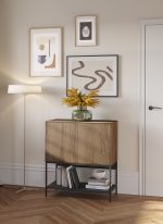 El mueble se apoya sobre una base metálica en color negro de líneas finas y minimalistas, que aporta ligereza visual y estabilidad. Su distribución interior ofrece espacio cerrado para almacenamiento discreto, ideal para mantener ordenados libros, vajilla, textiles o cualquier objeto cotidiano. Además, incluye una balda inferior abierta perfecta para incorporar elementos decorativos o de uso frecuente.