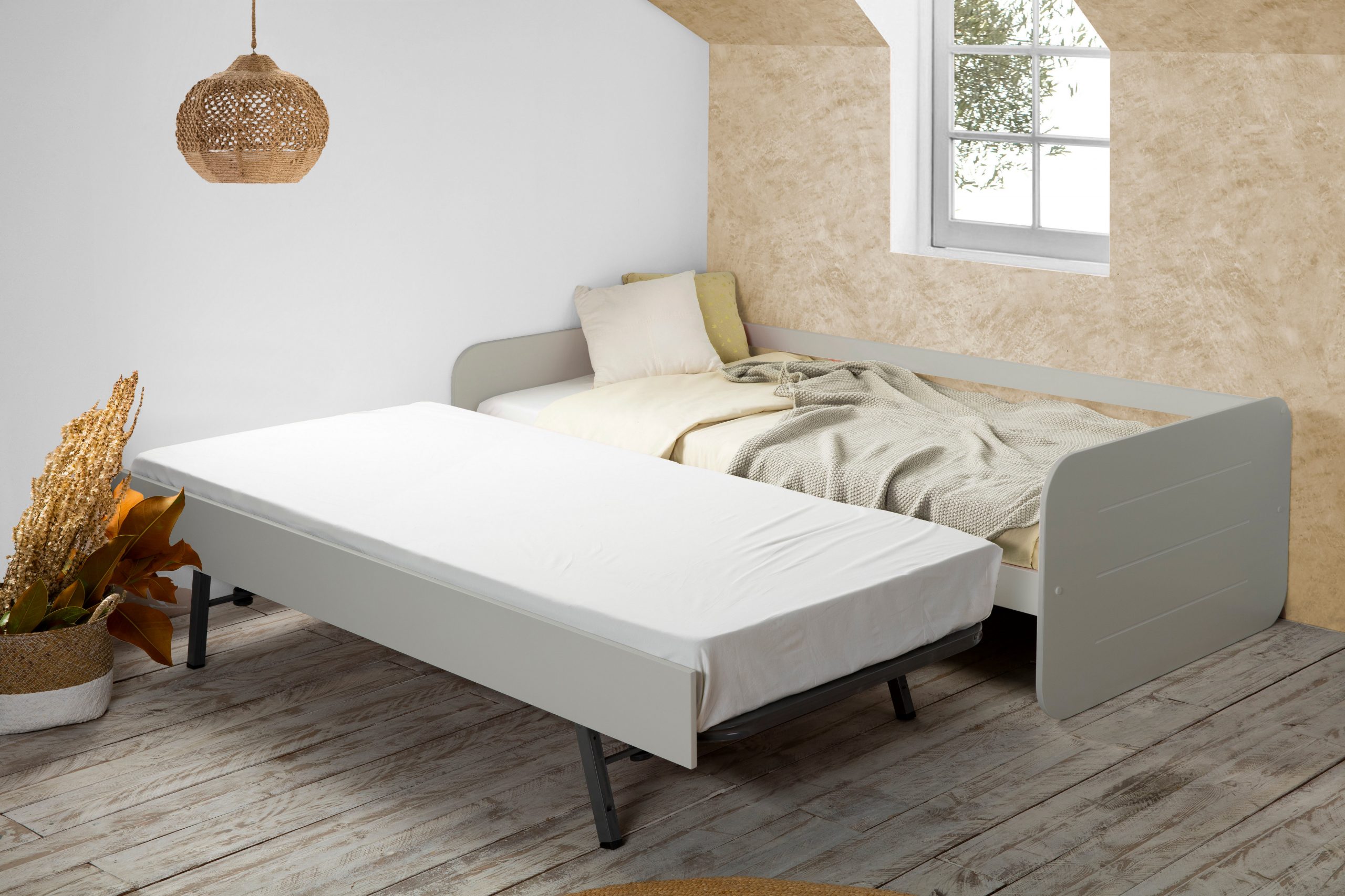 Perfecta para habitaciones pequeñas o estudios, esta cama nido convierte un espacio individual en uno doble en segundos. Durante el día, funciona como un cómodo sofá; por la noche, el somier extraíble facilita una segunda cama para invitados. Es la opción más práctica para conseguir un descanso doble con una estética impecable y materiales duraderos.