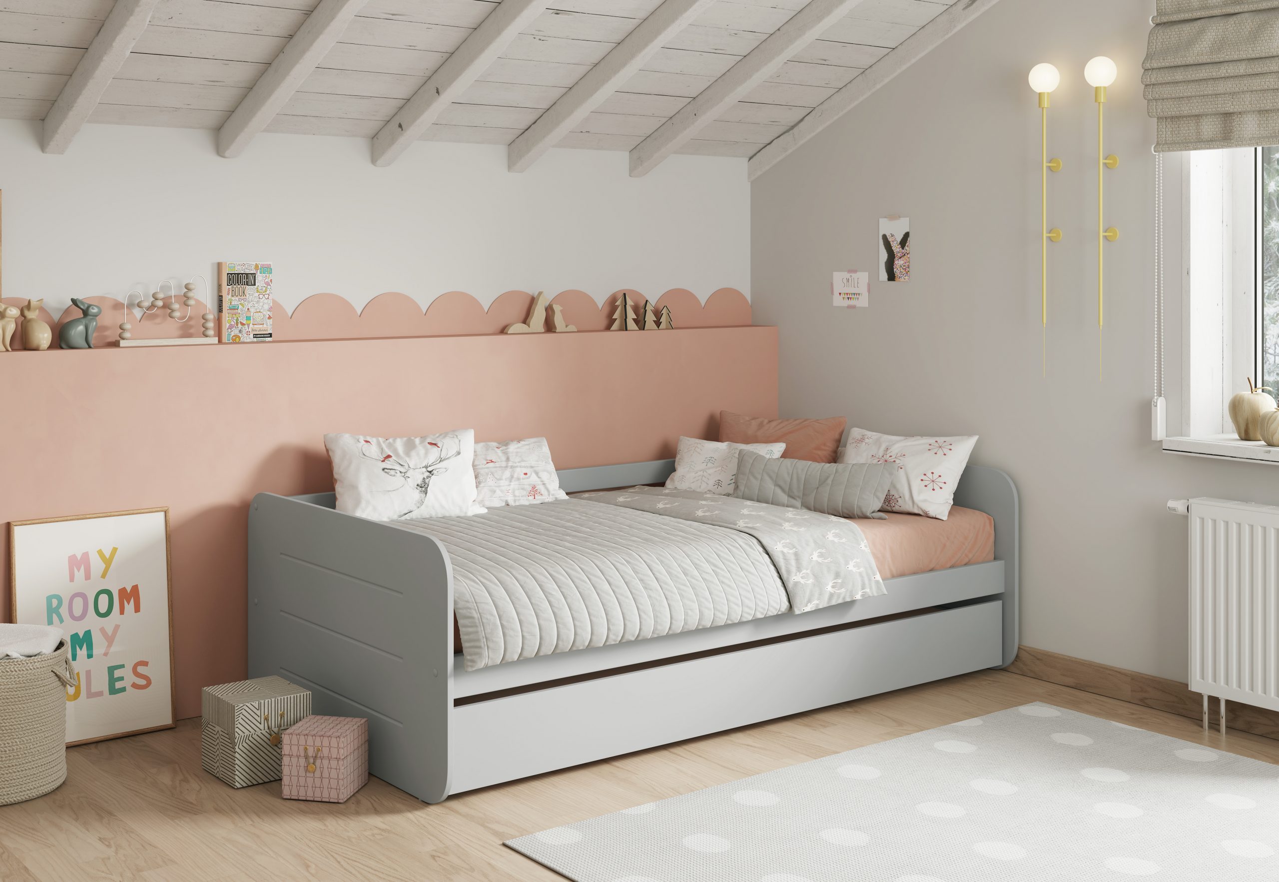 Esta Cama Nido de 90 cm es la solución ideal para optimizar el espacio, ofreciendo la funcionalidad de dos camas. Su diseño minimalista y moderno, con líneas suaves y cabeceros redondeados, se integra a la perfección en cualquier dormitorio juvenil o habitación de invitados, aportando un toque de calma y sofisticación.