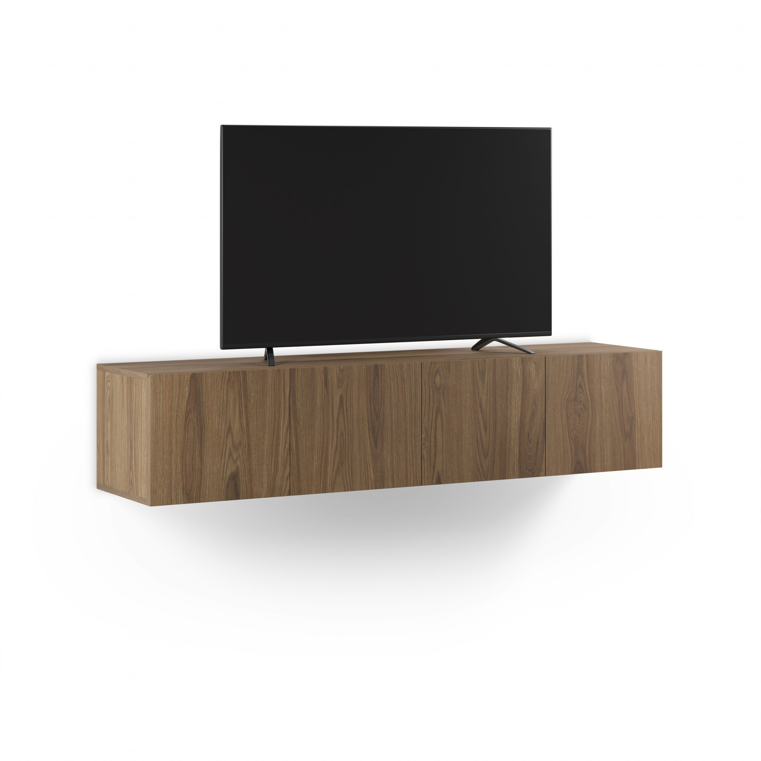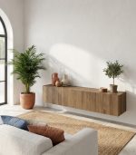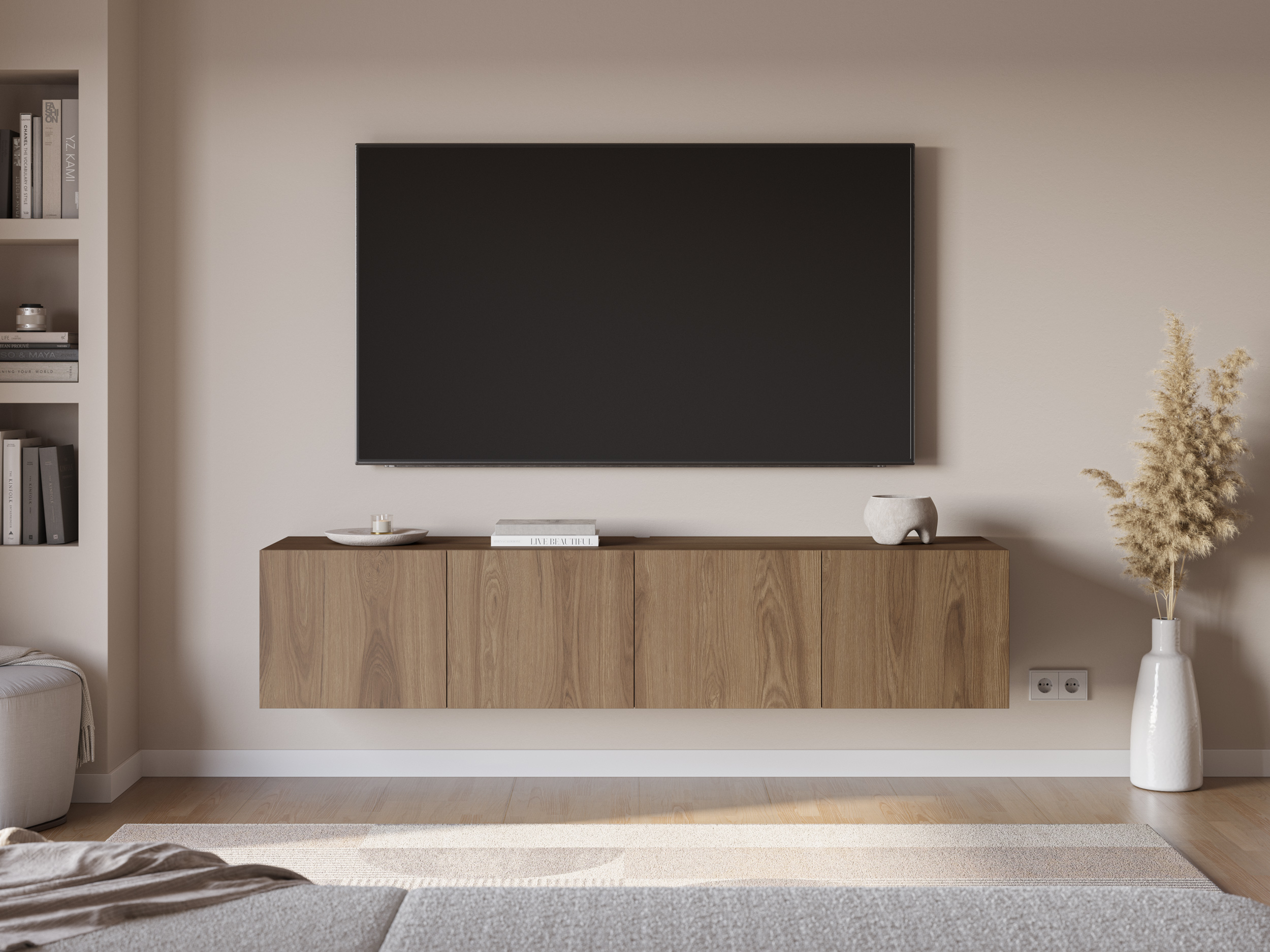 Este mueble de TV suspendido destaca por su diseño minimalista y elegante, pensado para aportar ligereza visual y una sensación de orden en el espacio. Su estructura flotante, instalada en pared, permite liberar superficie en el suelo y crea un ambiente moderno y despejado, ideal para salones actuales.