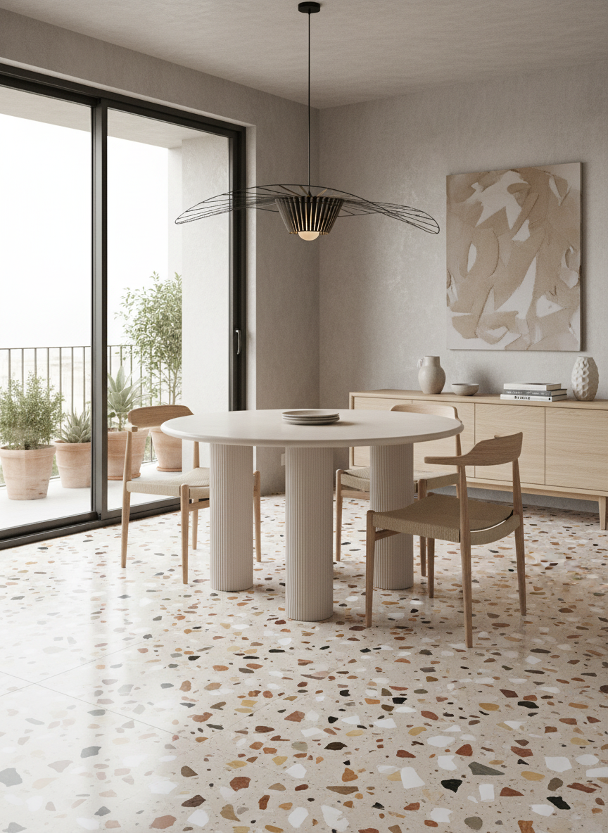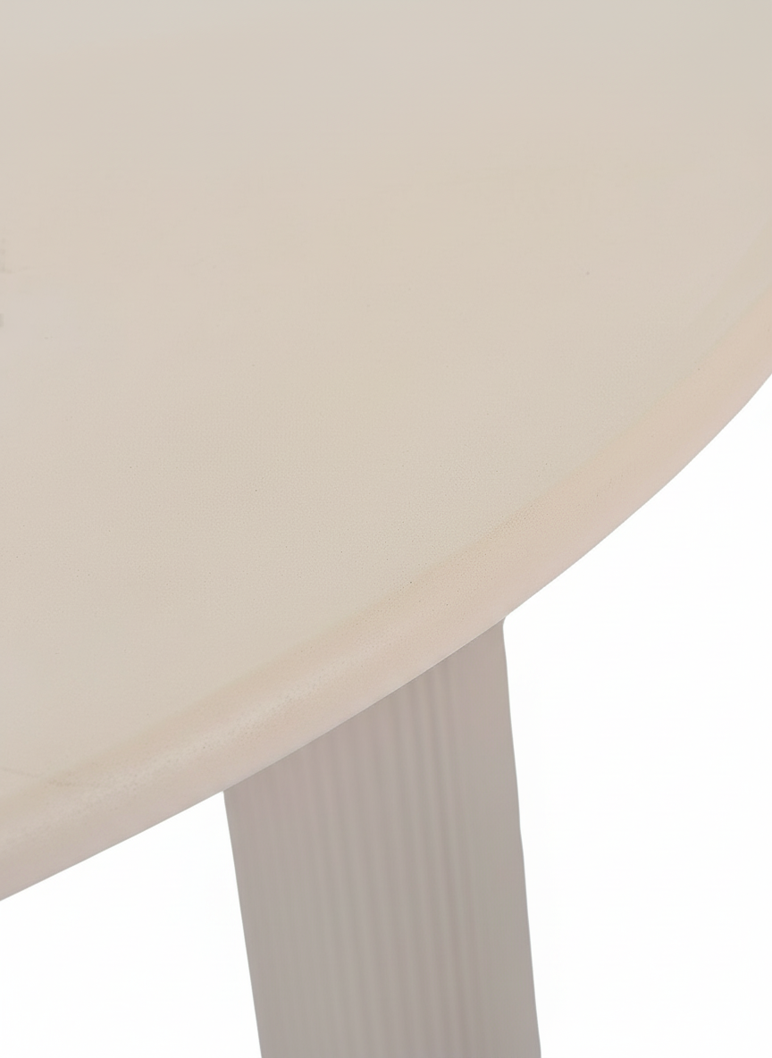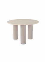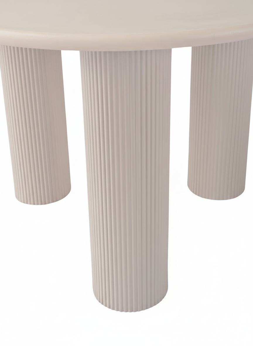 Destaca por su base de tres columnas cilíndricas estriadas, que aportan carácter escultórico y una estabilidad excepcional, convirtiendo la mesa en un verdadero punto focal del espacio. Su acabado tipo cemento en tono claro transmite sobriedad, modernidad y versatilidad, integrándose fácilmente con distintos estilos decorativos.