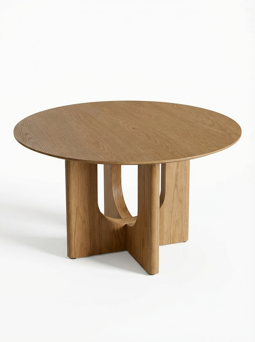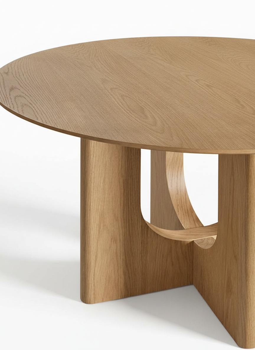 Fabricada en chapa de nogal, ofrece un acabado cálido y sofisticado, con vetas naturales que realzan la belleza de la madera y aportan un toque exclusivo. Su base central de líneas curvas y sólidas no solo garantiza una excelente estabilidad, sino que también añade un carácter arquitectónico y contemporáneo al conjunto.
