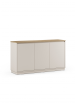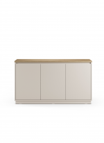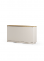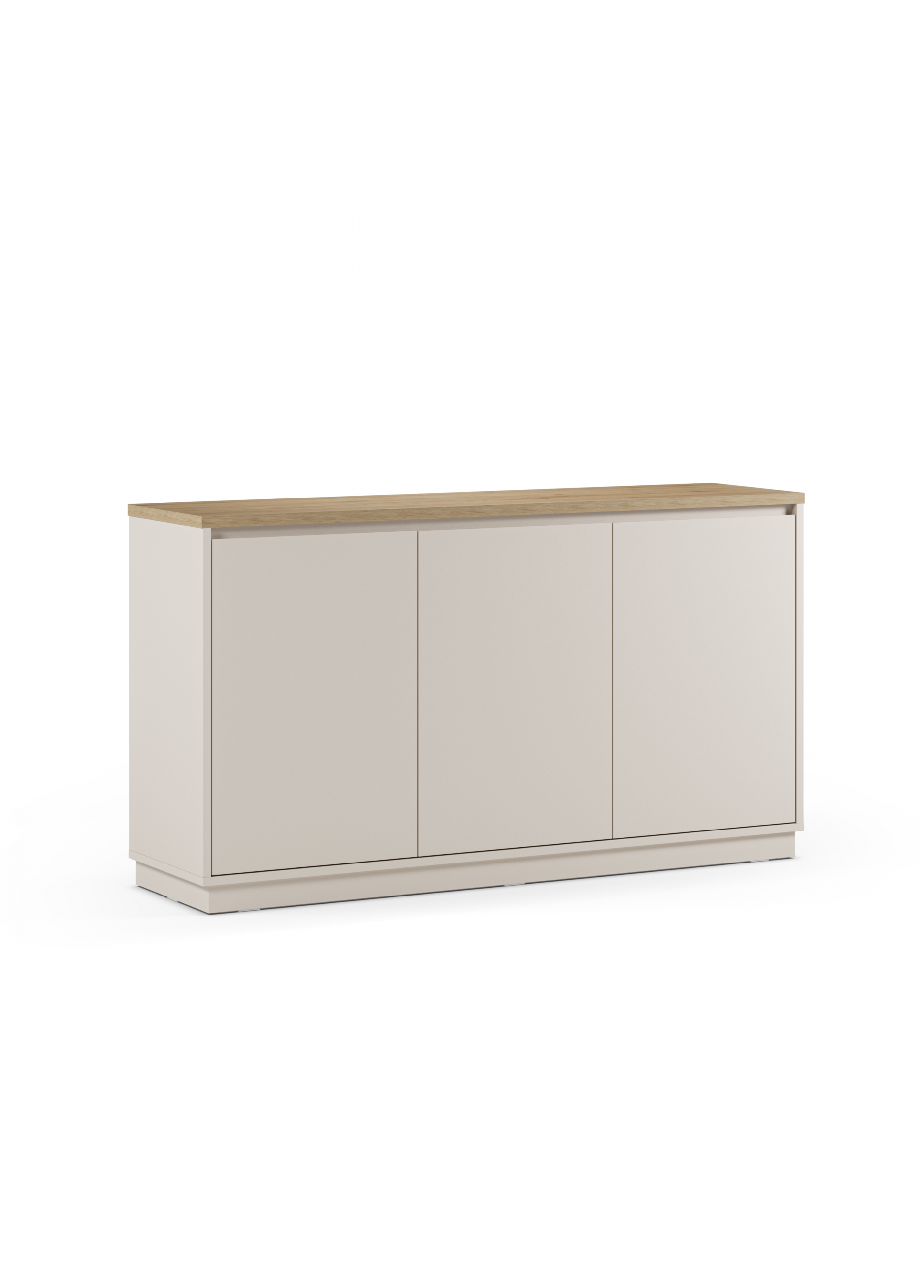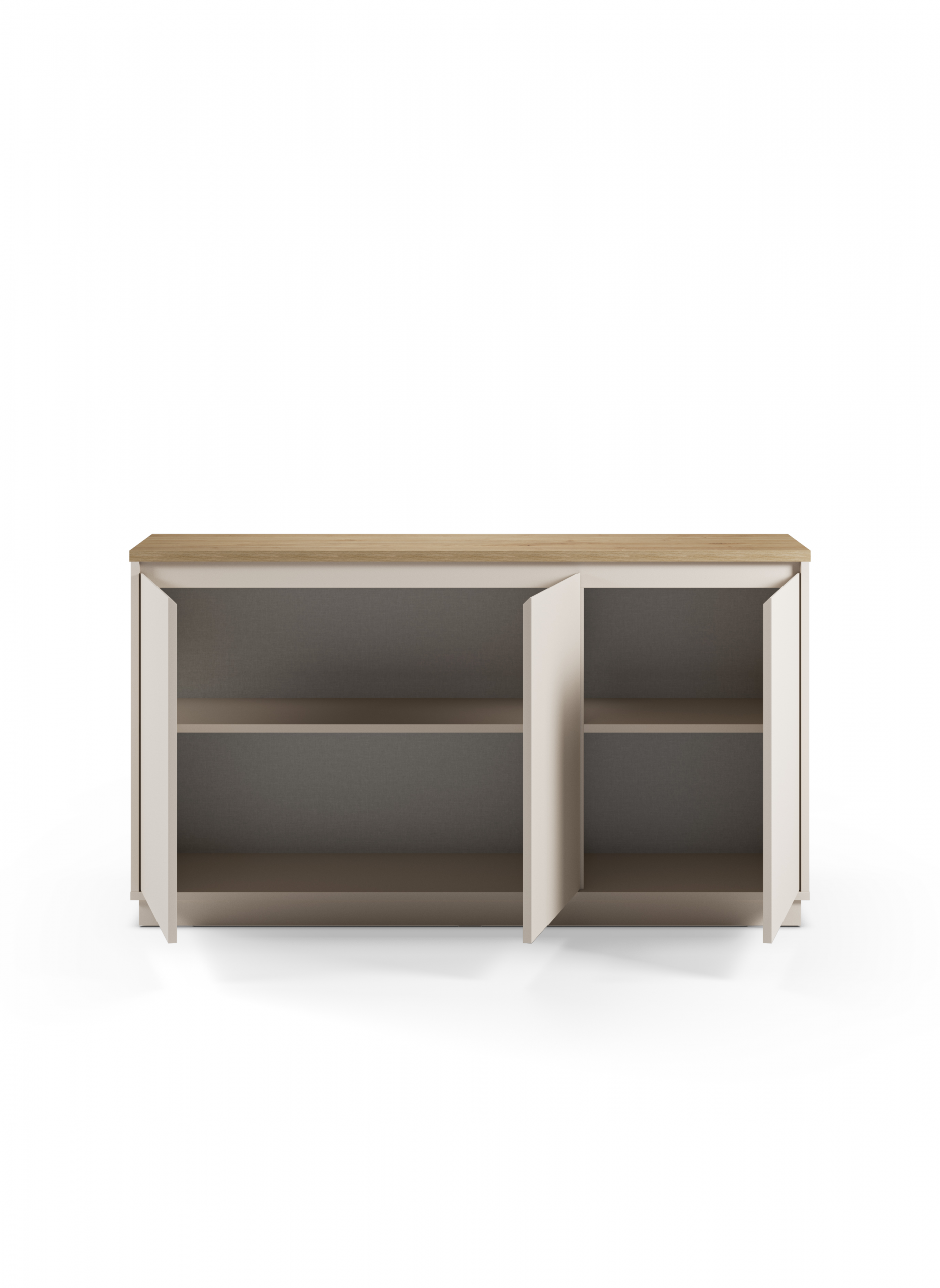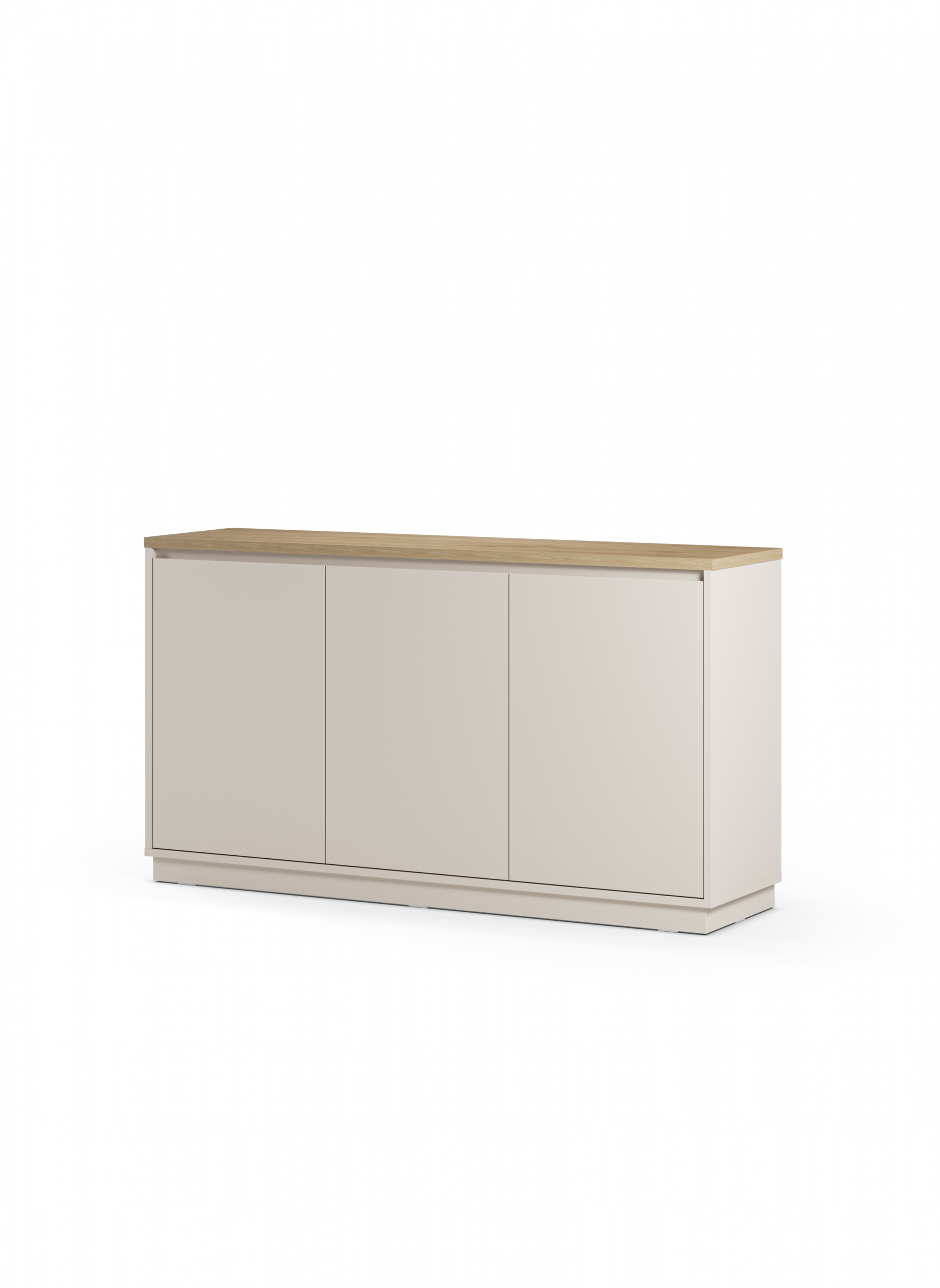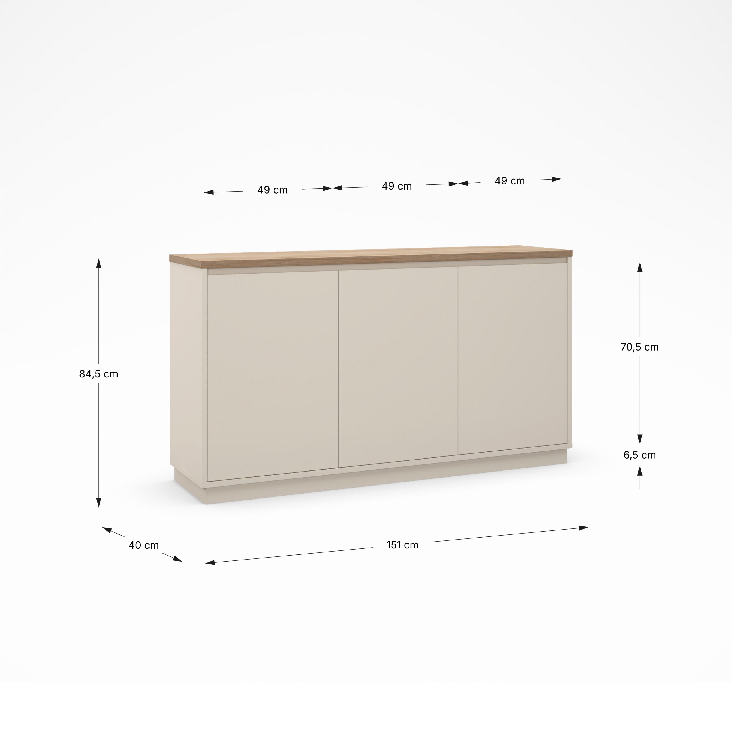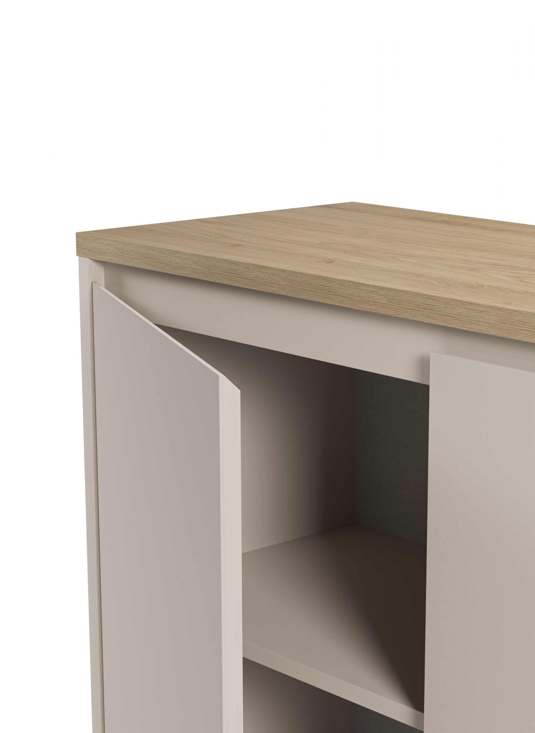 El diseño se basa en una distribución de puertas sin tiradores visibles,, manteniendo la pureza de sus formas. El acabado principal es en un tono vison, que aporta calidez y un estilo nórdico, contrastando sutilmente con una tapa superior de roble, que añade un toque de sofisticación.