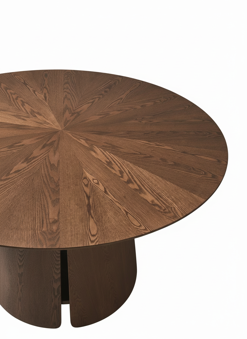 Esta mesa de comedor es una pieza de diseño que se basa en la tendencia minimalista y escultural, perfecta para crear un punto focal sofisticado y funcional en cualquier comedor. La tapa redonda y elegante está acabada en chapa de roble de alta calidad, con una veta a menudo dispuesta en un patrón radial que añade un detalle visual sutil pero cautivador.
