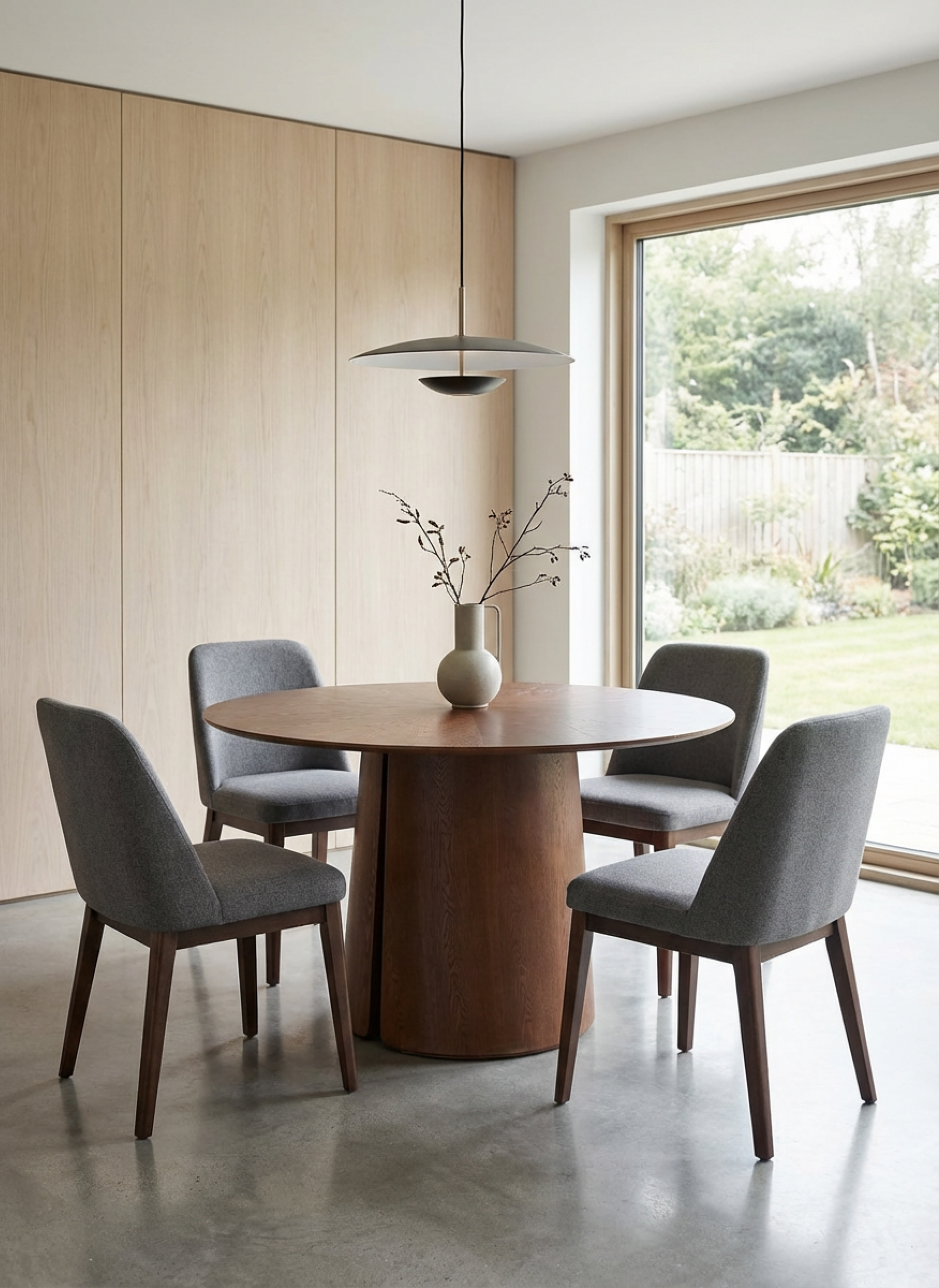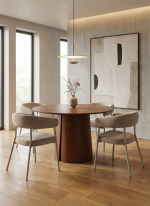 Con un ancho de 120 cm, esta mesa redonda es ideal para comedores medianos, facilitando la interacción y acomodando cómodamente a 4 o 5 comensales.