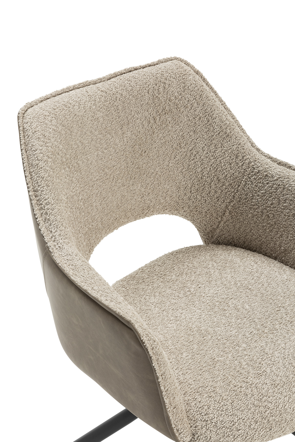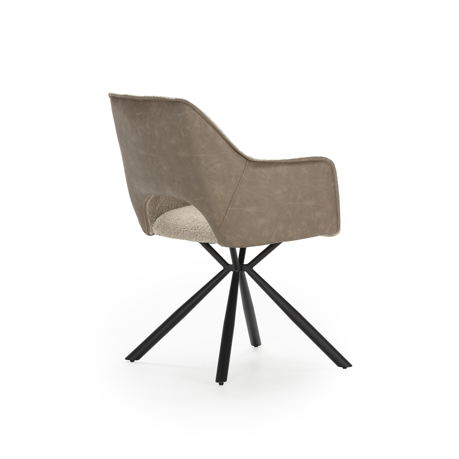 Esta silla sillón se distingue por su diseño envolvente y contemporáneo, que ofrece el máximo confort sin sacrificar el estilo moderno. El tapizado interno presenta una rica textura tipo bouclé o borreguito en tonos claros y neutros, mientras que la parte trasera está elegantemente revestida con un material de aspecto de cuero en un tono marrón topo, creando un atractivo contraste de materiales y texturas. La base es una robusta estructura de metal negro con diseño de araña, aportando un toque industrial y asegurando estabilidad.