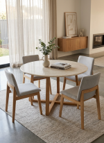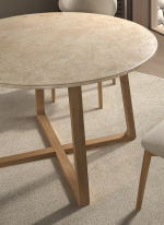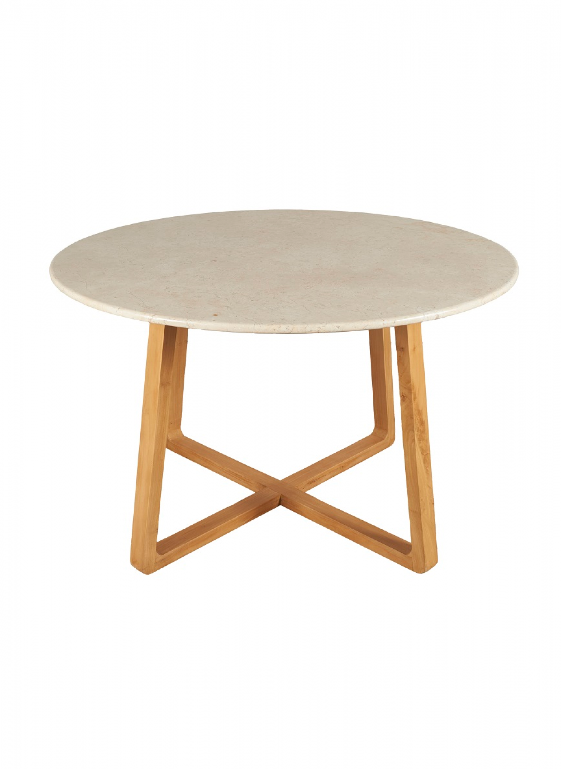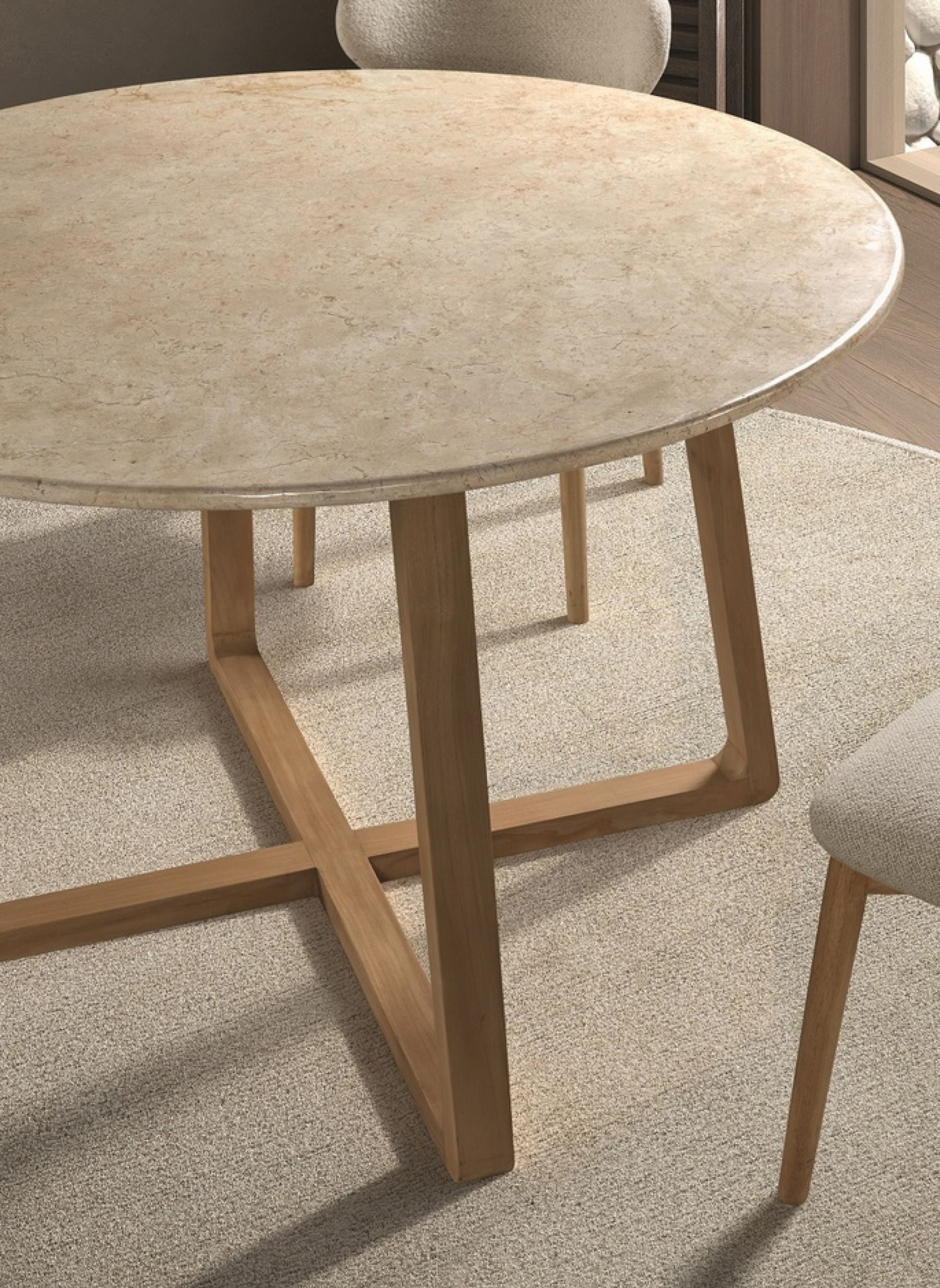 El contraste visual y la estabilidad se logran con la base geométrica de madera maciza. La base, de líneas limpias y ángulos suaves, se une en una estructura de cruz o marco cuadrado, garantizando una solidez excepcional. El color de la madera clara complementa perfectamente los tonos suaves del mármol, creando una estética que se sitúa entre el lujo silencioso y el estilo nórdico.