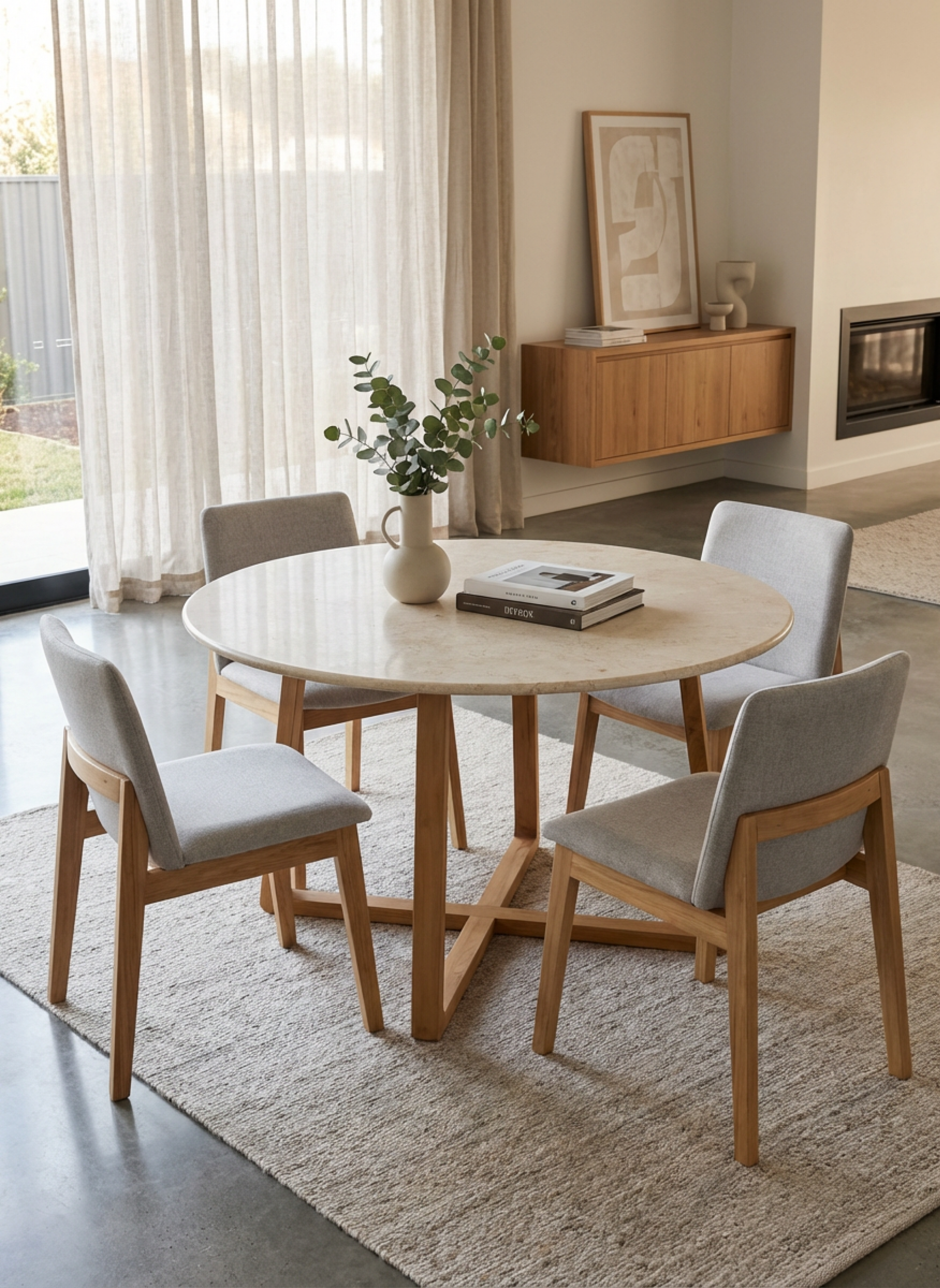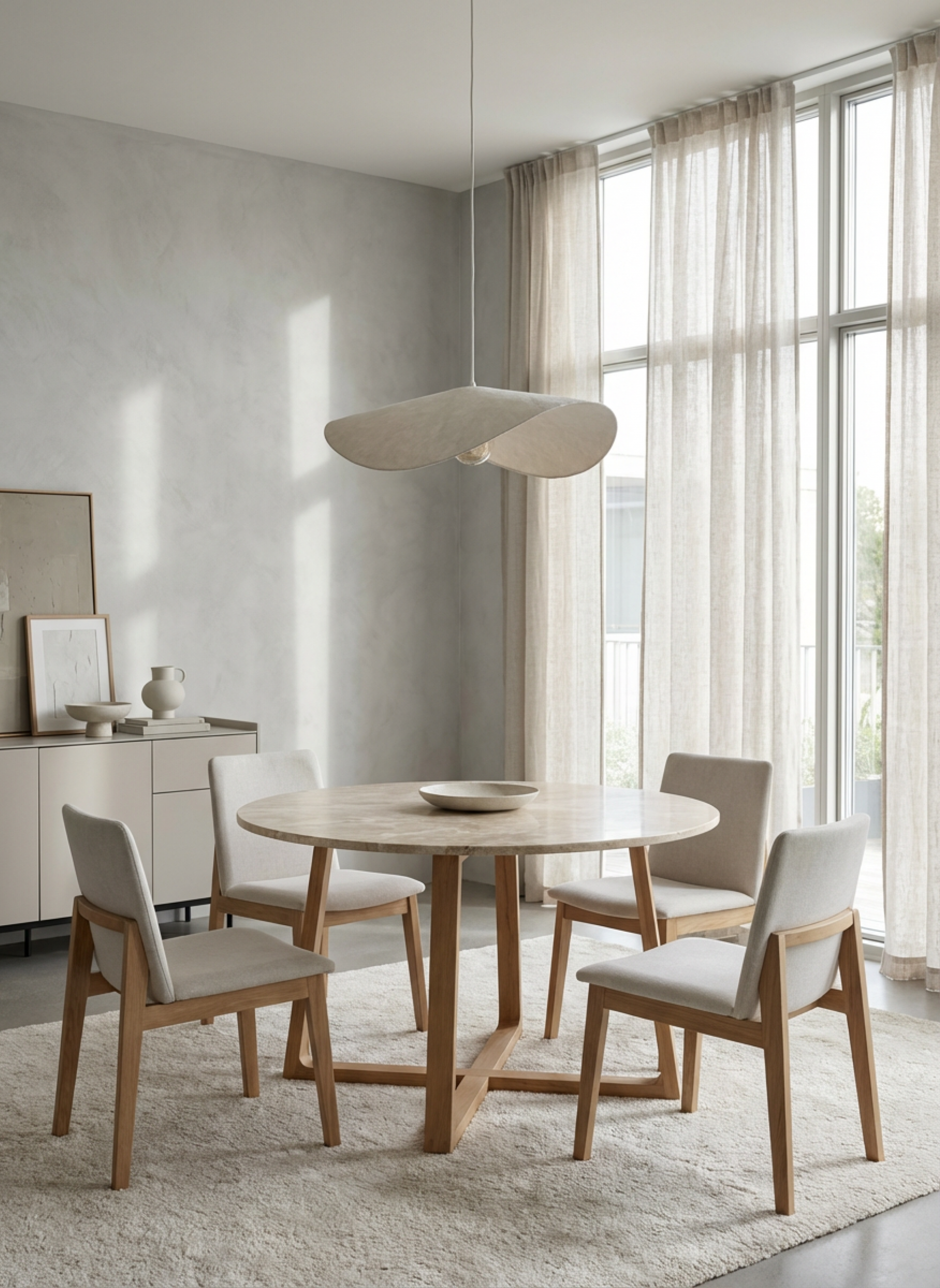 Con un ancho de 120 cm, esta mesa redonda es ideal para comedores medianos o como pieza central en espacios abiertos, acomodando cómodamente a 4 o 5 comensales. La forma redonda optimiza el espacio y facilita la interacción. La Mesa Gina es perfecta para ambientes contemporáneos, Japandi o cualquier decoración que valore la belleza de los materiales naturales.