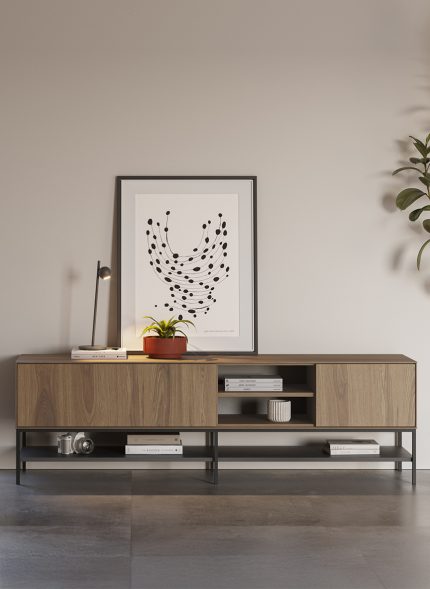 Este aparador en melamina acabado roble destaca por su diseño contemporáneo y elegante, combinando líneas minimalistas con una textura cálida y natural. Su estructura elevada sobre patas metálicas negras aporta ligereza visual y un aire sofisticado que encaja a la perfección en salones, comedores y espacios modernos de estilo industrial, nórdico o urbano.