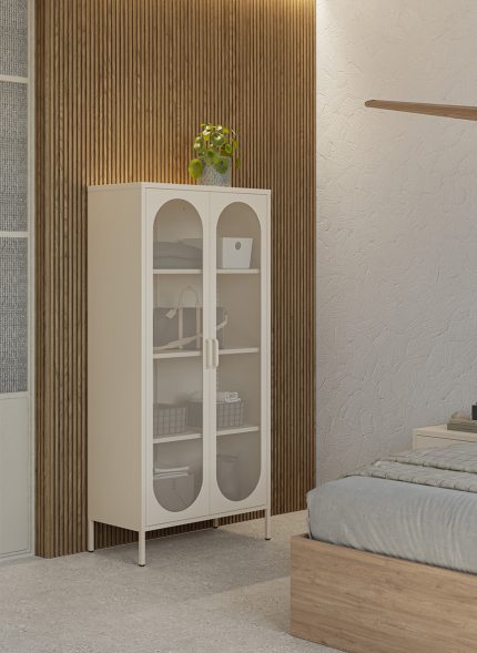 Cuenta con una distribución práctica y funcional, con puertas de apertura cómoda y amplio espacio de almacenaje interno para mantener ordenados objetos cotidianos, vajilla, libros o decoración. Los detalles de diseño, como los tiradores integrados, refuerzan una estética elegante y atemporal.