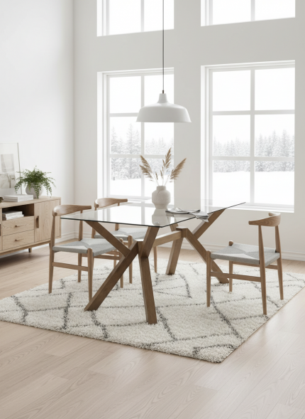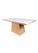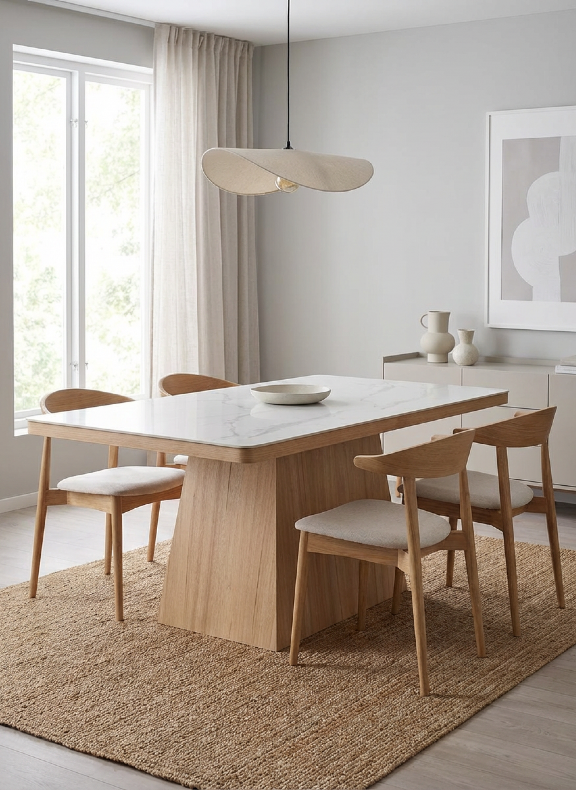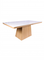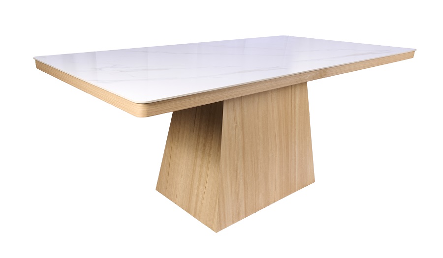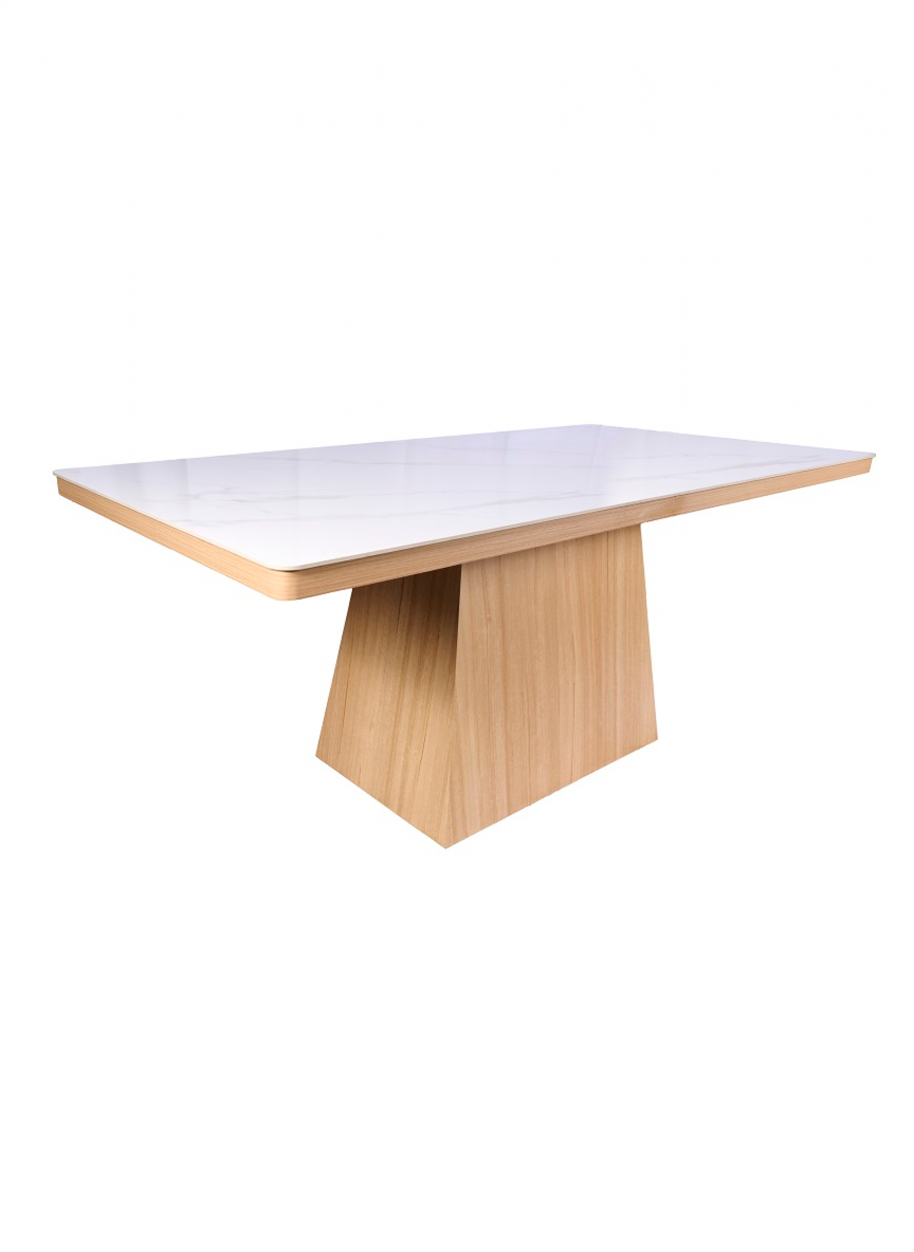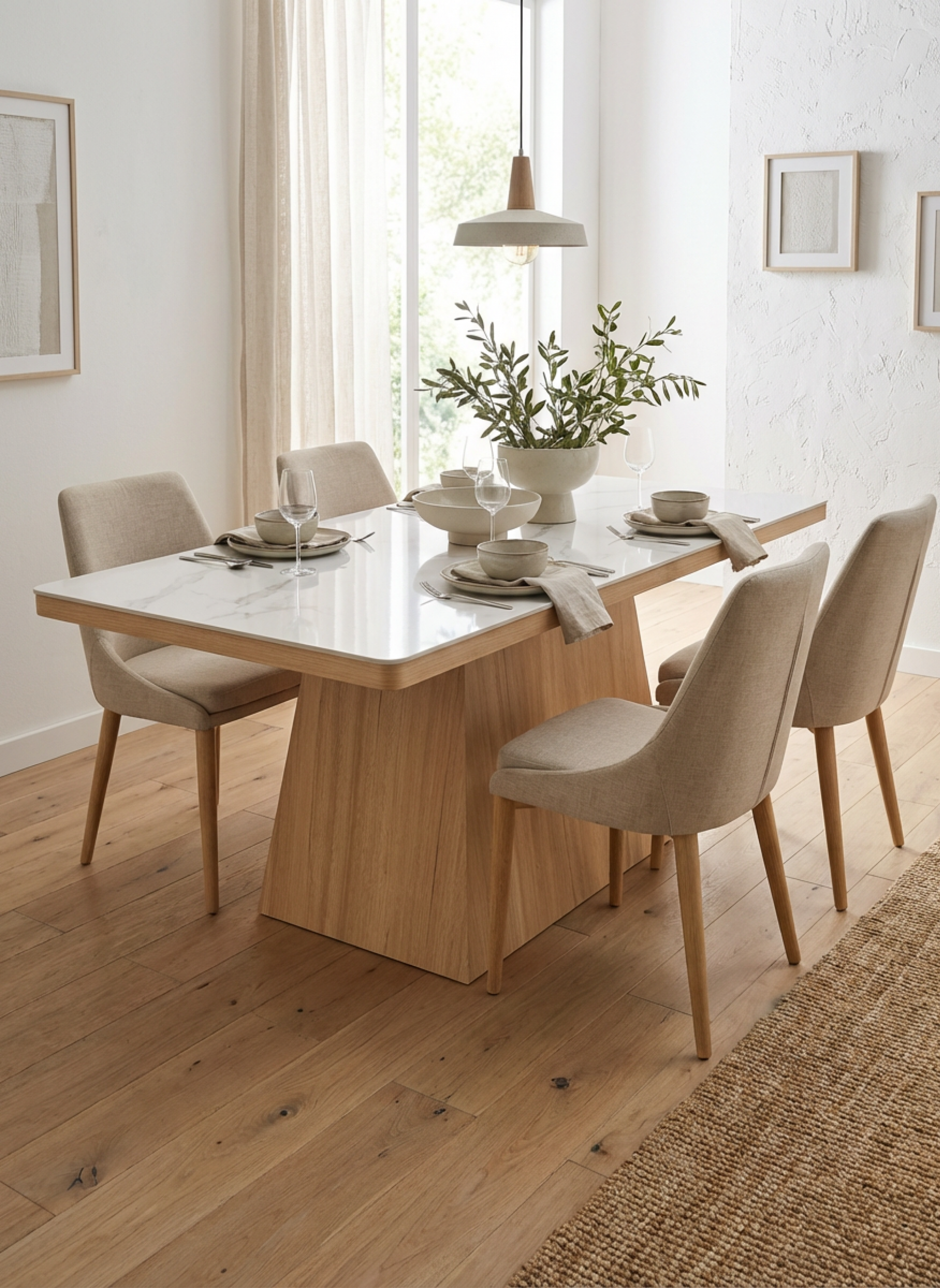 El diseño se basa en un audaz contraste entre la modernidad pulcra del porcelánico y la calidez de la madera. El perímetro de la tapa y la base están terminados en madera natural, que aporta textura y un tono orgánico. La base es un pedestal central de forma trapezoidal, ofreciendo una base sólida que maximiza el espacio para las piernas y convierte la estructura en un elemento de diseño por sí mismo.