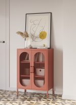 Este mueble auxiliar metálico destaca por su diseño moderno y ligero, con puertas de rejilla y marcos arqueados que aportan un toque decorativo distintivo. Su estructura baja y compacta lo hace ideal para espacios reducidos o zonas de paso, ofreciendo almacenamiento práctico sin recargar visualmente el ambiente.