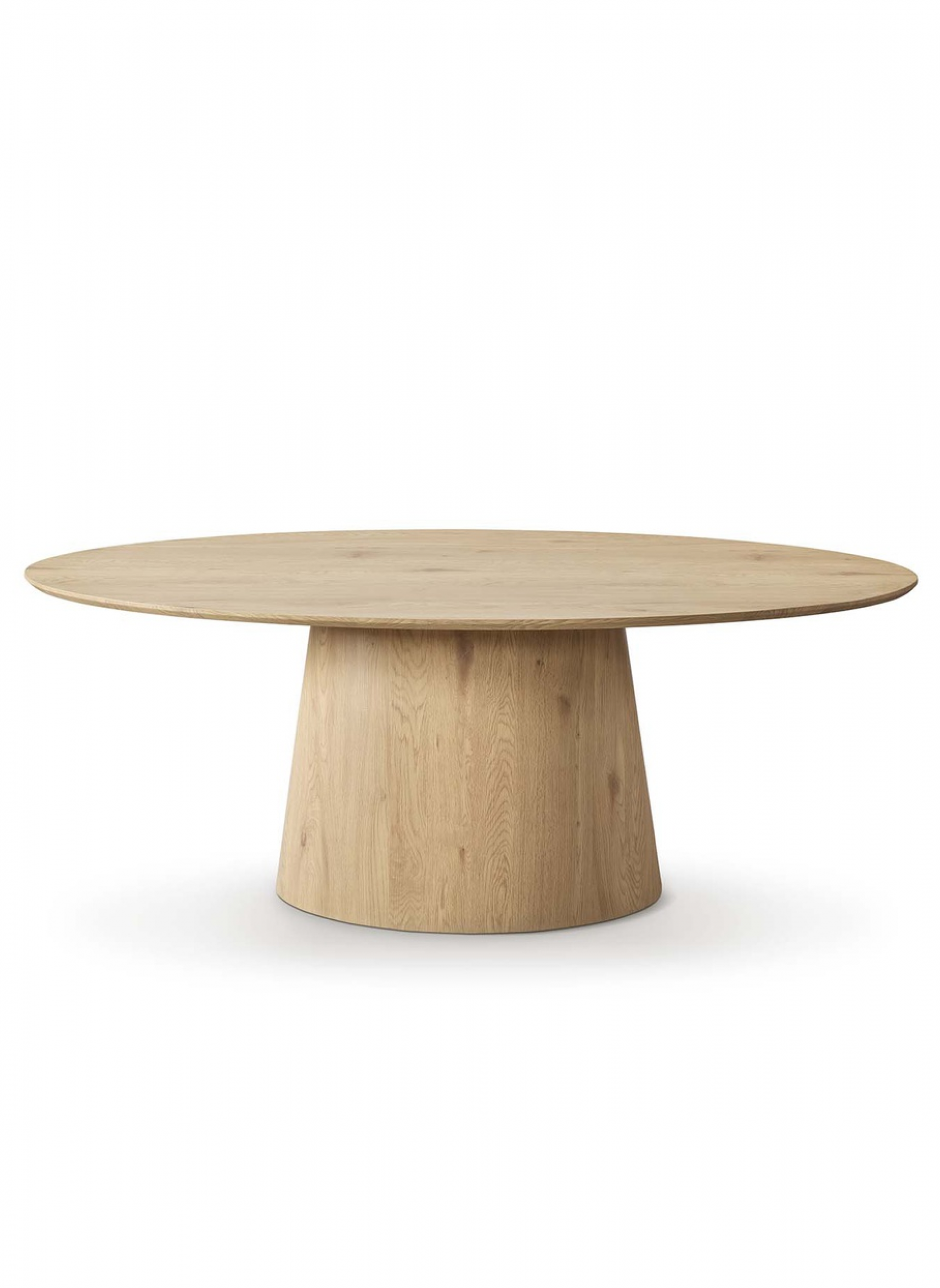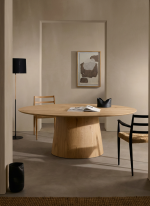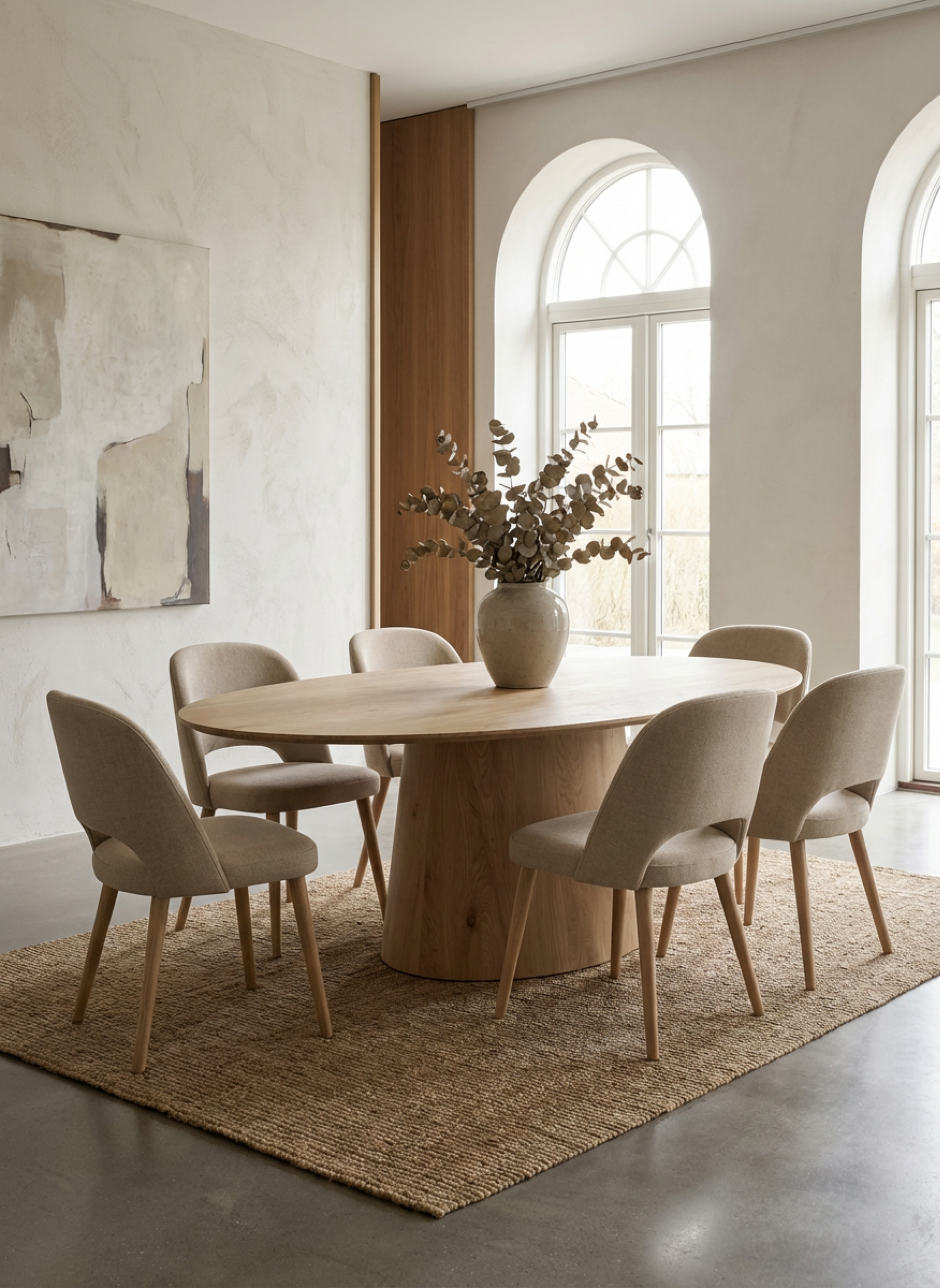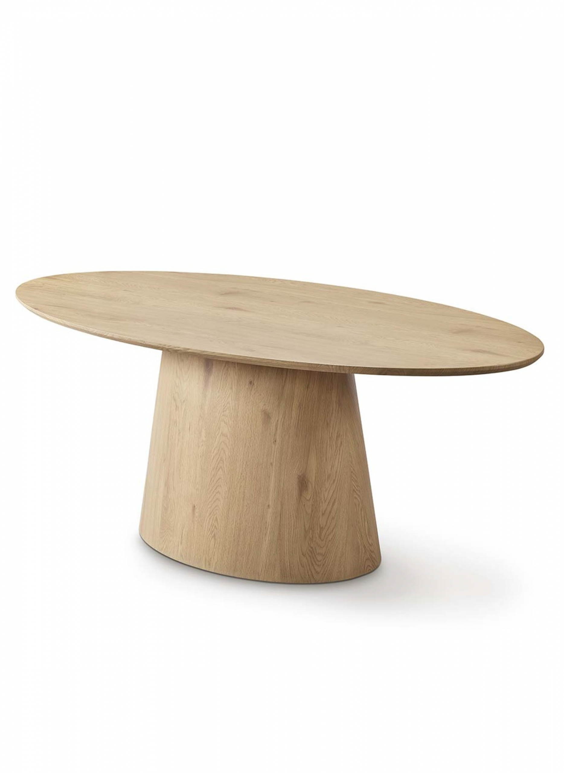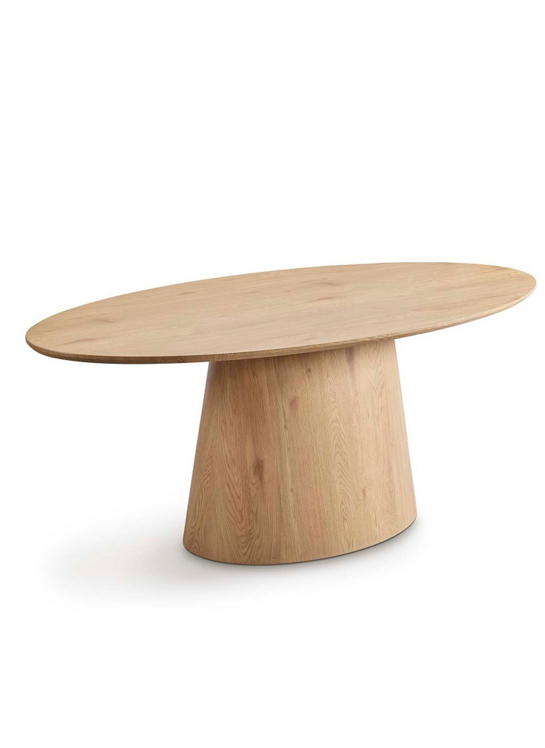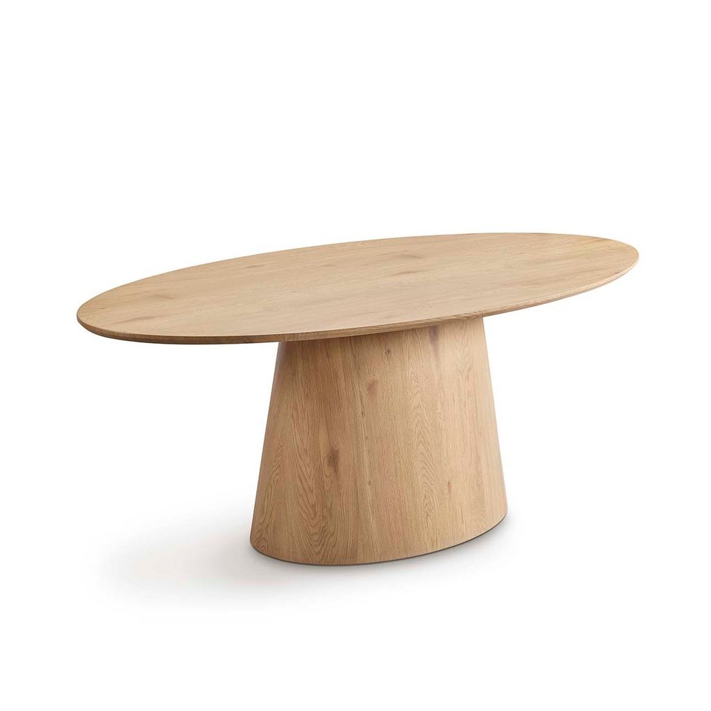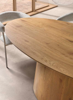 Esta mesa de comedor es una pieza de diseño contemporáneo que fusiona la calidez de la madera con una estructura de gran impacto visual. Su diseño se distingue por una elegante silueta ovalada, que suaviza el ambiente y crea un flujo más dinámico en el comedor. La tapa está acabada en chapa de roble de alta calidad, exhibiendo una veta natural y un tono claro que resalta la luminosidad del espacio.