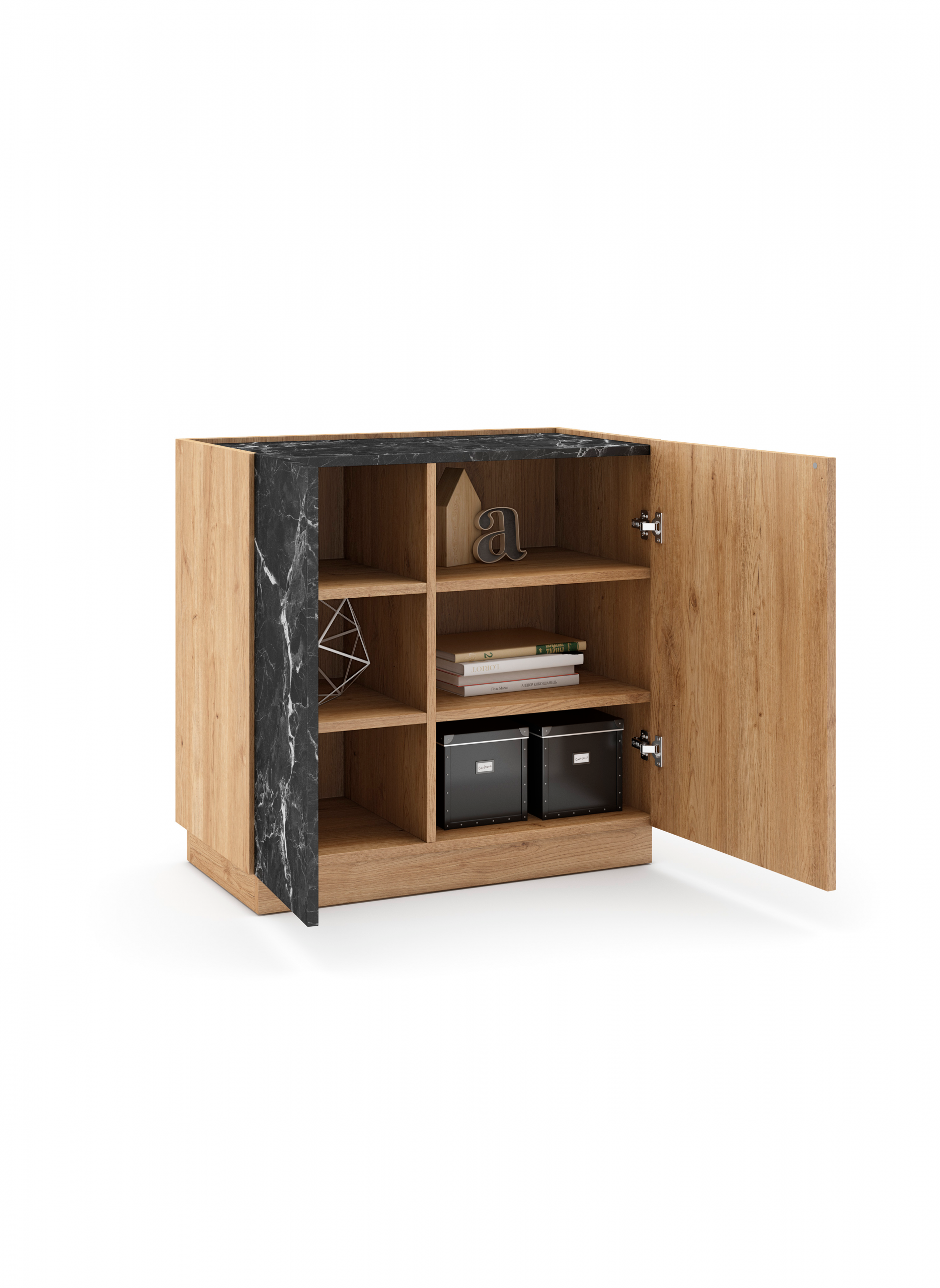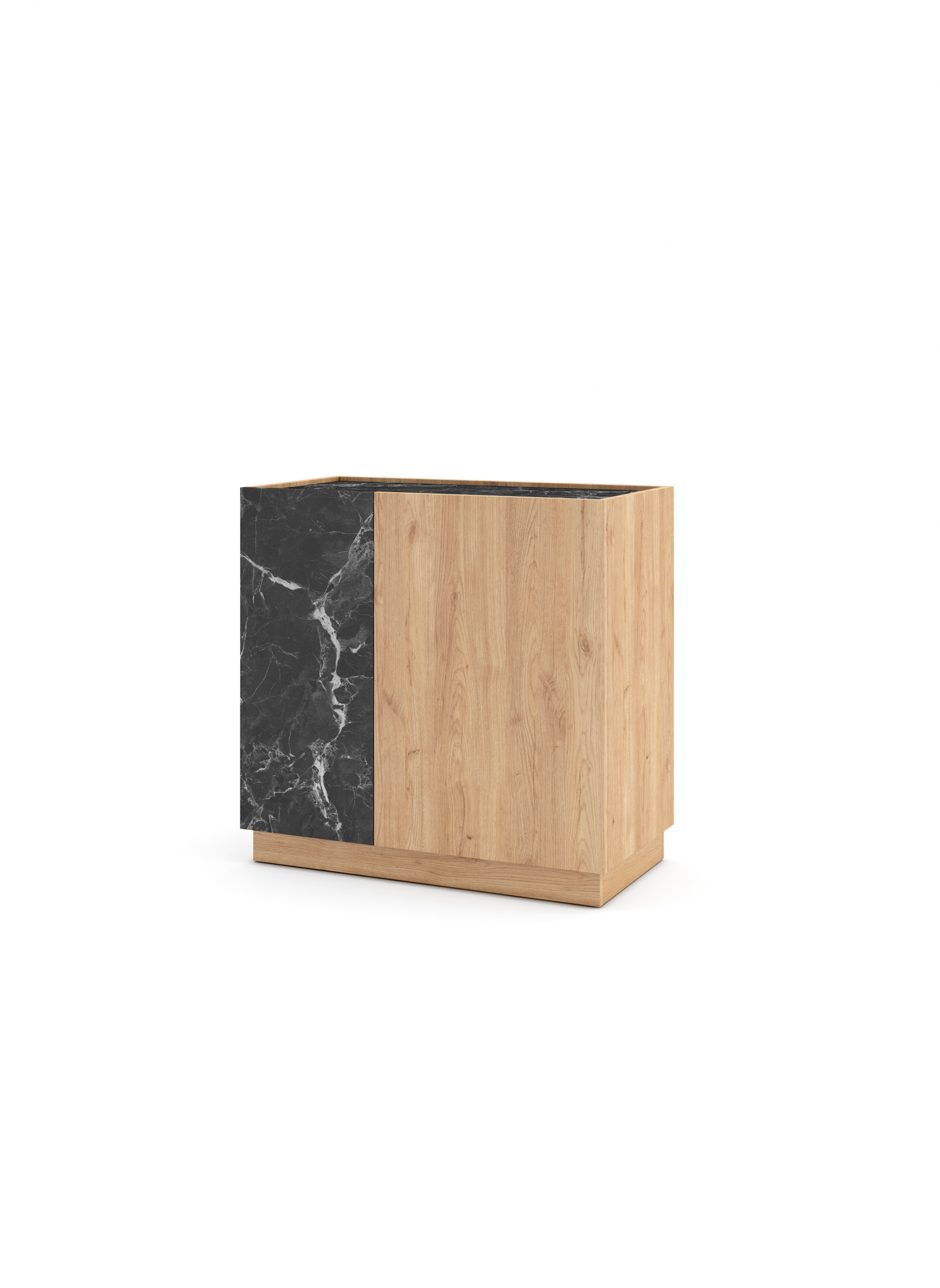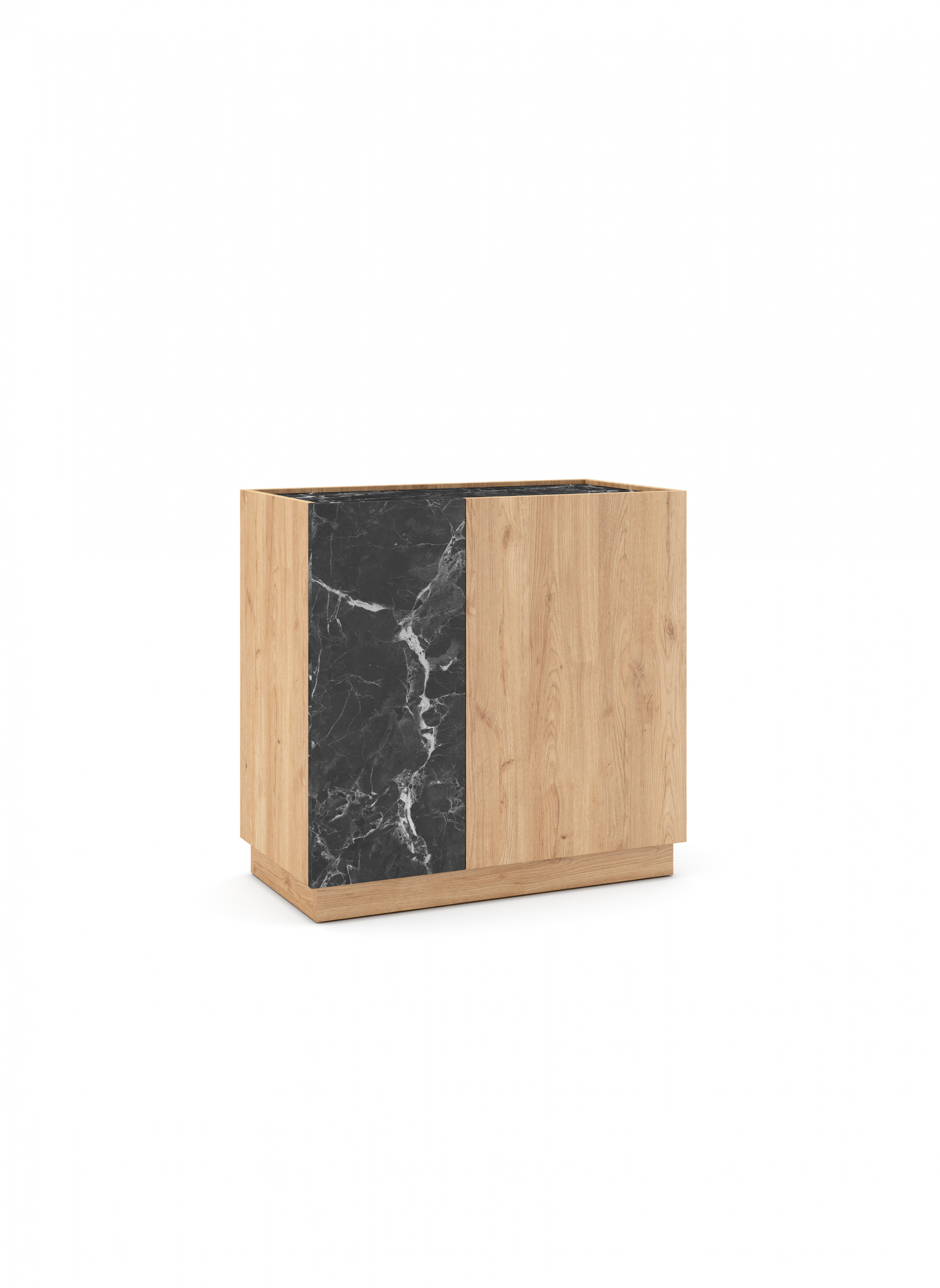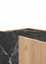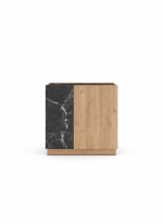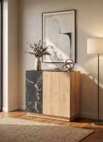 El diseño se centra en un elegante juego de contrastes texturales y cromáticos. La mayor parte del mueble tiene un acabado en Sepet, que imita la calidez de una madera clara con vetas sutiles. Este se intercala con una franja lateral que simula Mármol Lotus (un dramático mármol negro con vetas blancas), creando una composición geométrica vanguardista que atrae la mirada.