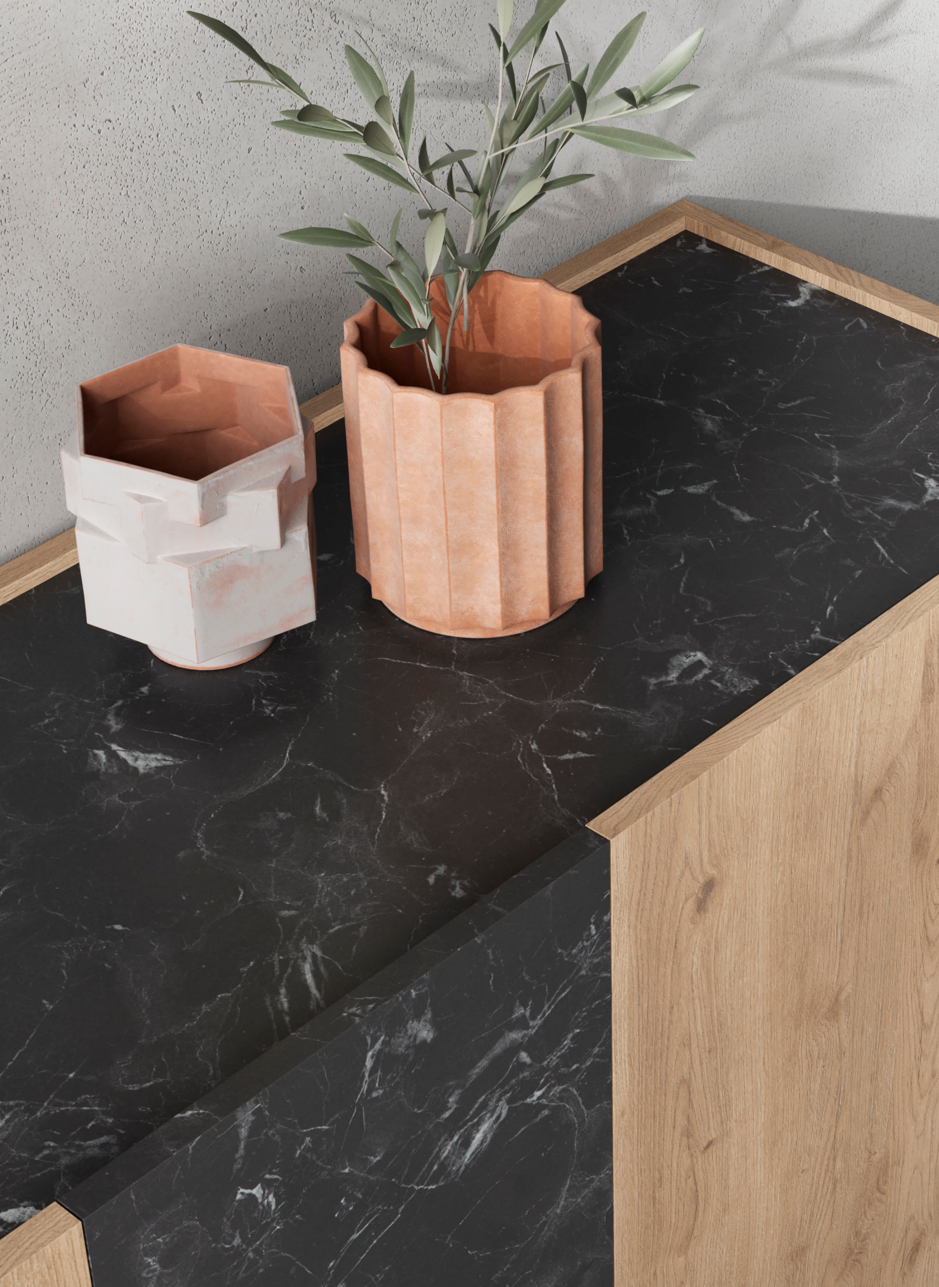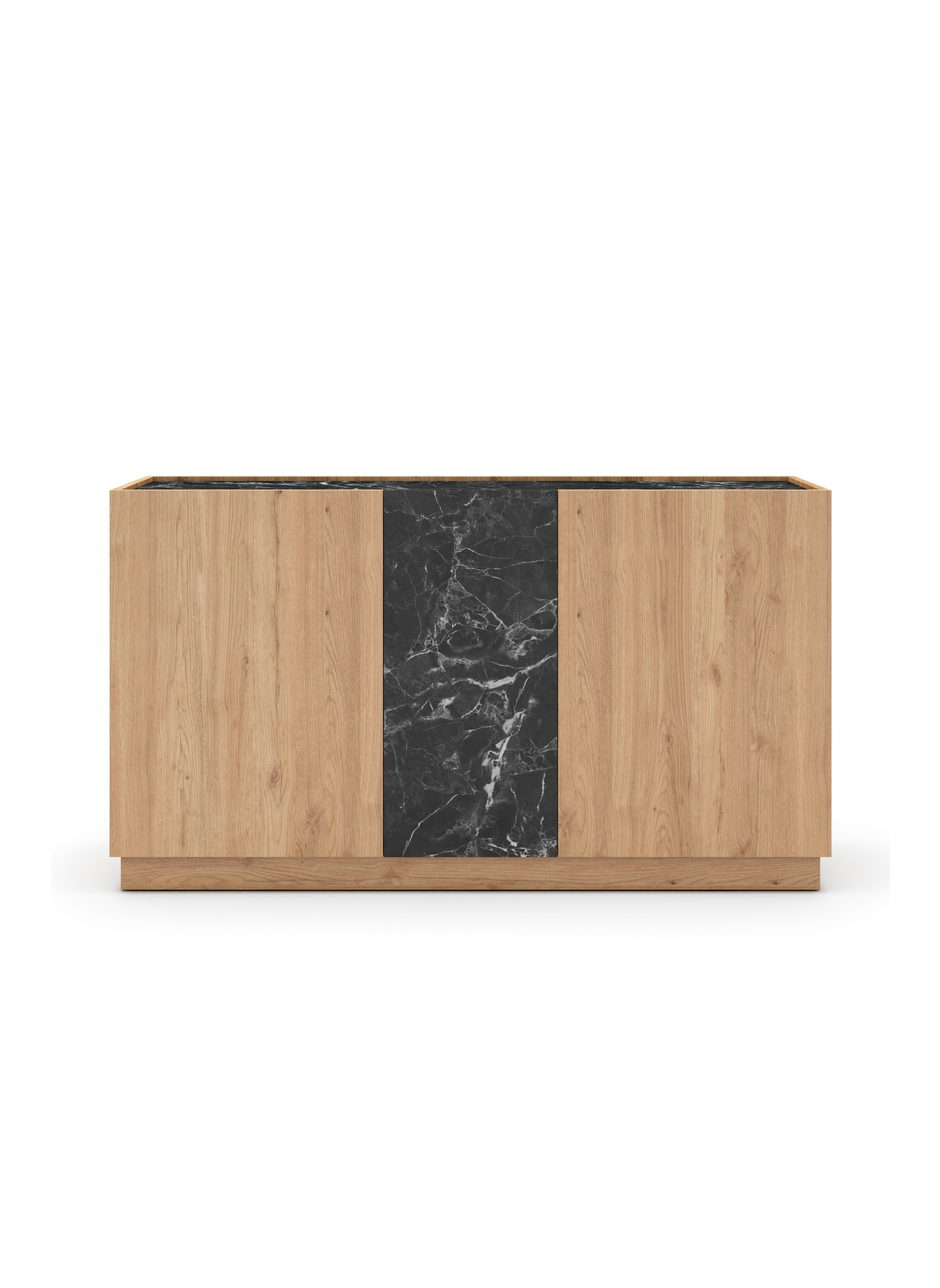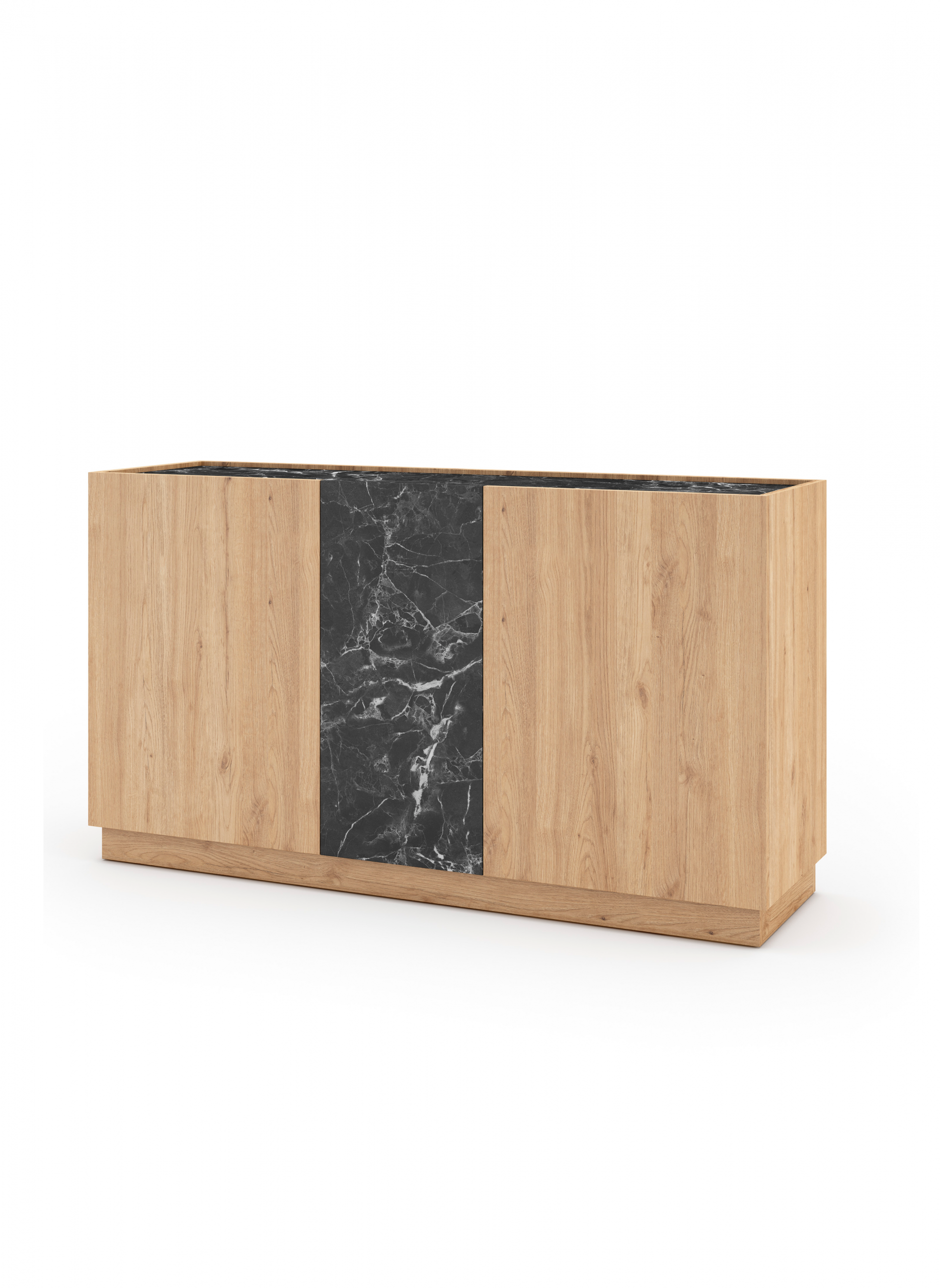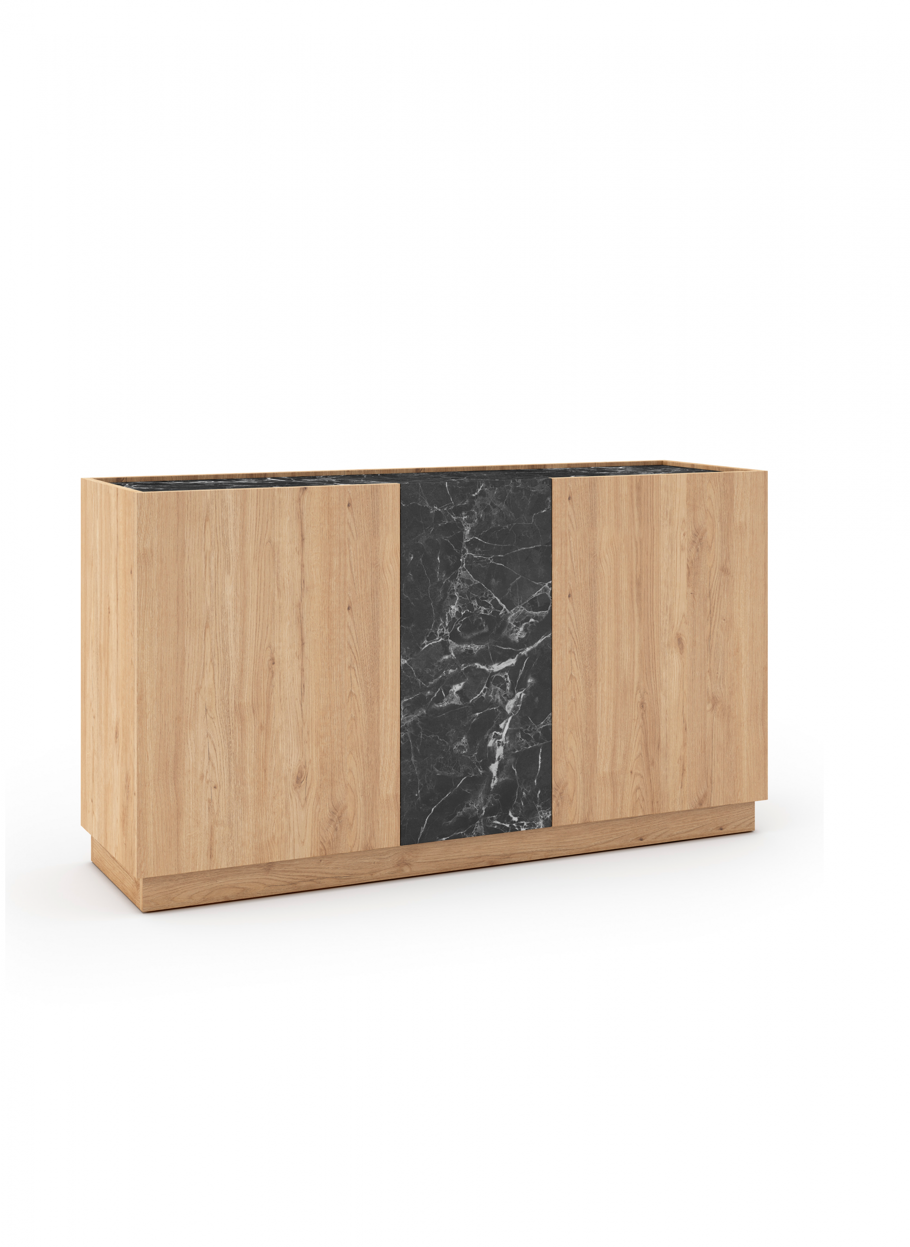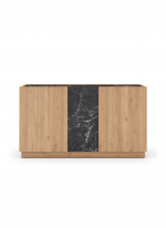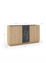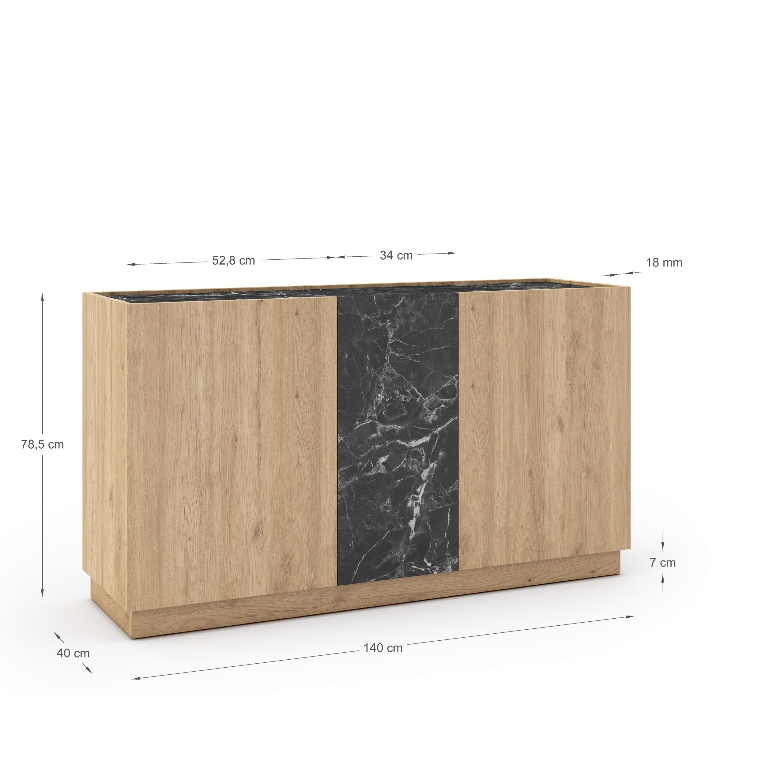 El diseño se basa en un elegante contraste textural. El cuerpo principal del aparador presenta un acabado en Sepet (un tono que simula madera clara con una veta natural y cálida, similar al roble). Este acabado se intercala con una banda central que simula mármol Lotus (un mármol negro con vetas blancas dramáticas), que aporta un toque de lujo, profundidad y sofisticación geométrica al mueble.