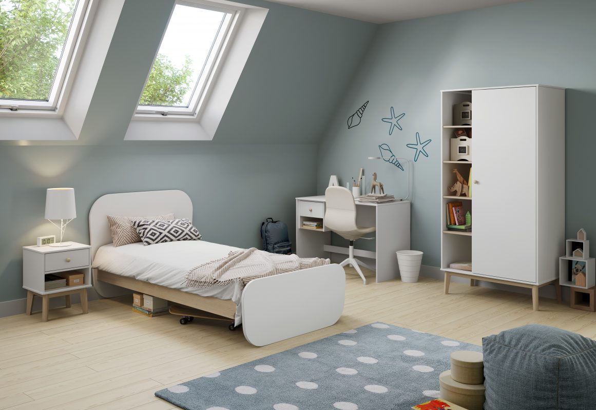 Esta cama individual de 90 x 190 cm fusiona un diseño contemporáneo con una construcción robusta y de calidad. El modelo destaca por su estética suave y orgánica, gracias a los cabeceros y pieceros con esquinas totalmente redondeadas, que eliminan ángulos duros y aportan una sensación de seguridad y modernidad al dormitorio infantil o juvenil. Su estructura combina la solidez de la madera de pino en el faldón o somier perimetral, con la superficie lisa y perfecta del DM lacado en los paneles de color.