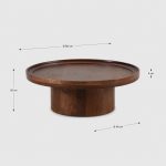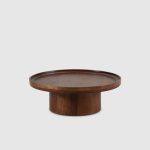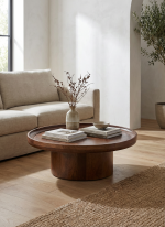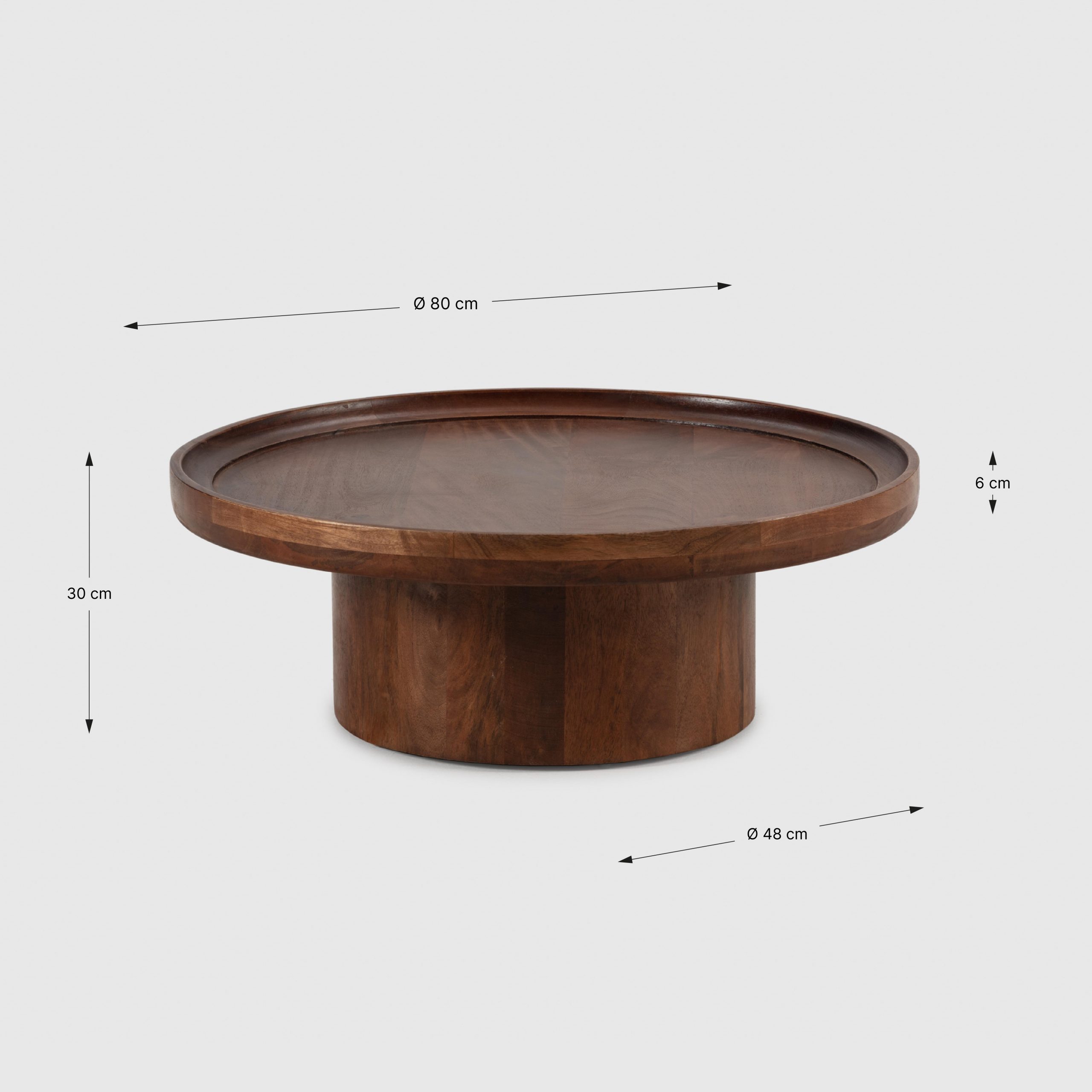 Esta impresionante mesa de centro es una pieza de diseño que irradia elegancia maciza y carácter artesanal. Está completamente construida en madera de mango con un acabado oscuro y profundo (similar al nogal o wengué), que resalta bellamente la veta natural de la madera. Su diseño se compone de un tablero redondo con un borde elevado y una base cilíndrica central robusta.