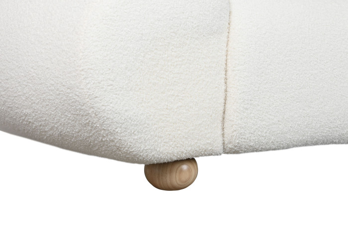 Las líneas redondeadas y su volumen generoso evocan el modern comfort propio del diseño actual, mientras que las patas esféricas de madera natural clara, finamente barnizadas, añaden un toque cálido y artesanal que equilibra la estética glam del conjunto.