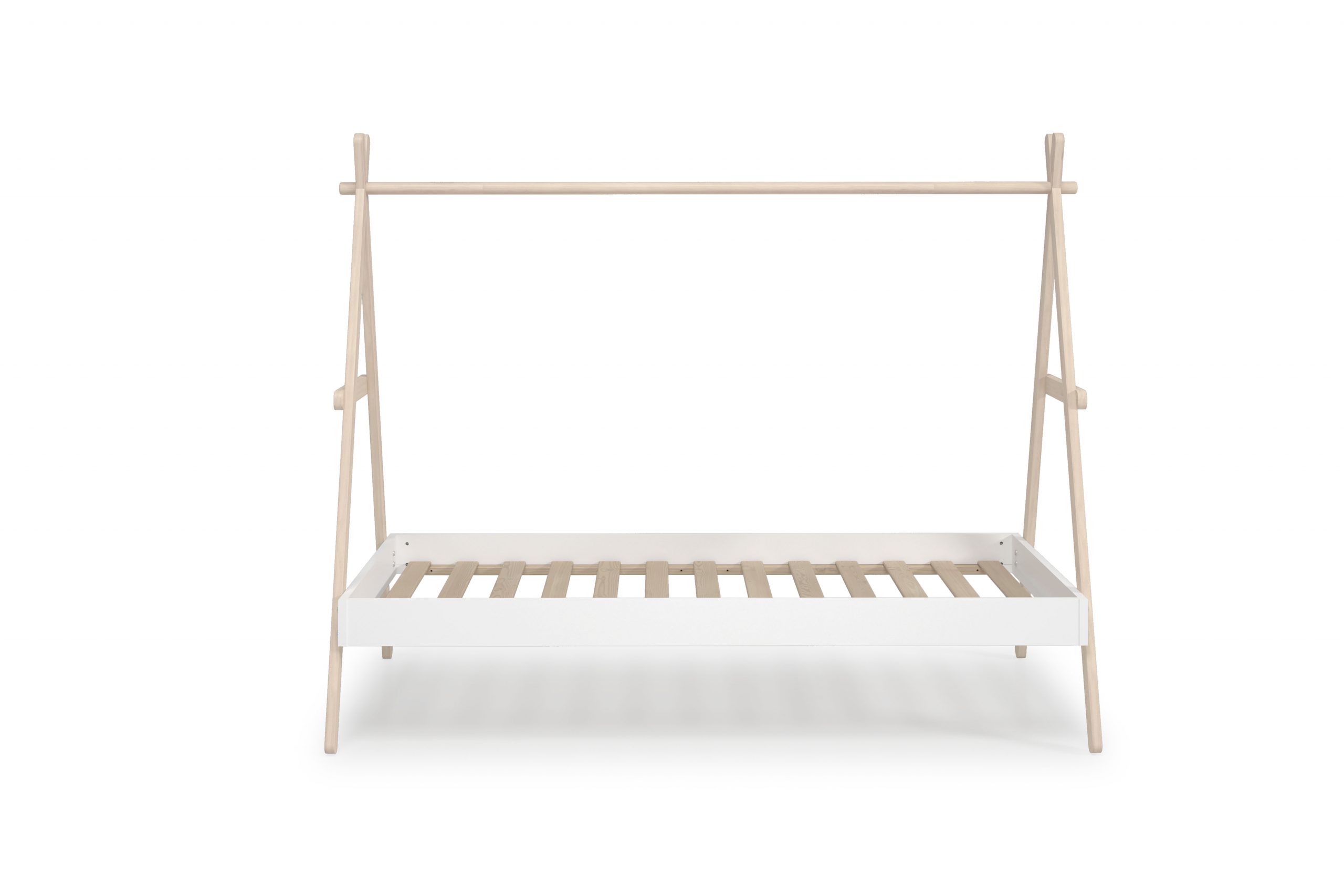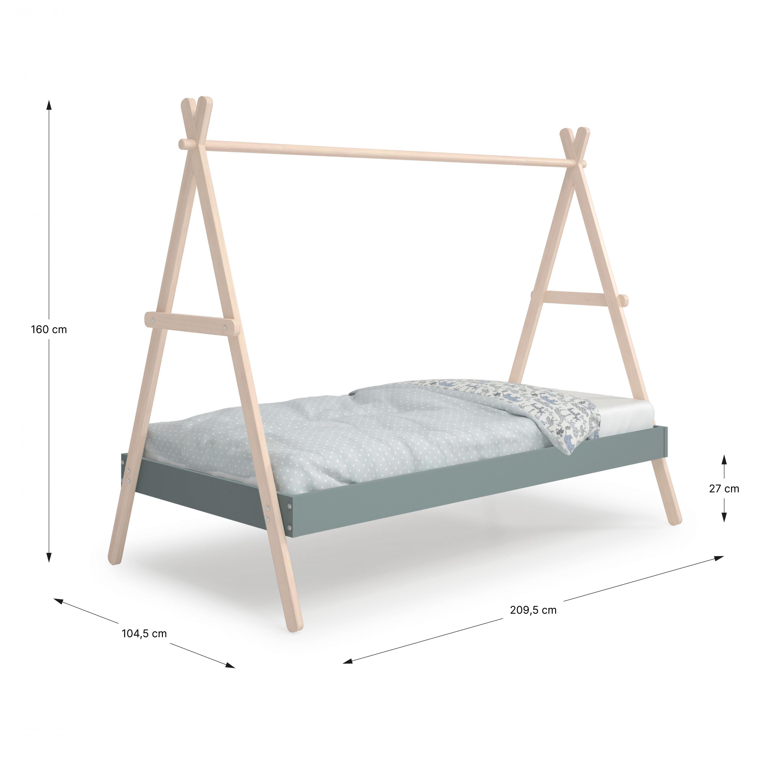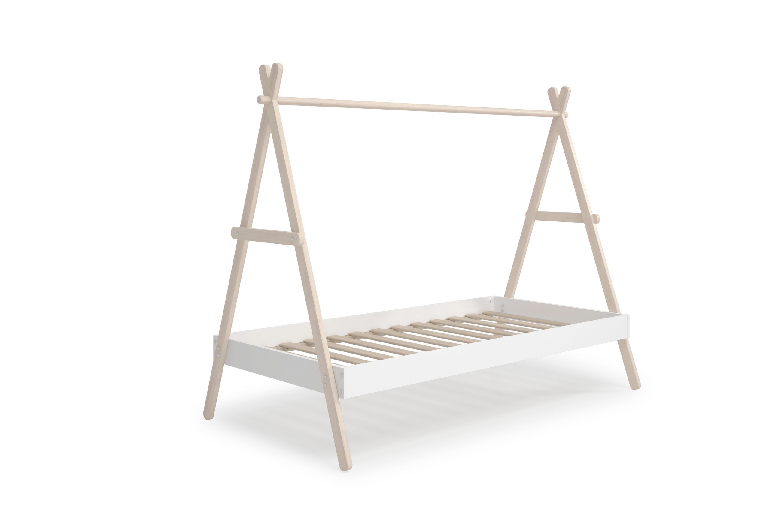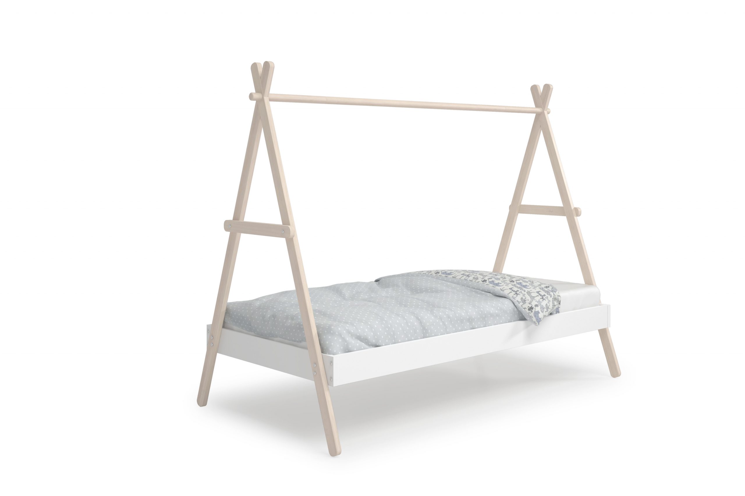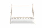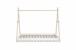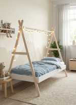 Esta Cama Tipi Infantil es la base perfecta para un dormitorio de estilo nórdico y boho que inspire el juego y la imaginación. Su diseño, que evoca una tienda india o un campamento, convierte la cama en un refugio personal para el niño, transformando la rutina del sueño en una aventura. Además de su atractivo visual, su estructura minimalista con listones de madera natural se integra con facilidad, aportando ligereza y calidez al espacio.