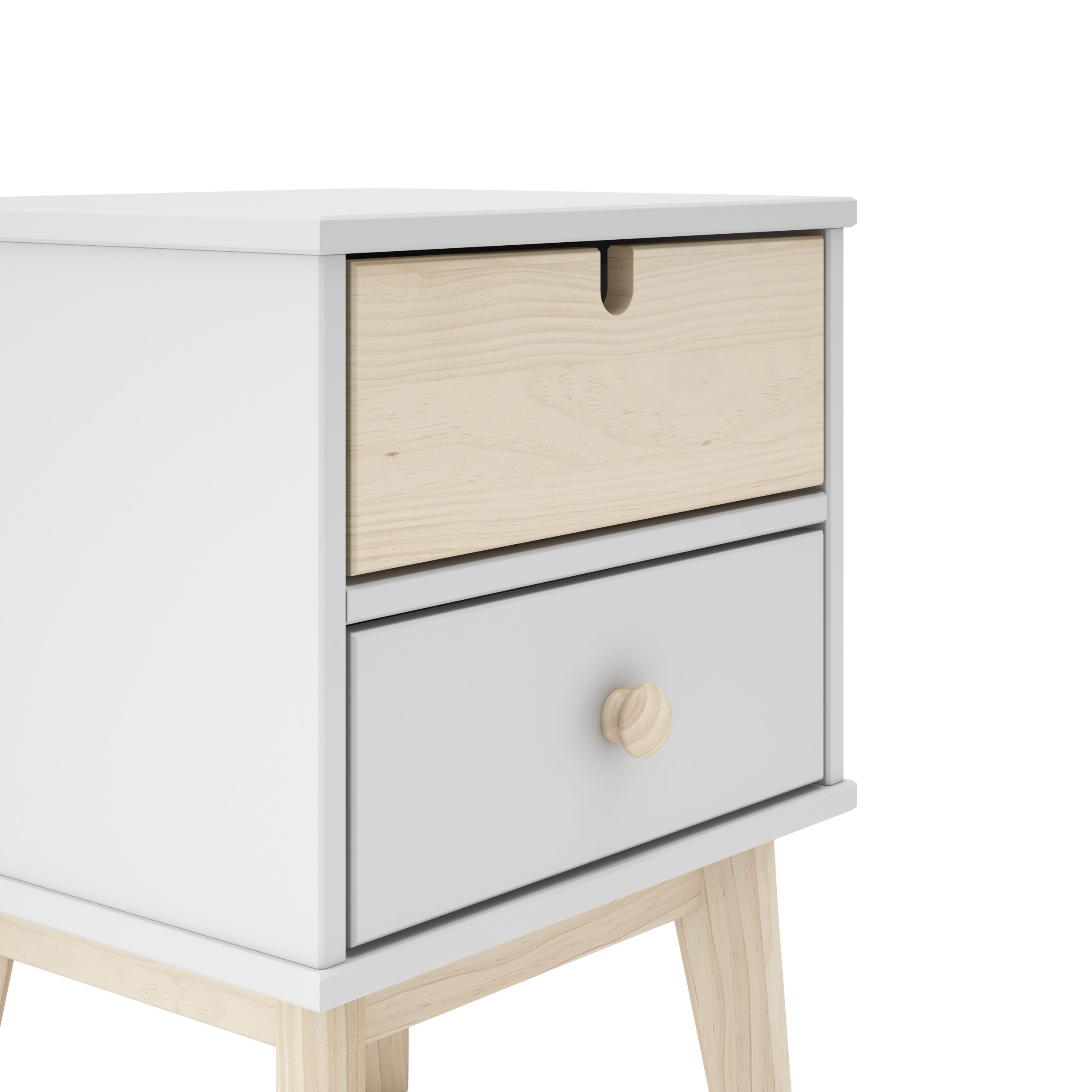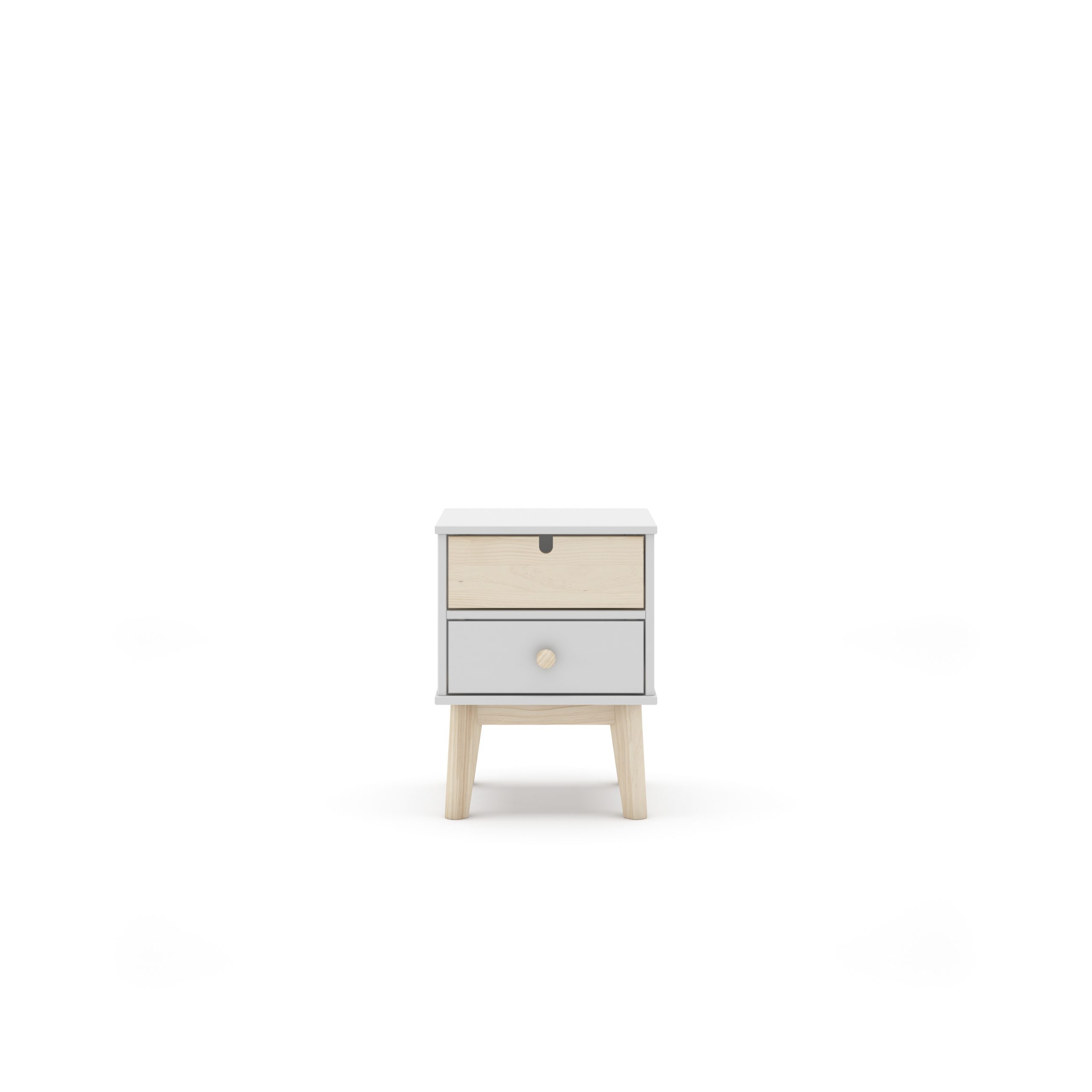 Fabricada en Pino y DM, es resistente, estable y pensada para acompañar a tu peque durante muchos años. Sus dos cajones uno en tono madera natural y otro en color son perfectos para guardar cuentos, juguetes pequeños o sus tesoros favoritos. Y sus patas de madera clara le dan ese estilo nórdico que tanto gusta.