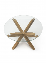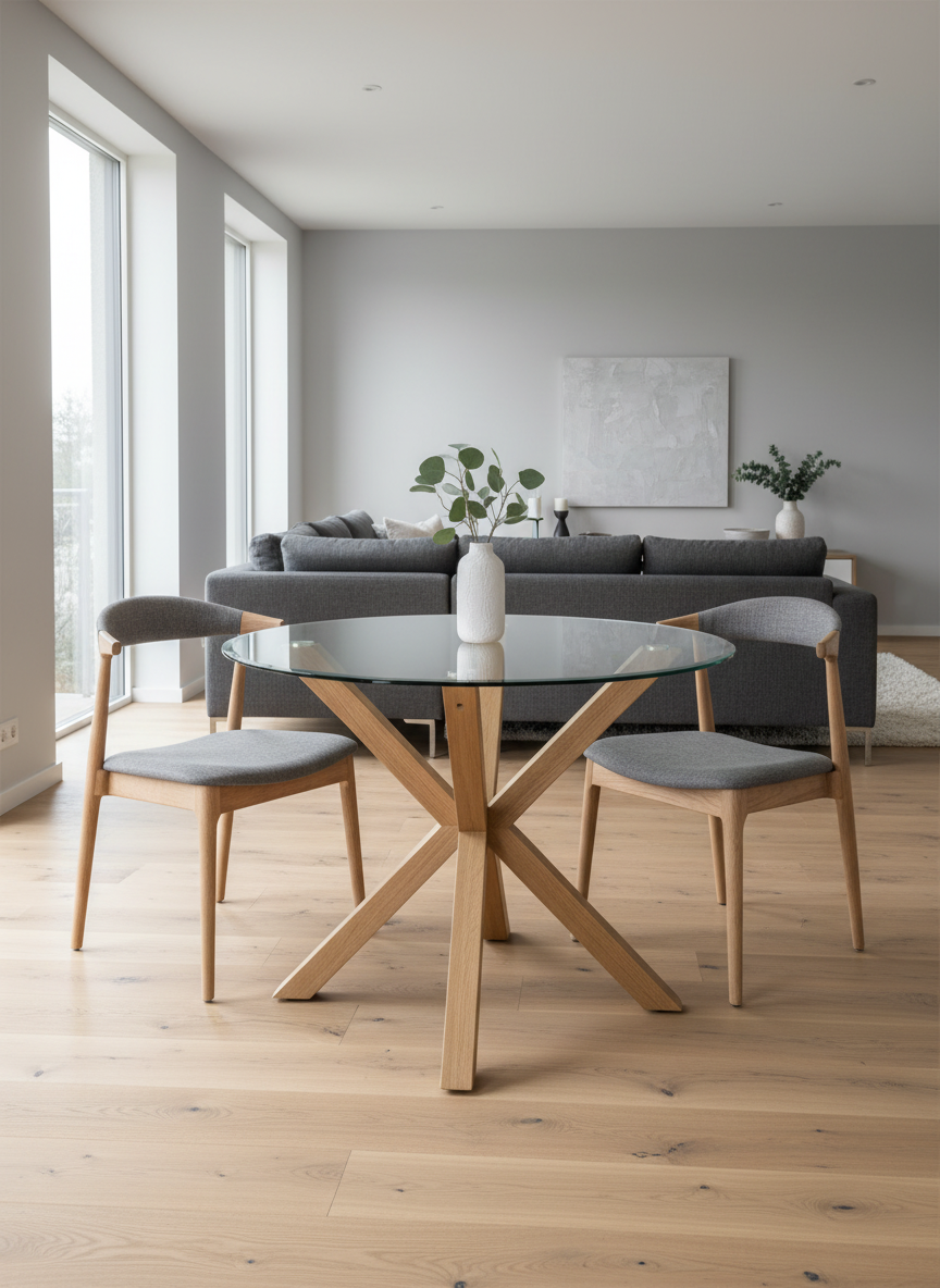 Esta mesa de comedor es una pieza elegante y luminosa que combina la calidez natural con la modernidad etérea. El diseño se centra en el contraste entre su sólida base y una tapa transparente. La tapa está fabricada en cristal templado redondo, lo que garantiza una superficie resistente, fácil de limpiar y que permite que la luz se filtre, creando una sensación de amplitud.