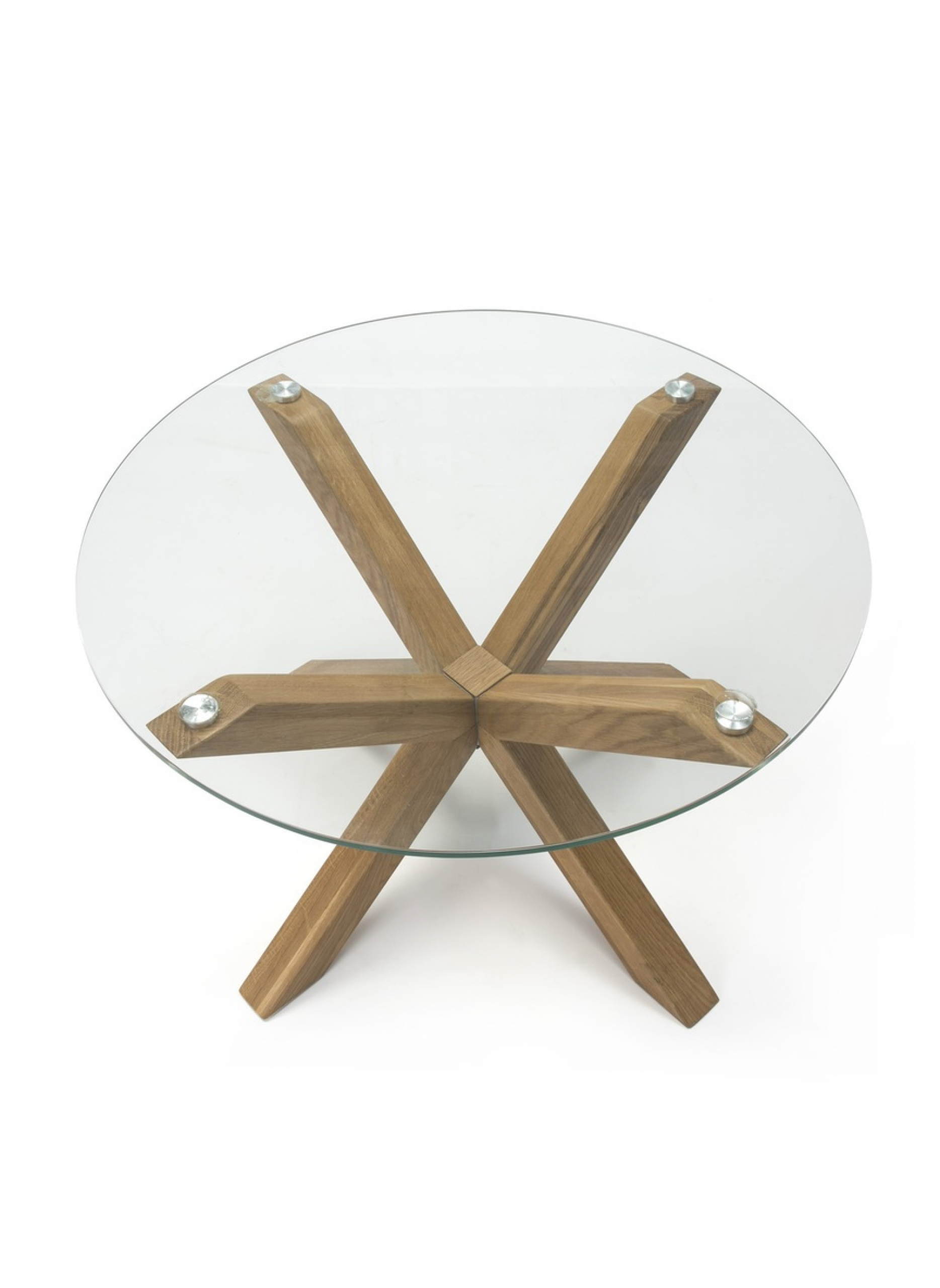 El rasgo más distintivo es su base escultural, compuesta por cuatro o más patas de madera de roble maciza que se cruzan en el centro en forma de aspa o estrella. La madera de roble aporta una veta rica y un tono cálido natural, mientras que la estructura en "X" le confiere una estabilidad robusta y un diseño visualmente dinámico, inspirándose en la estética escandinava y mid-century.