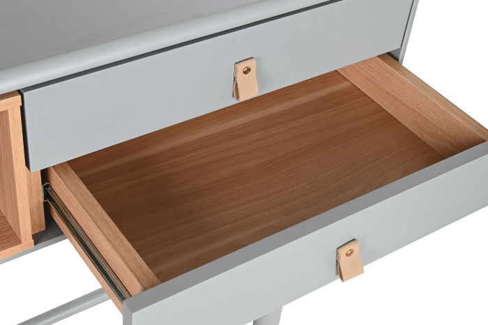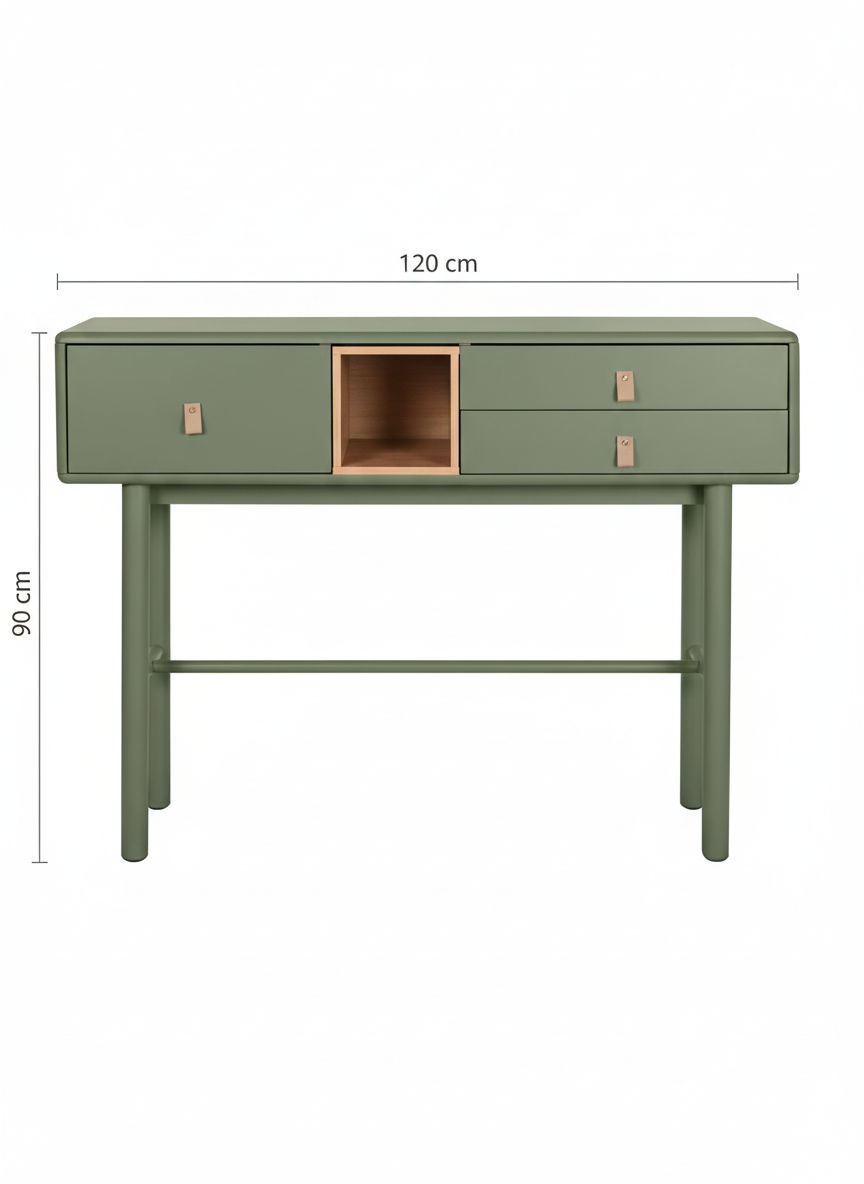 Con unas medidas de 120 x 35 x 90 cm, ofrece el equilibrio ideal entre capacidad y ligereza visual. Dispone de cajones y compartimentos abiertos que te permiten mantener todo organizado: llaves, documentos, accesorios o elementos decorativos siempre a mano.