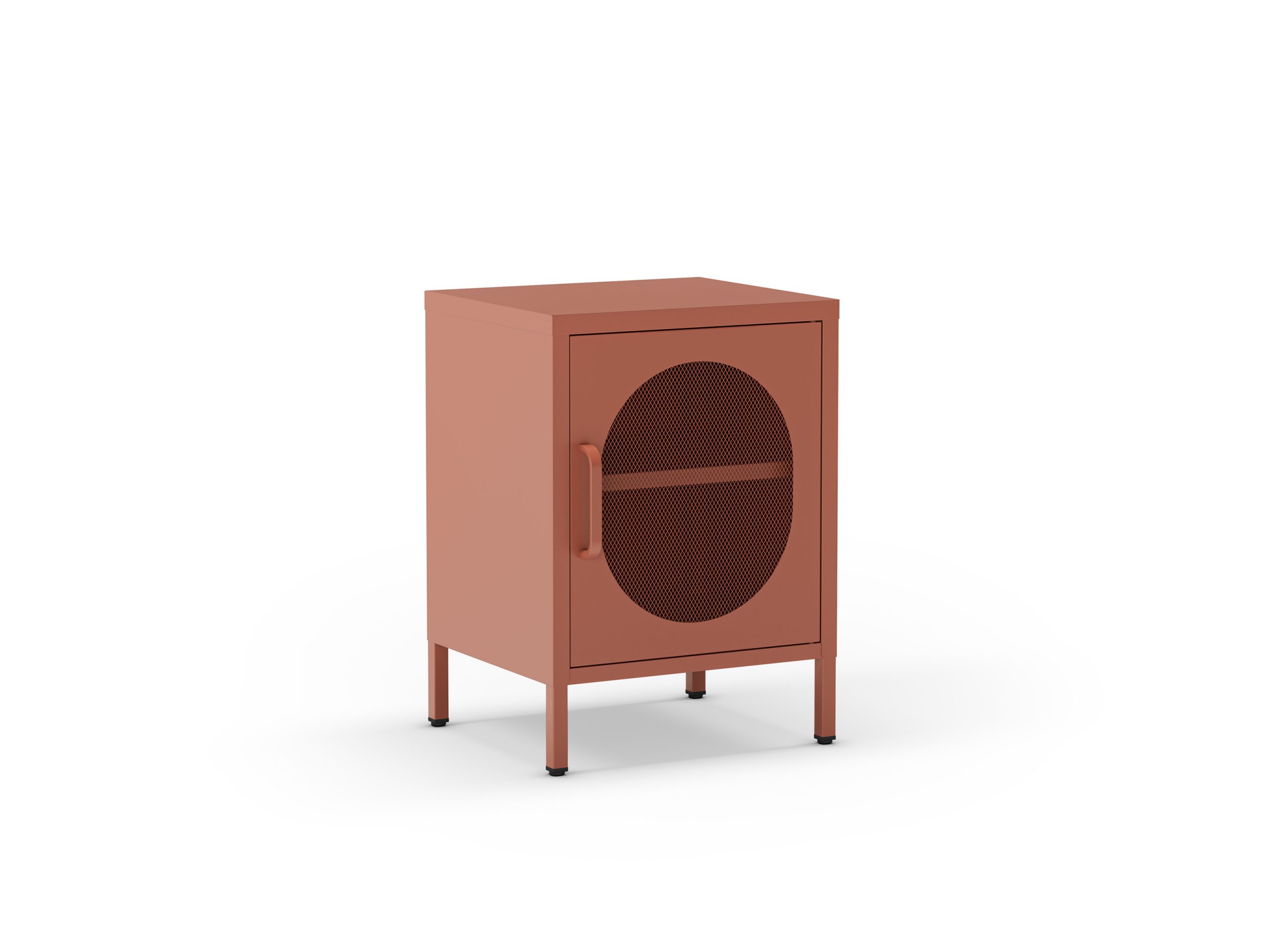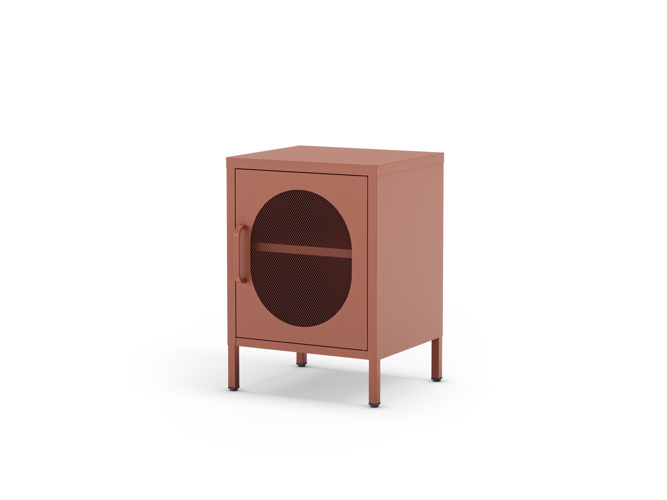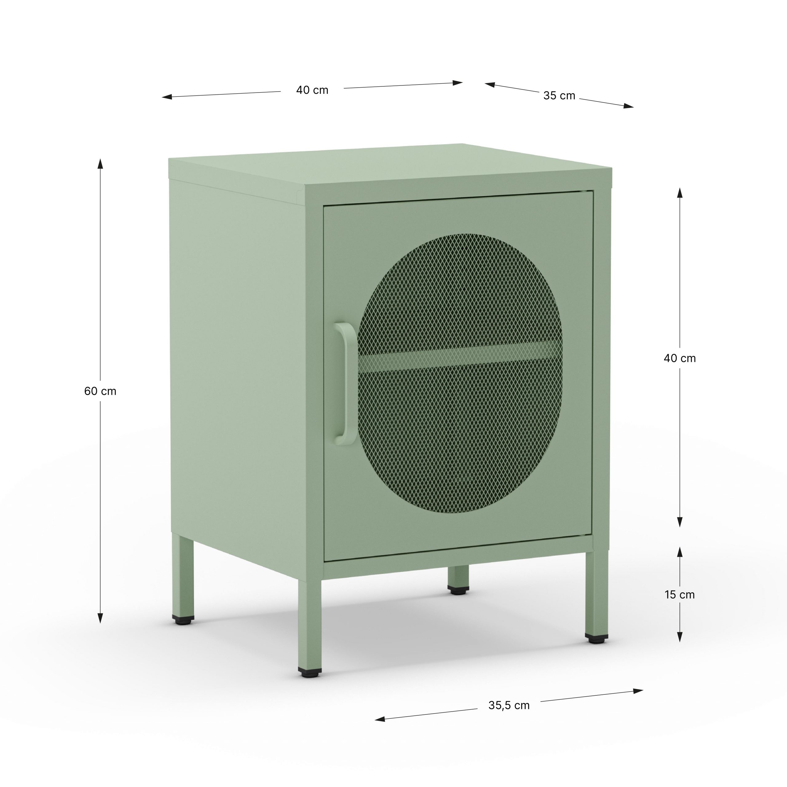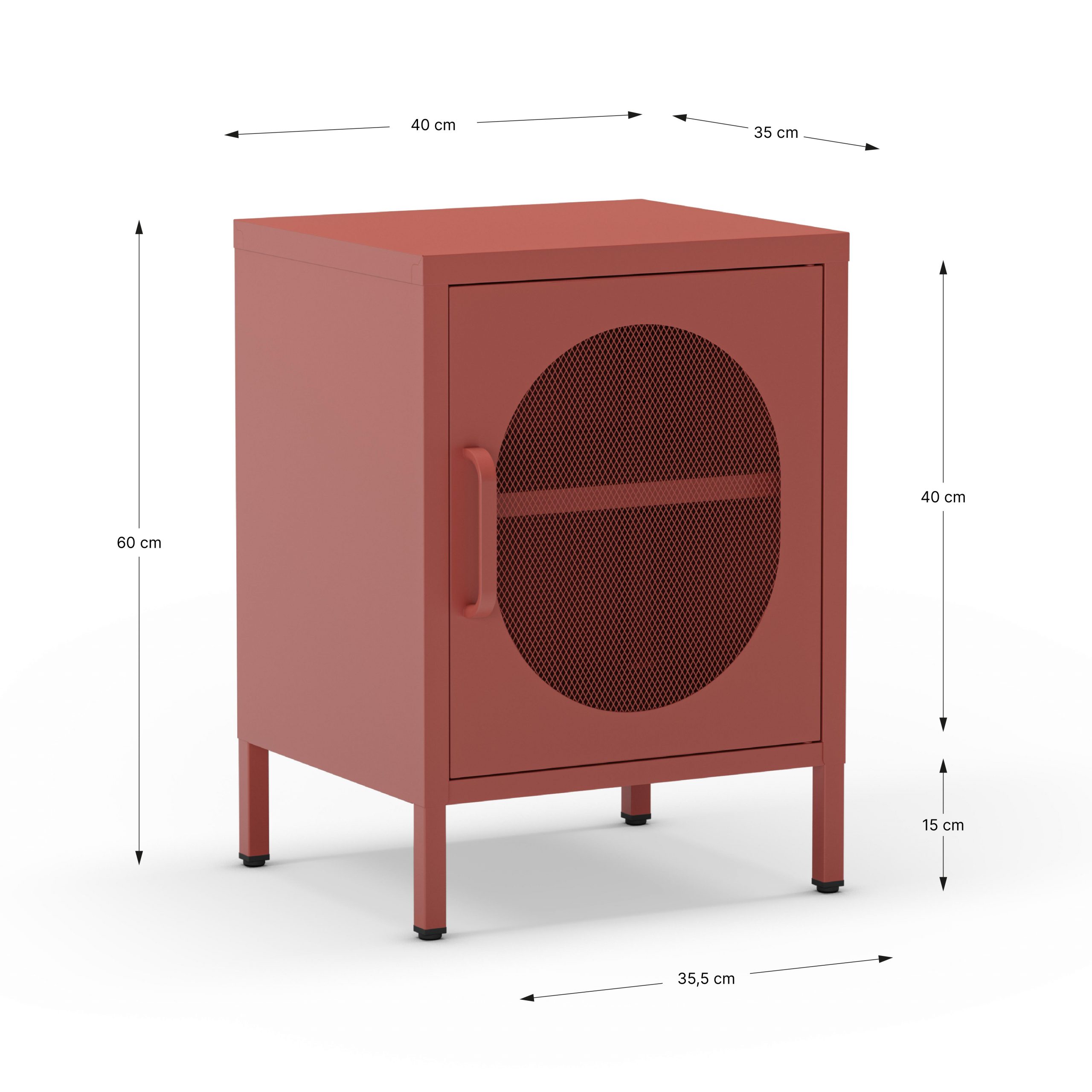Eleva el estilo de tu dormitorio con esta mesita de noche de metal resistente, diseñada para quienes buscan un toque moderno, urbano y funcional. Su puerta reversible incorpora una elegante ventana enrejada, un detalle contemporáneo que aporta carácter, ligereza visual y un toque industrial que combina con cualquier ambiente.