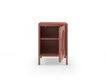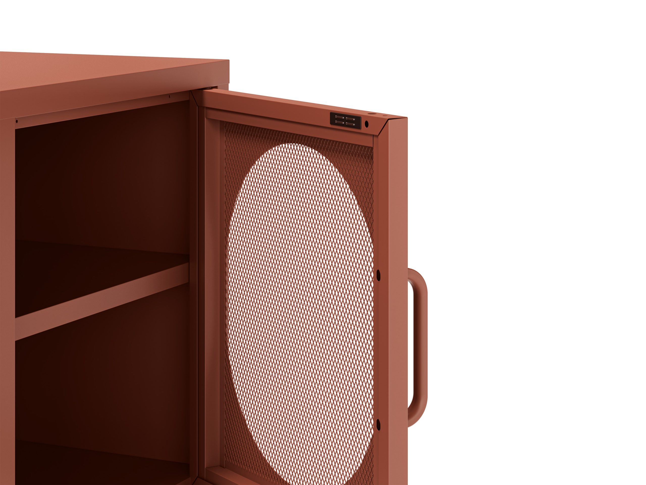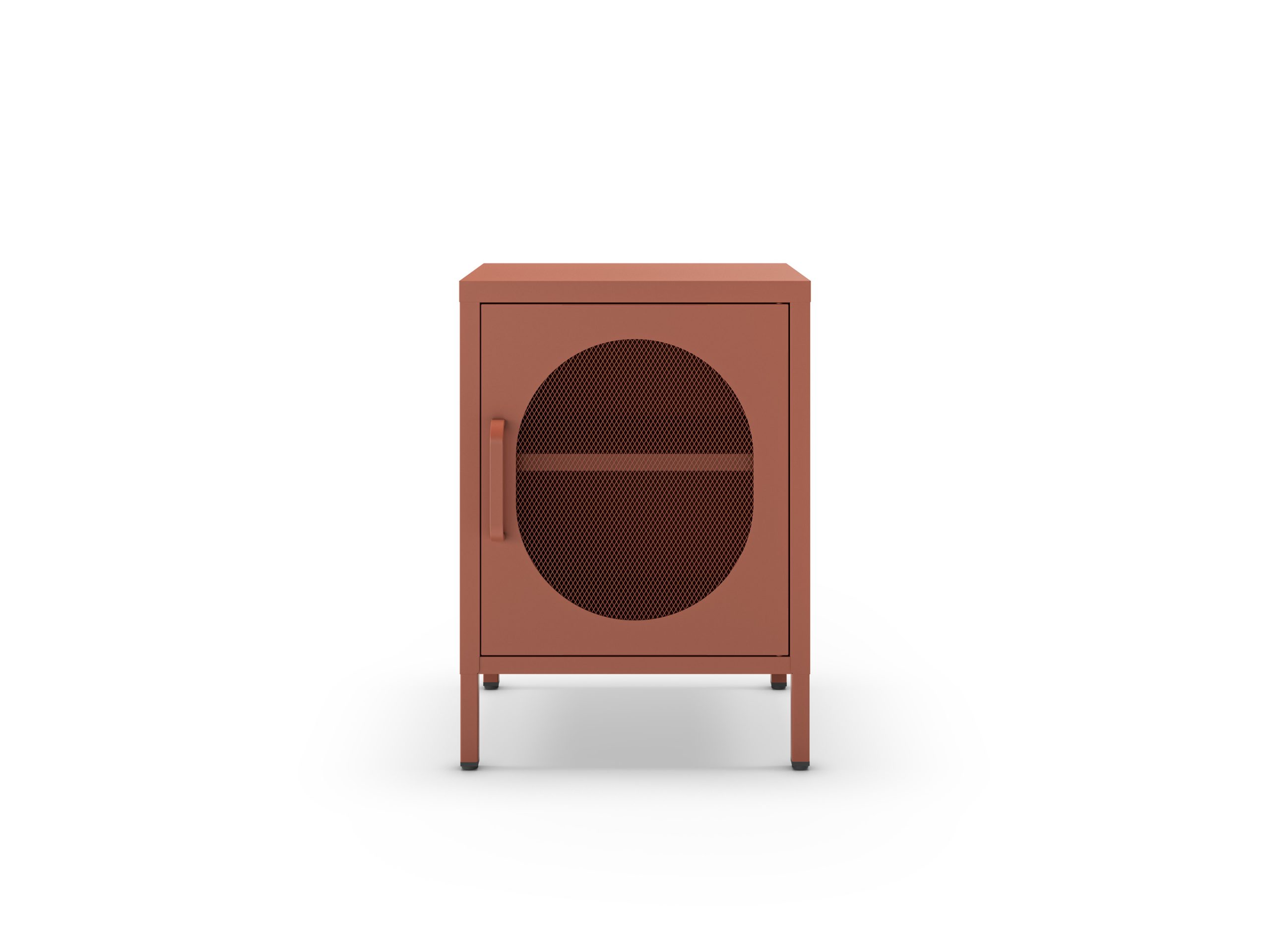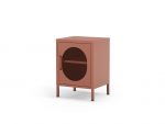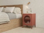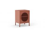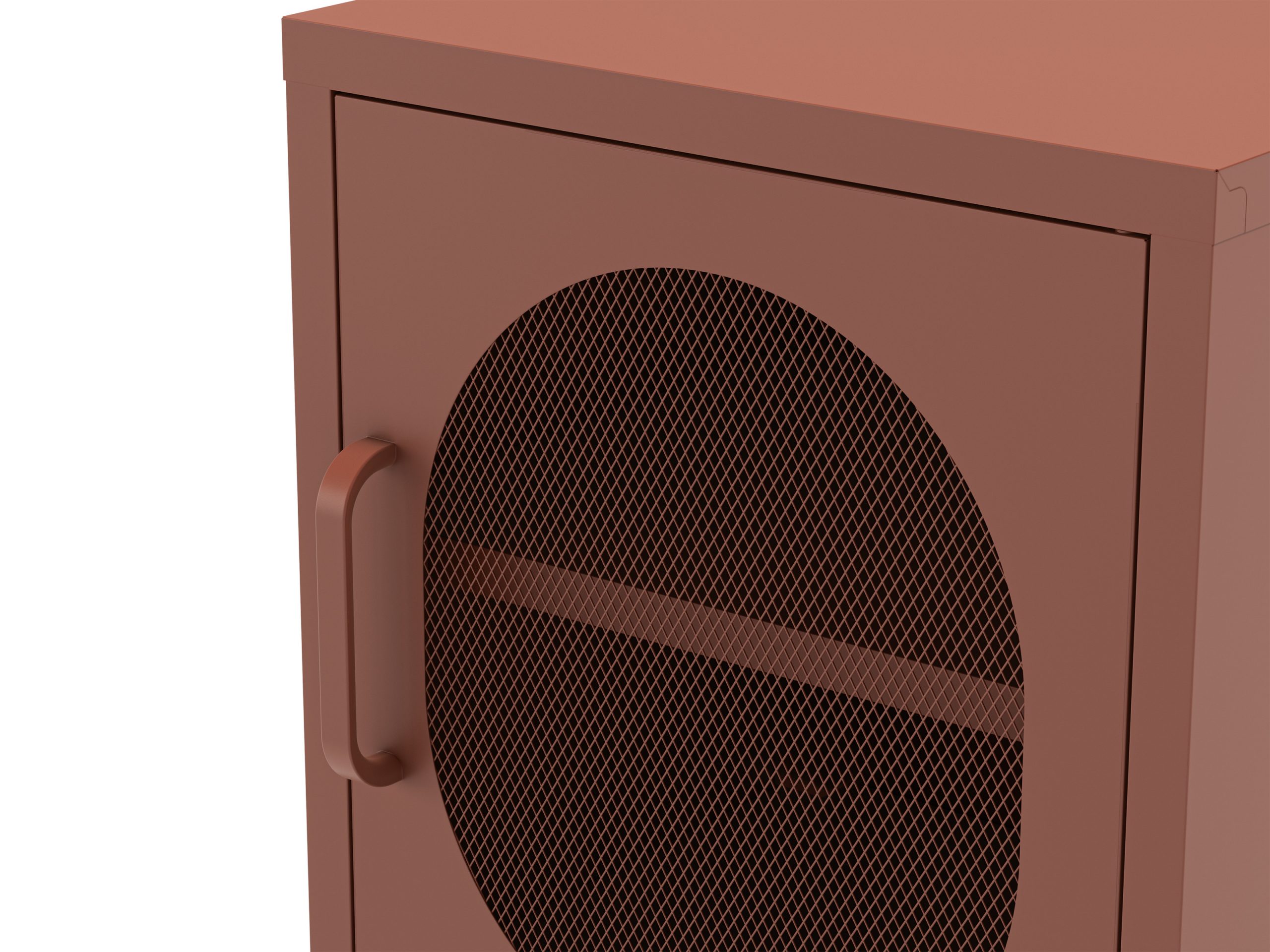 Eleva el estilo de tu dormitorio con esta mesita de noche de metal resistente, diseñada para quienes buscan un toque moderno, urbano y funcional. Su puerta reversible incorpora una elegante ventana enrejada, un detalle contemporáneo que aporta carácter, ligereza visual y un toque industrial que combina con cualquier ambiente.