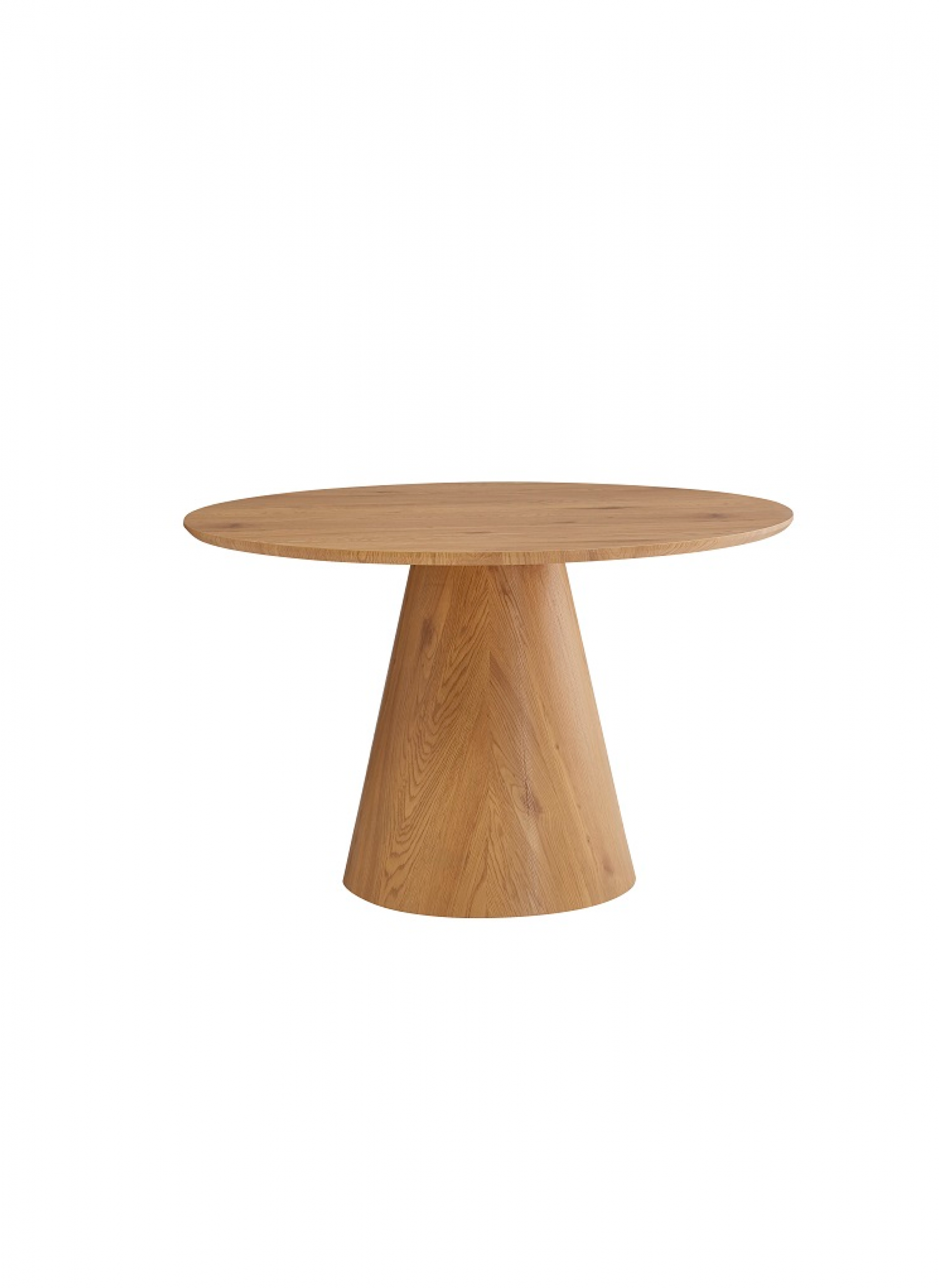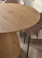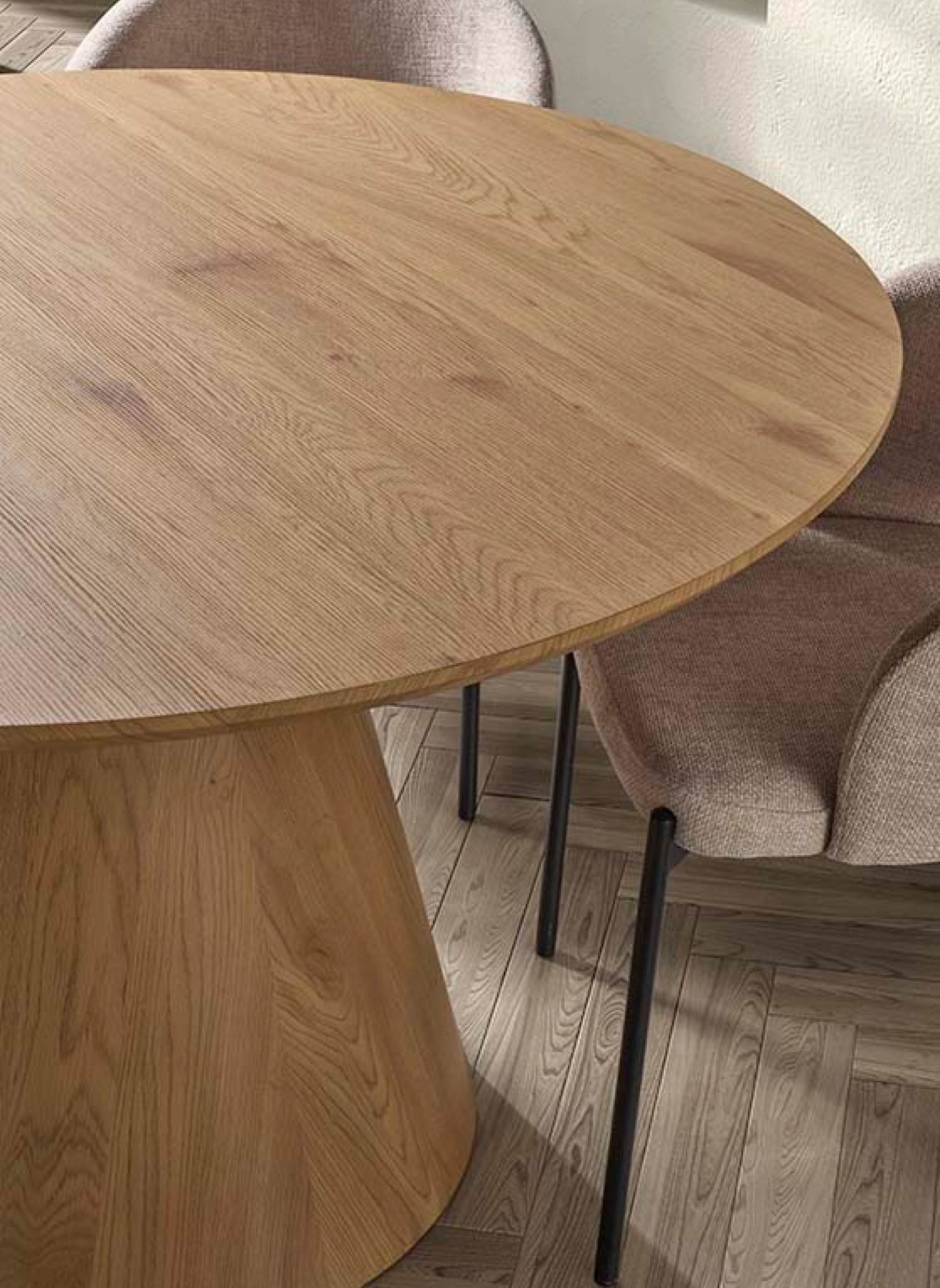Esta mesa de comedor es una pieza de diseño contemporáneo y minimalista, que se distingue por su forma redonda y su robusto pie central. La tapa está elaborada con laminado de roble de alta calidad, ofreciendo la belleza y el cálido veteado de la madera natural con una superficie duradera y de fácil mantenimiento.