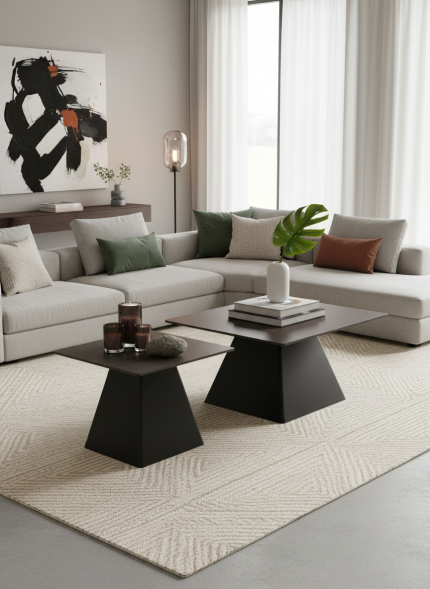 Zelos conjunto de dos mesas de diseño contemporáneo con tapa en piedra sinterizada de geometría arquitectónica.