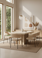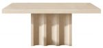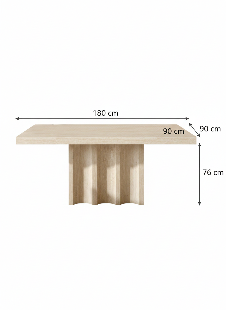 Esta elegante mesa presenta un diseño contemporáneo inspirado en formas arquitectónicas suaves y escultóricas. Su acabado en tono claro tipo travertino aporta una estética natural y sofisticada, perfecta para ambientes modernos, minimalistas o mediterráneos. La base destaca por su estructura ondulada, formada por pliegues verticales que crean un juego de luces y sombras, dotando a la pieza de carácter y movimiento sin perder estabilidad.