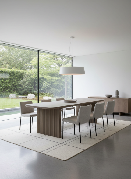 La cubierta rectangular ofrece una superficie amplia y resistente, ideal para reuniones, comidas o como punto focal en el comedor. Su textura cálida y su diseño armónico permiten combinarla fácilmente con distintos estilos de sillas y decoraciones. Es una mesa que no solo cumple una función práctica, sino que también actúa como elemento decorativo central, elevando la elegancia y personalidad del espacio.