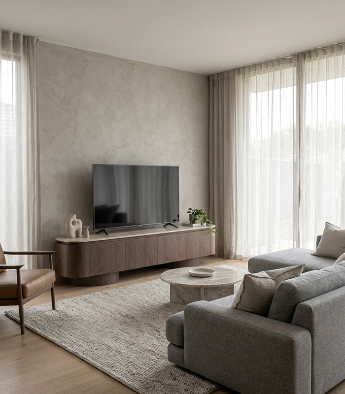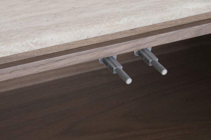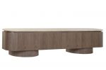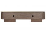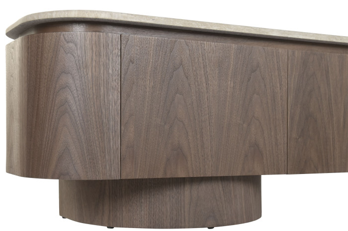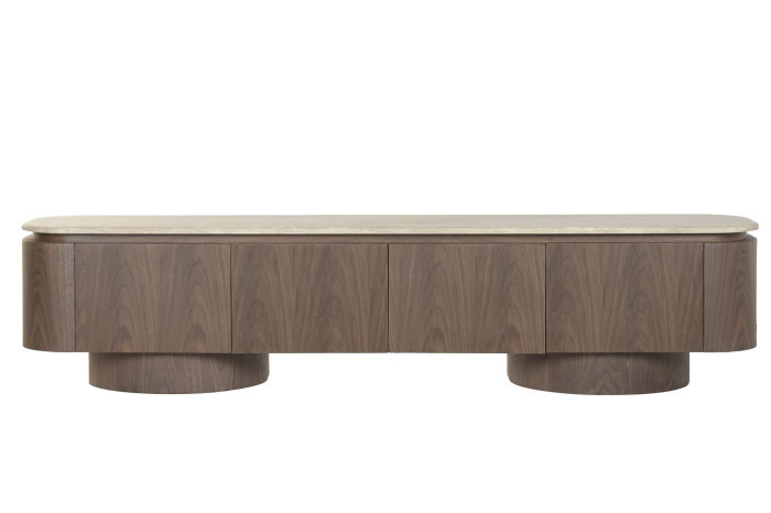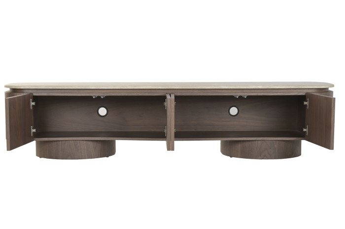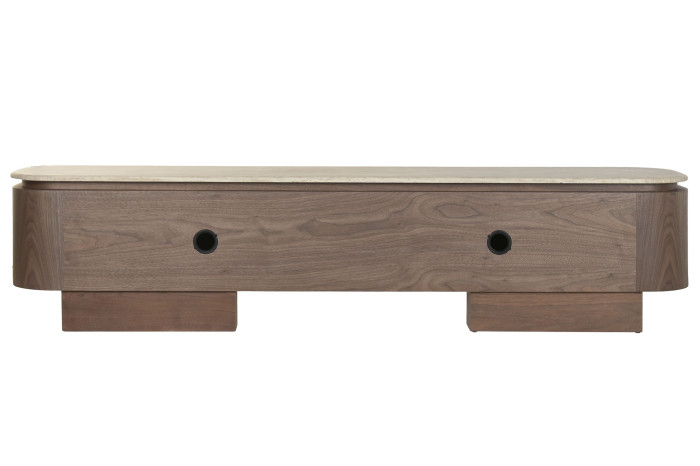 La tapa de granito, resistente y refinada, se integra perfectamente con el cuerpo del mueble, creando un contraste sutil y equilibrado. Su estructura frontal, compuesta por paneles lisos y continuos, ofrece un aspecto minimalista que oculta un amplio espacio de almacenaje ideal para equipos multimedia, accesorios y objetos del hogar.