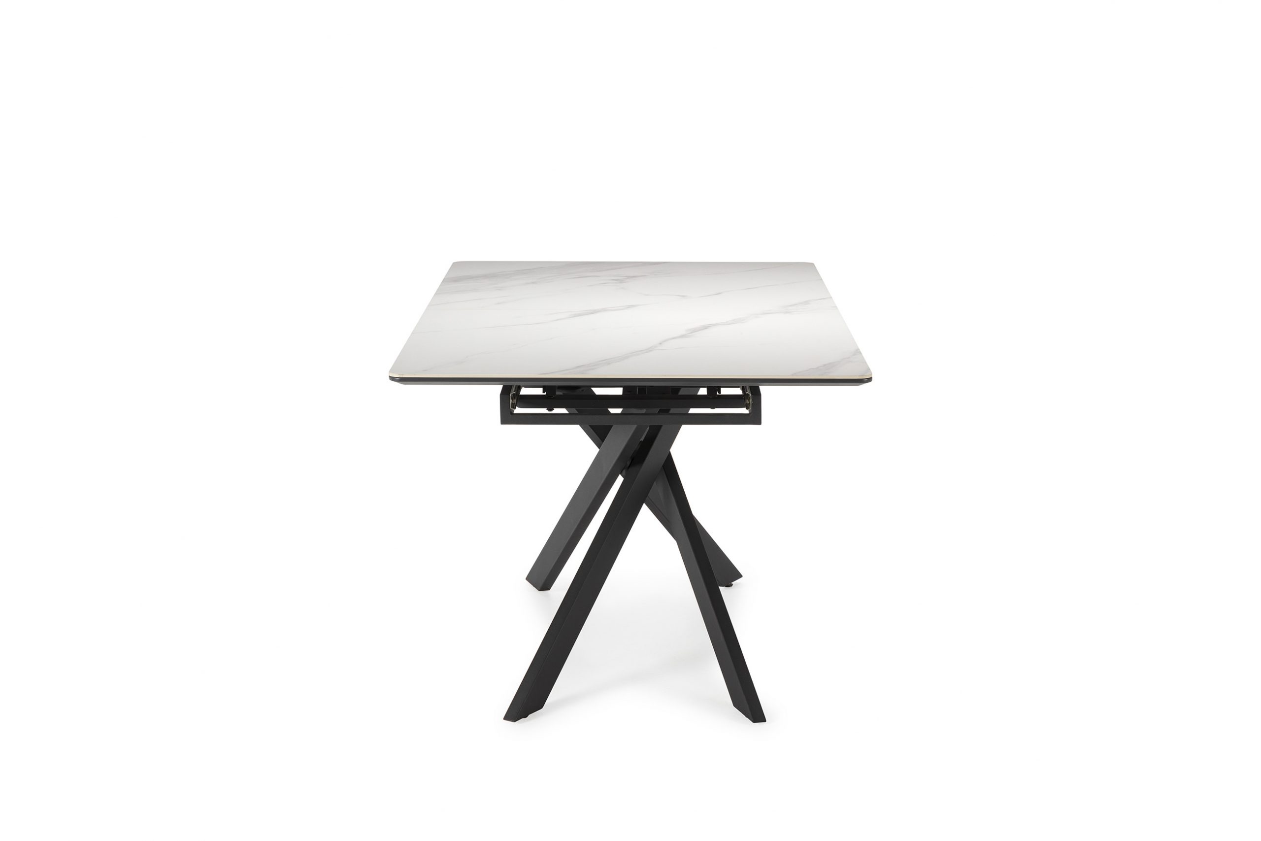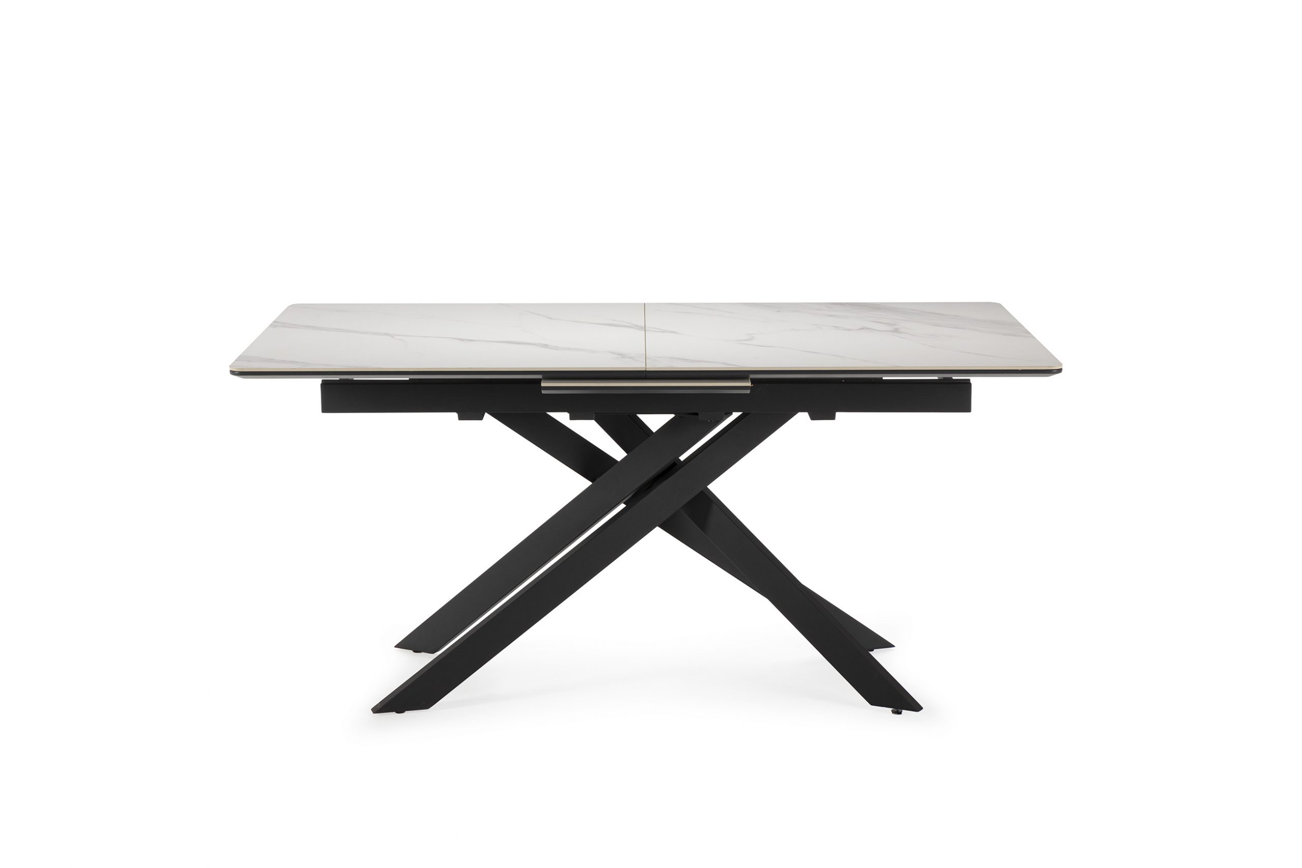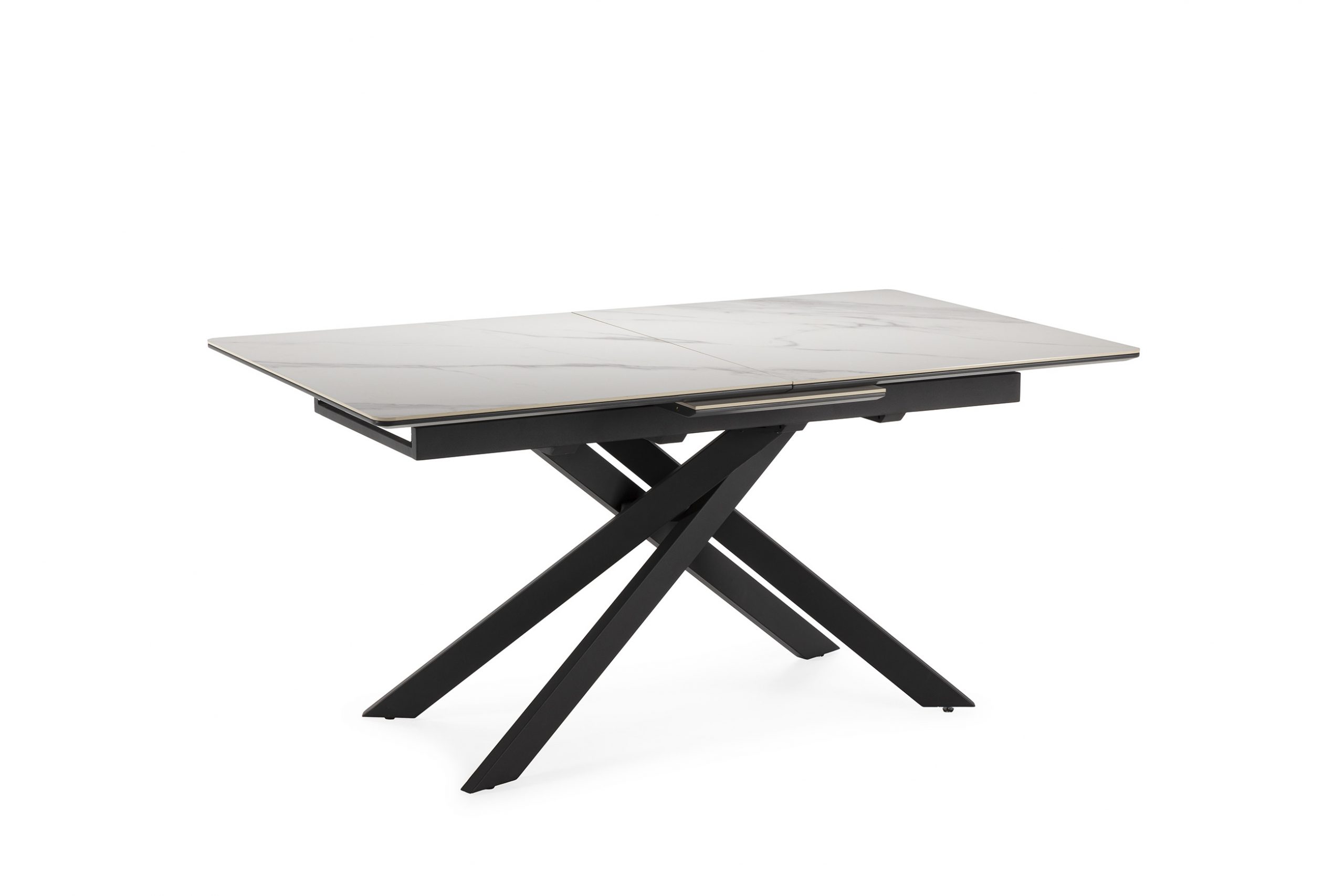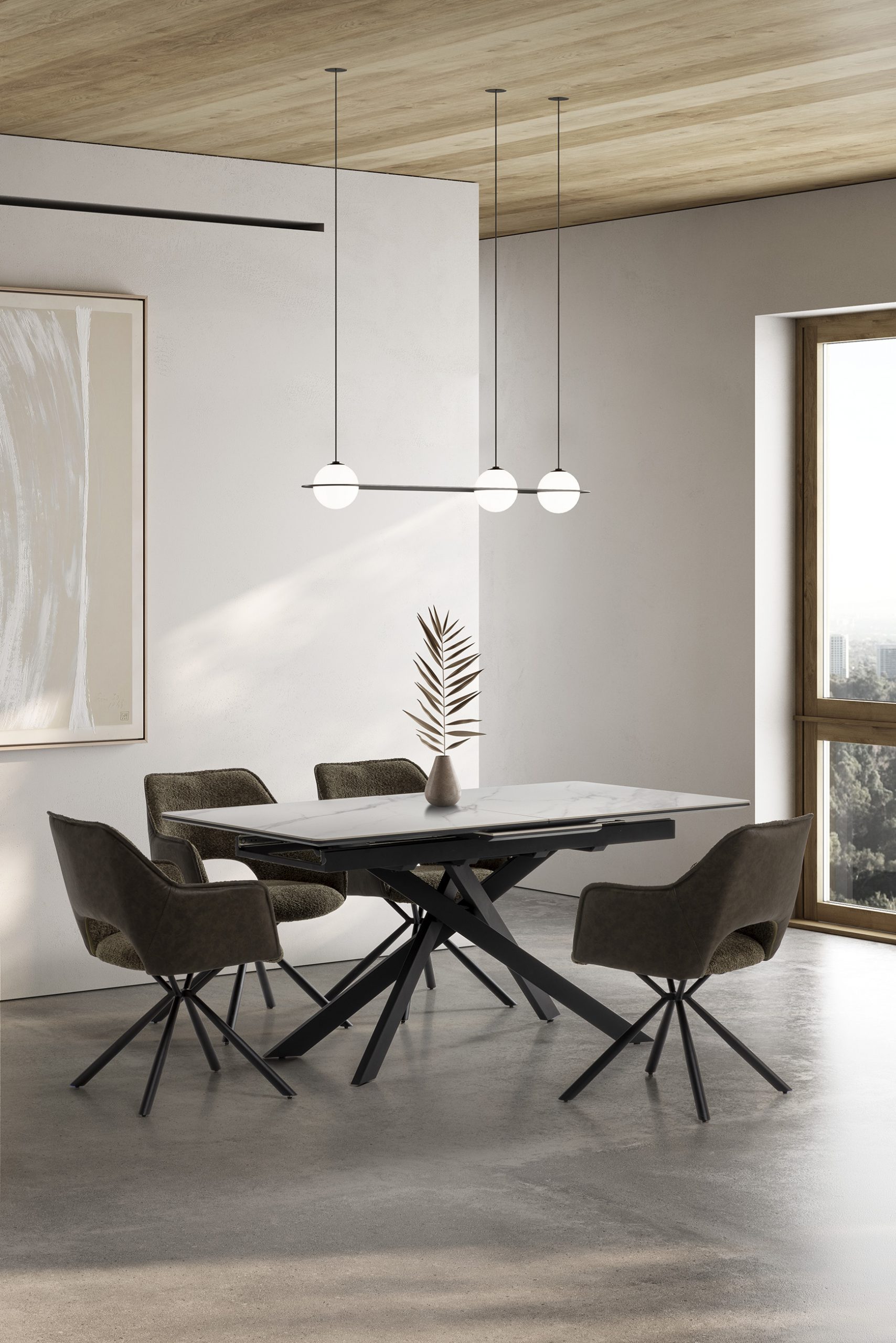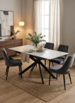 Esta mesa personifica el minimalismo funcional. Su tablero está revestido con cerámica blanco mate de alta resistencia, ofreciendo una superficie elegante, práctica y duradera, inmune a arañazos y manchas. El diseño es puramente contemporáneo, con líneas limpias y una base estable y moderna que complementa perfectamente la ligereza del sobre cerámico.