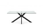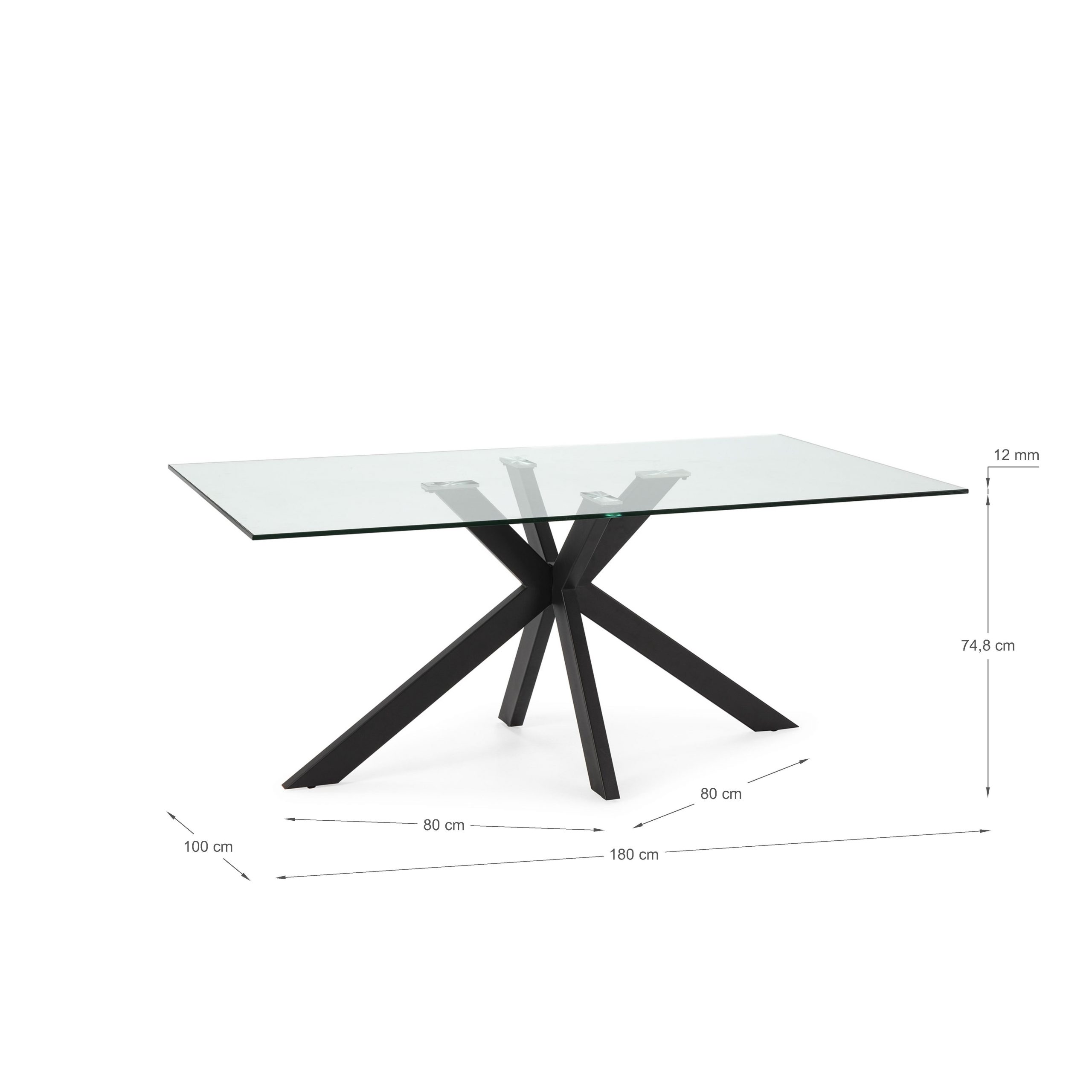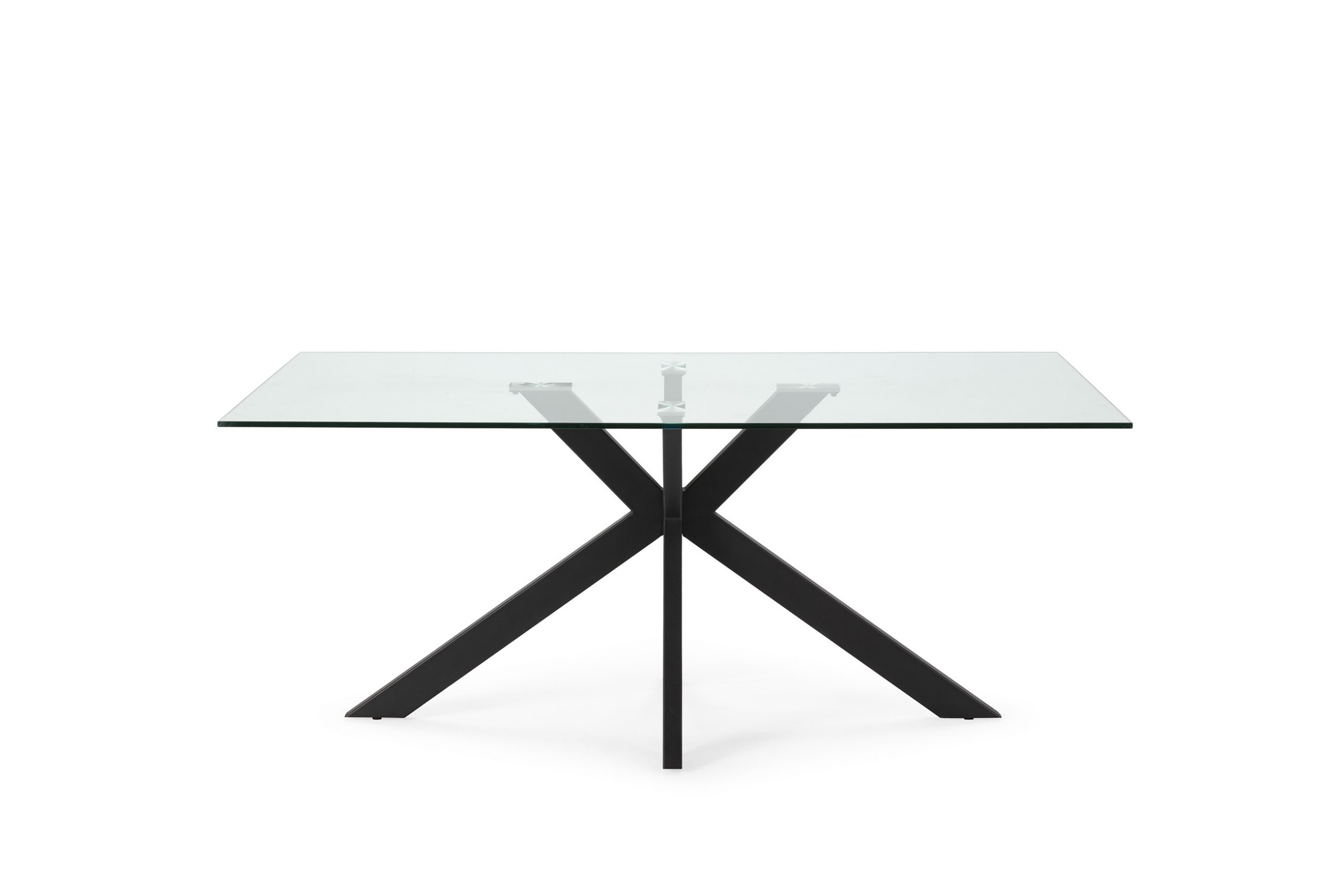La mesa Visa es una pieza central de diseño que combina la ligereza visual del cristal templado con la solidez de una base escultórica de metal. El tablero rectangular, de 180 cm de largo, ofrece un amplio espacio para reuniones y comidas, manteniendo siempre una sensación de amplitud gracias a su transparencia.